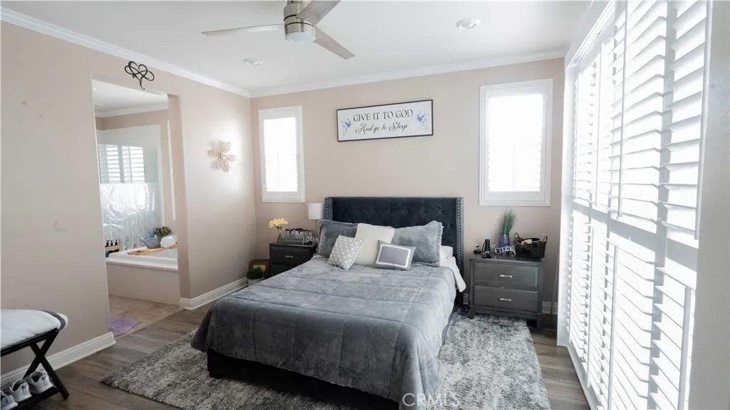 Welcome to this gorgeous senior gated community home (55+ years old) in Santa Clarita. This stunning three-bedroom, three-bathroom home offers a perfect blend of elegance, comfort and modern amenities. Crown molding and plantation shutters throughout the residence. This home is the epitome of luxury senior living. The kitchen boasts plenty of cabinet space, a large island with granite countertops and a walk-in pantry. It's a chief's paradise, offering both style and functionality. Attached double car garage with ample of room. The generous master suite is your private sanctuary, featuring a walk-in closet and an en-suite bathroom with a double vanity, soaking tub, and separate shower. Step into your private backyard from your master suite. additionally, the first floor features a guest bedroom and full bathroom. Enjoy your evenings in your private backyard with turf area, fruit trees. The second floor features a bedroom, bathroom and a large loft. Appliances included: dishwasher, microwave and washer and dryer. Central AC/ heater, ring doorbell, solar and tank-less water heater. Amenities: clubhouse, outdoor BBQ, entertaining area, pool, spa, and fitness center. It also has guest parking. The home is close to SVC Senior center, shopping, restaurants, and park. Schedule a viewing today.