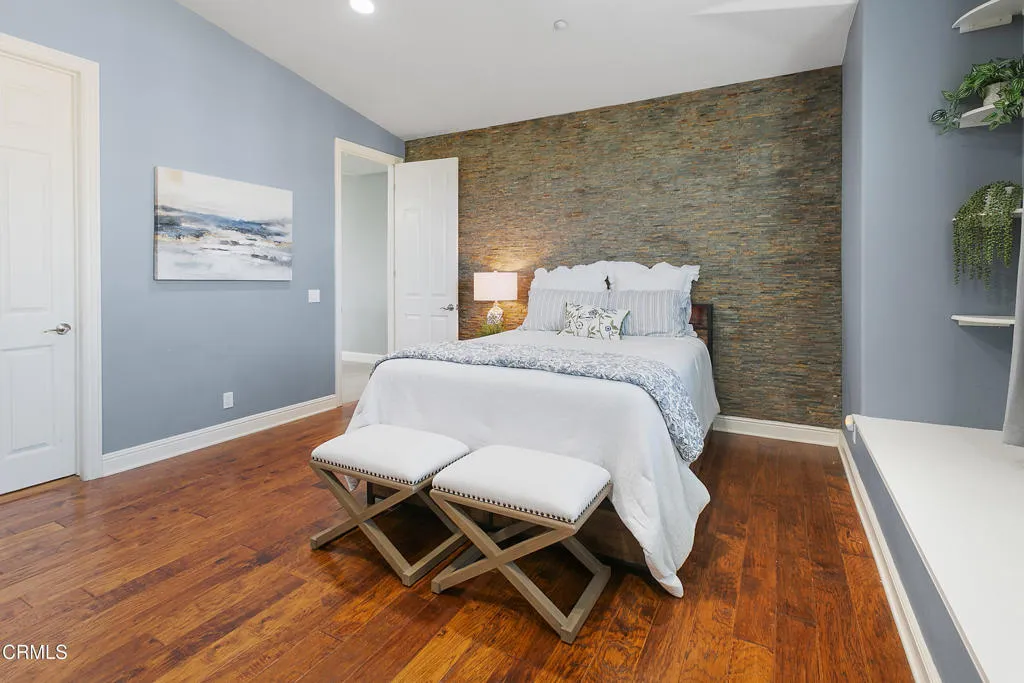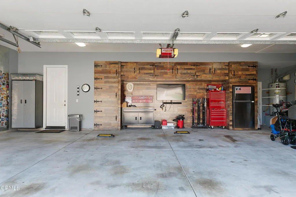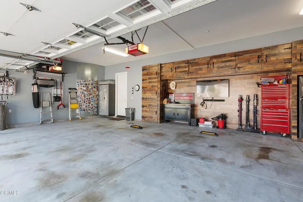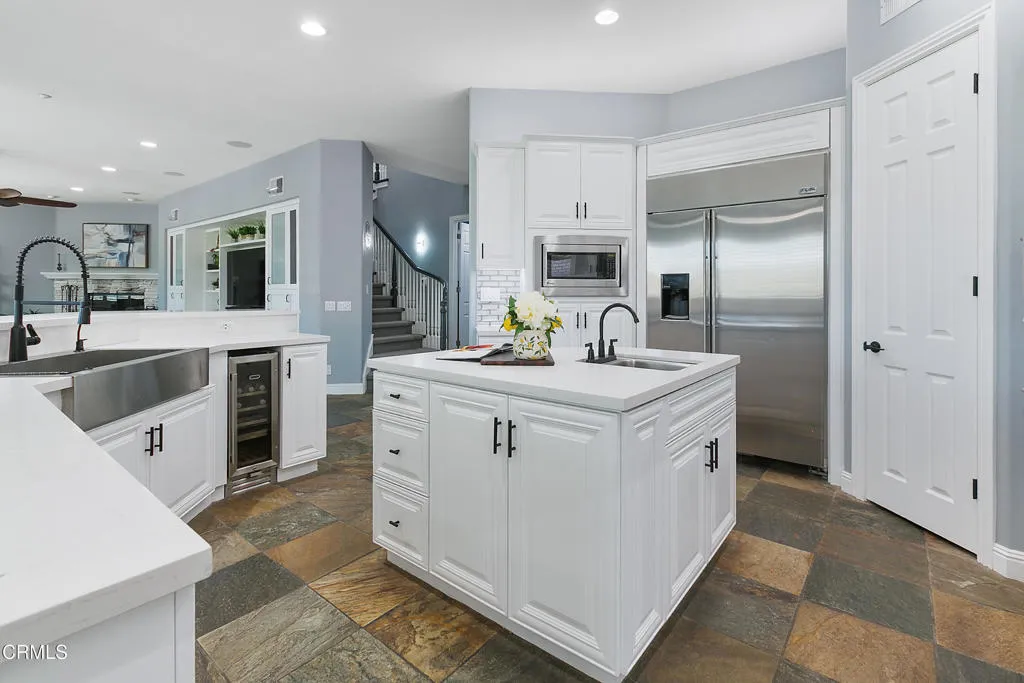 Nestled in the foothills of Moorpark Country Club within the prestigious gated community of Moorpark Country Club Estates, seamlessly combines elegance, comfort, and resort-style living. Breathtaking mountain views and overlooking a scenic 27-hole championship golf course, this beautifully remodeled, move-in-ready home offers the ultimate in luxury and lifestyle. Step into an impressive foyer highlighted by soaring ceilings and a sweeping staircase that sets the tone for the home's refined design. The formal living and dining rooms are perfectly scaled for intimate gatherings and are enhanced by picturesque yard views that create a warm and inviting atmosphere. Adjacent to a charming breakfast nook and spacious breakfast bar, the fully remodeled kitchen showcases sleek quartz countertops, modern custom cabinetry, high-end appliances, abundant counter space, and designer finishes throughout. Thoughtfully designed for both functionality and style, the kitchen opens seamlessly to the family room, complete with beautifully crafted built-in entertainment and bar cabinetry, creating an ideal setting for both everyday living and entertaining. The flexible floor plan features a convenient downstairs bedroom with en-suite bath, ideal for guests or multigenerational living. A secondary staircase provides convenient access to the upper level, where three additional bedrooms each offer private en-suite baths, along with a luxurious junior suite and an impressive primary suite featuring expansive windows that flood the space with natural light. With five spacious bedrooms and five and one-half remodeled bathrooms, comfort and sophistication are evident at every turn. Resort-inspired outdoor living elevates this property to another level, featuring a sparkling in-ground swim spa, expansive 15-person fire pit, newly poured driveway with RV parking, and an electric vehicle hookup. There is ample space to add a sport court or full-sized pool. A whole-home generator provides added peace of mind, and the garage includes custom built-in cabinetry for exceptional storage. Fresh interior paint, plantation shutters, fully remodeled bathrooms, and curated designer touches throughout complete this exceptional offering.