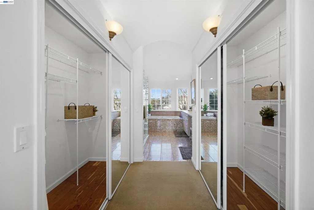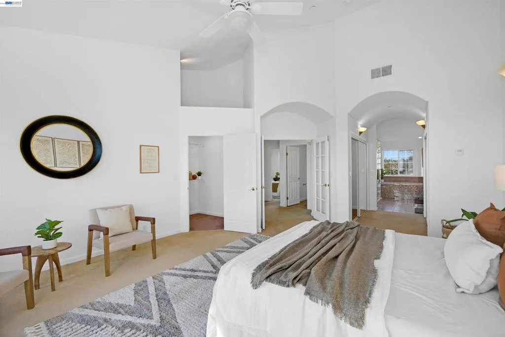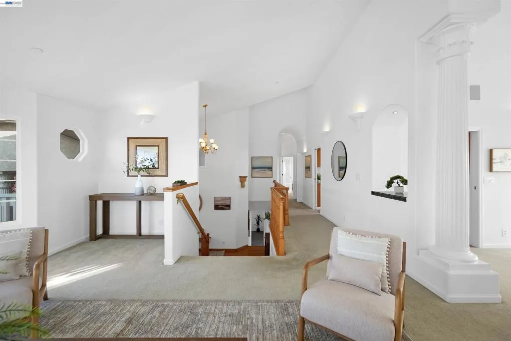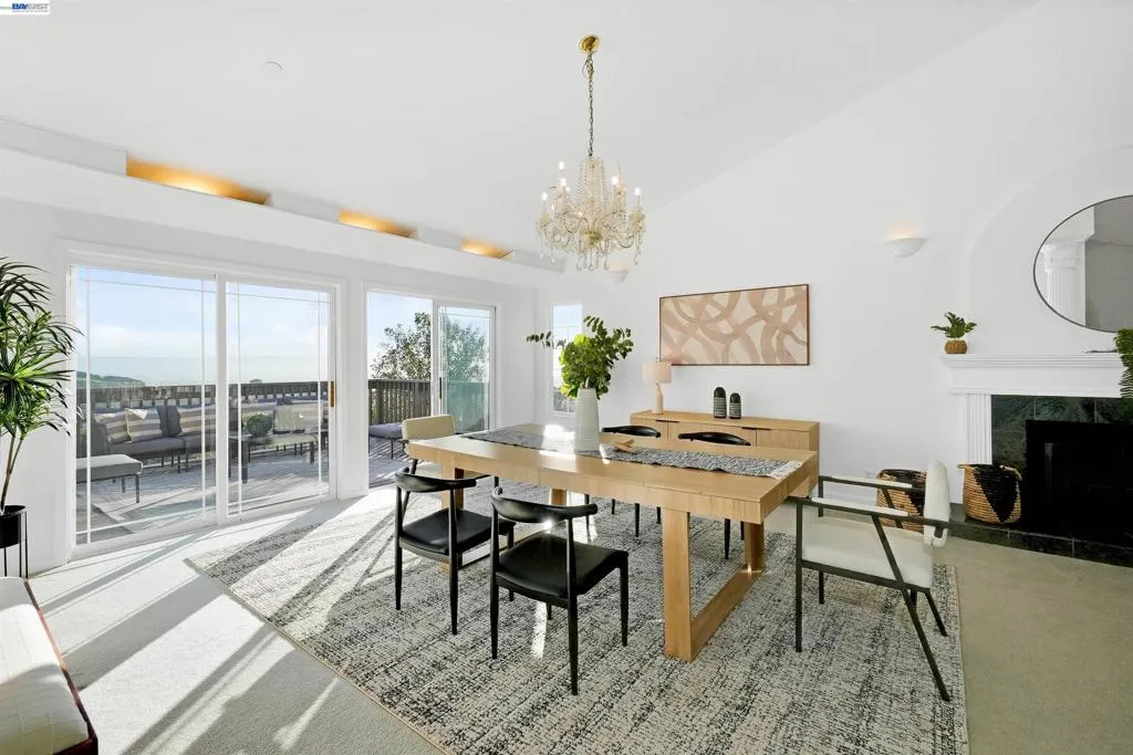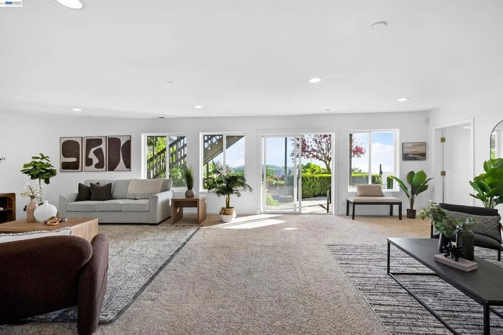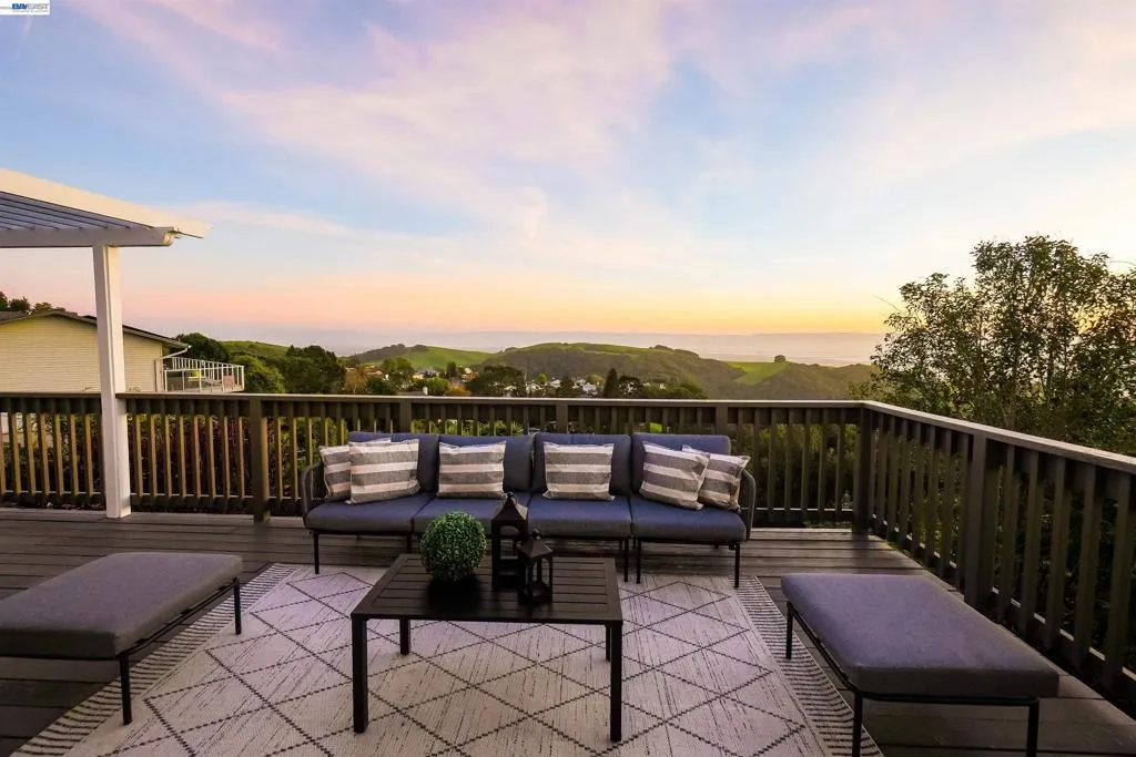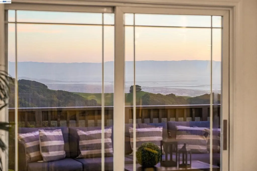 Experience elevated living in this Hayward Hills sanctuary, where panoramic Bay and hillside views steal the show from nearly every room. Built in 1998, this rare dual primary suite design one on each level blends luxury and flexibility to suit a variety of lifestyles. The oversized kitchen is a true centerpiece, featuring a large center island, high end electric appliances, and generous cabinet and counter space perfect for both everyday living and entertaining. Soaring vaulted ceilings and a bright, open layout create seamless indoor-outdoor flow to the spacious, south-facing deck that captures year round sunsets. Upstairs, the expansive primary suite includes a walk-in closet plus additional closet space, while a second bedroom sits conveniently across the hall. Downstairs, you'll find the second primary suite, two additional bedrooms, and a third full bathroom an ideal setup for guests, extended family, or a home office. The 1/3-acre private yard offers mature landscaping, fruit trees, and smart irrigated veggie beds. Smart, sustainable upgrades abound: a 9.6kW solar system with Tesla Powerwall backup (no PG&E bills!), a premium 50-year roof, and fully electric appliances throughout. Modern efficiency meets timeless serenity with this one of a kind hillside retreat.