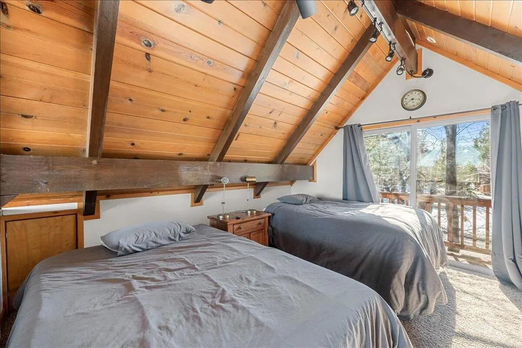 Experience the best of Moonridge in this quintessential 2-bedroom, 1-bath mountain cabin. Perfectly located near Bear Mountain Resort, the Alpine Zoo, and the newly renovated Moonridge corridor, this turnkey home is an ideal four season retreat or investment property. The interior features an open concept great room with soaring vaulted wood beam ceilings, a classic rock fireplace, and large windows offering serene forest views. The functional kitchen includes a breakfast bar for easy entertaining. The layout provides a main floor bedroom and full bath, complemented by a spacious upstairs loft serving as a second bedroom. Outside, a large rear deck provides a peaceful space to enjoy the treed lot and mountain air. Additional features include level entry & ample off street parking. Offered fully furnished and ready for immediate use.