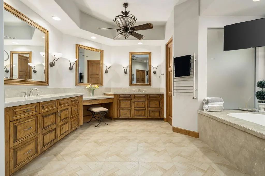 Set within the exclusive Canyon View Estates at Ironwood Country Club, this remarkable fairway estate is a masterful expression of architectural sophistication, modern innovation, and refined desert luxury. Perfectly positioned along the 16th fairway, the residence captures breathtaking mountain views and tranquil water feature views, creating an extraordinary backdrop for elevated living. A grand living room with soaring wood-beamed vaulted ceilings and a statement fireplace sets a dramatic yet inviting tone. Four spacious en-suite bedrooms provide comfort and privacy, with the primary suite serving as a peaceful retreat. The saltwater pool and spa showcase elegant deck jets, customizable LED lighting, fountain accents. Four en-suite bedrooms offer privacy and comfort.The outdoor kitchen is tailored for upscale entertaining, while inside, dual 100-bottle wine refrigerators and a stunning illuminated onyx bar provide a sophisticated setting for intimate gatherings or grand celebrations.The chef's kitchen is both impressive and functional, appointed with premium stainless steel appliances. An exceptional opportunity to enjoy luxury living in one of Ironwood's most desirable communities.