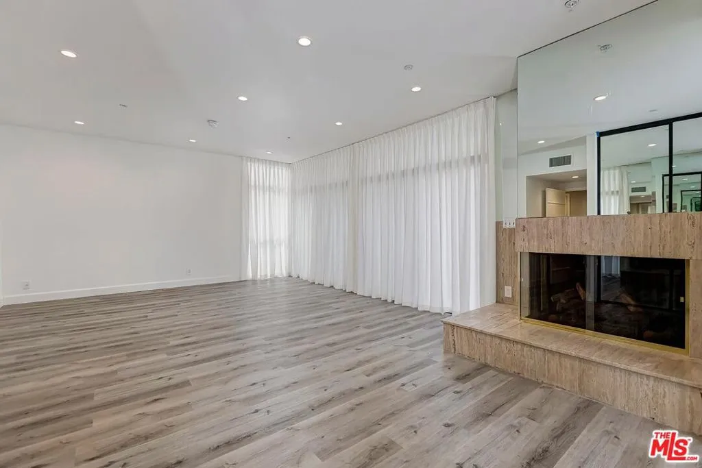 Contemporary condominium located on a beautiful, tree-lined street north of Burton Way in prestigious Beverly Hills. This updated 3 bedroom, 2.5 bath unit is filled with natural light and accessed through a dramatic black and white tiled formal entry with a private elevator. Thoughtfully designed, the unit features mirrored walls, floor-to-ceiling windows, and a combination of hardwood and marble floors. The expansive living room offers high ceilings, serene treetop views, a large balcony, a wet bar, and a fireplace. The designer kitchen includes a breakfast area, marble countertops and backsplash, dual ovens, a direct trash chute, and stainless steel appliances. A large bonus room maybe used as an office. The spacious primary suite features a fireplace, extensive cabinetry, walk-in cedar closets, and a built-in vanity. The en-suite primary bath includes a separate marble shower, a spa tub, and double sinks. The property offers three secure subterranean parking spaces. By appointment only. No sign on the property.