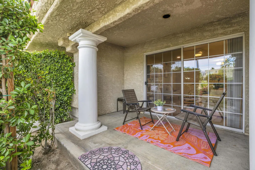 MAJOR PRICE IMPROVEMENT AND PRICED TO SELL!! Best value in sought-after South Palm Springs! Located in highly desirable south Palm Springs--away from airport traffic and wind--this freshly remodeled two-bedroom, two-bath condo sits in the charming, snowbird-friendly community of Esprit. Recently painted in a soothing palette of light beige and white, the home features updated recessed LED lighting with dimmers, a sleek new living-room ceiling fan, and a timeless dining fixture.The custom two-toned fully redone kitchen is both stylish and functional, offering soft-close shaker cabinets with pullouts, brand-new never-used LG ThinQ stainless appliances, white quartz counters with silver specks, an expanded waterfall-edge breakfast bar, and a marble backsplash.The open floor plan maximizes space, with two well-sized ensuite bedrooms. The primary bathroom includes a new vanity with quartz counters and plenty of storage while the guest bathroom has dual sinks, updated faucets, new shower head and glass shower door. Throughout the home, new white horizontal and vertical blinds add a clean, modern touch.Enjoy two patios--one off the living room and another off the primary bedroom. The neutral beige tile flooring runs seamlessly throughout the unit. Tucked quietly at the back of the community, this ground-level corner end unit offers exceptional privacy with no shared walls.Sold partially furnished with a well-stocked kitchen, this move-in-ready home makes it easy to settle in and start enjoying everything Esprit and Palm Springs have to offer.