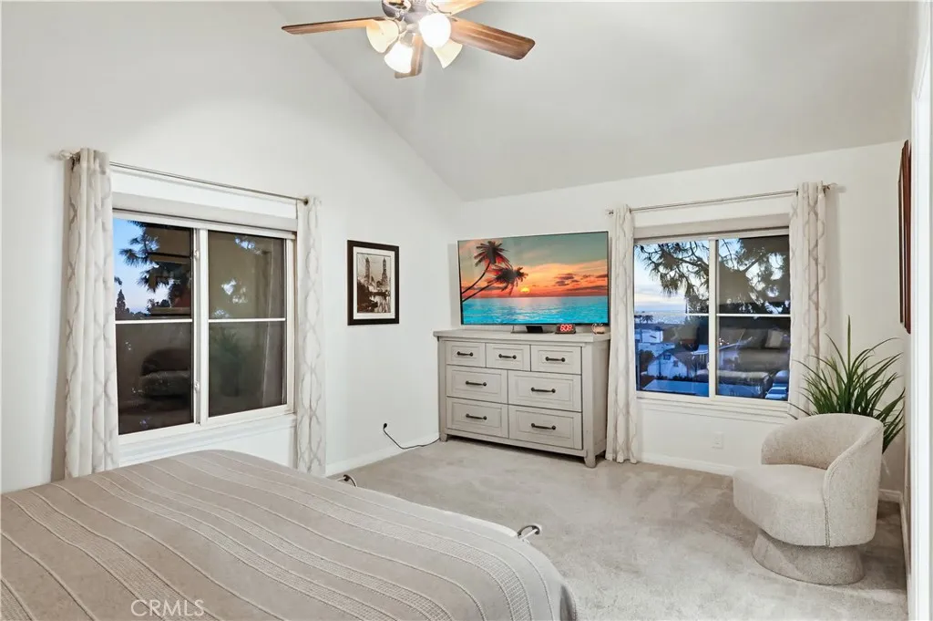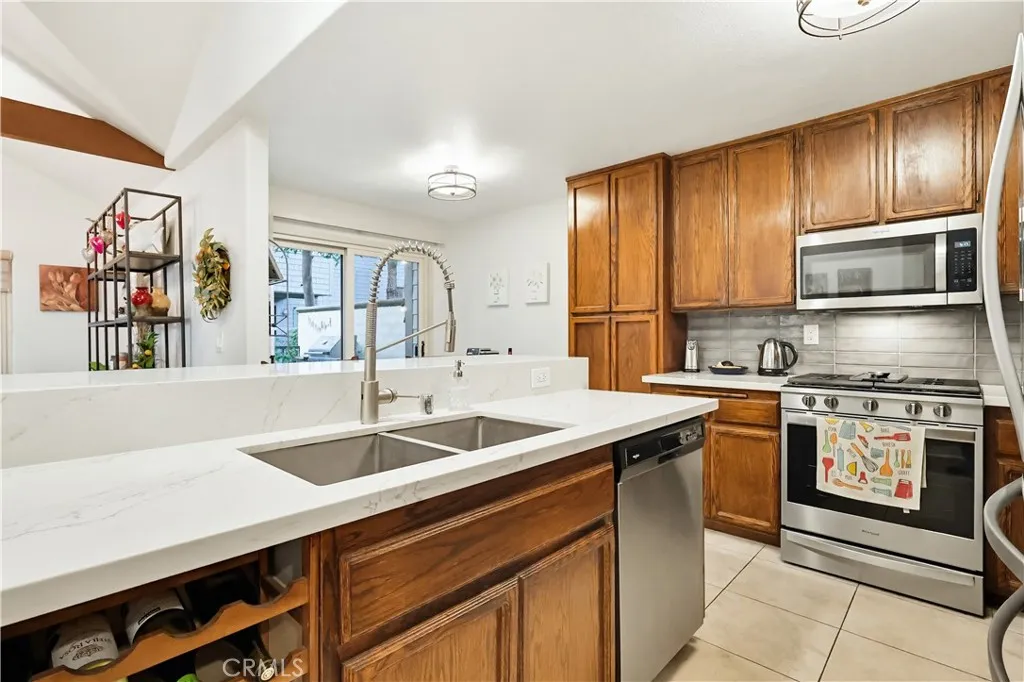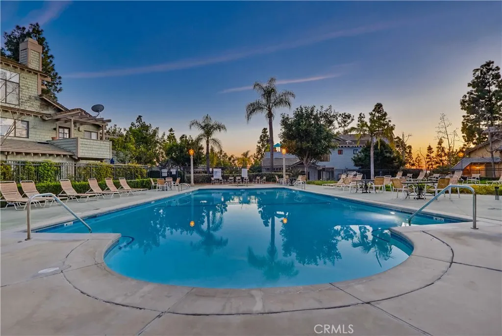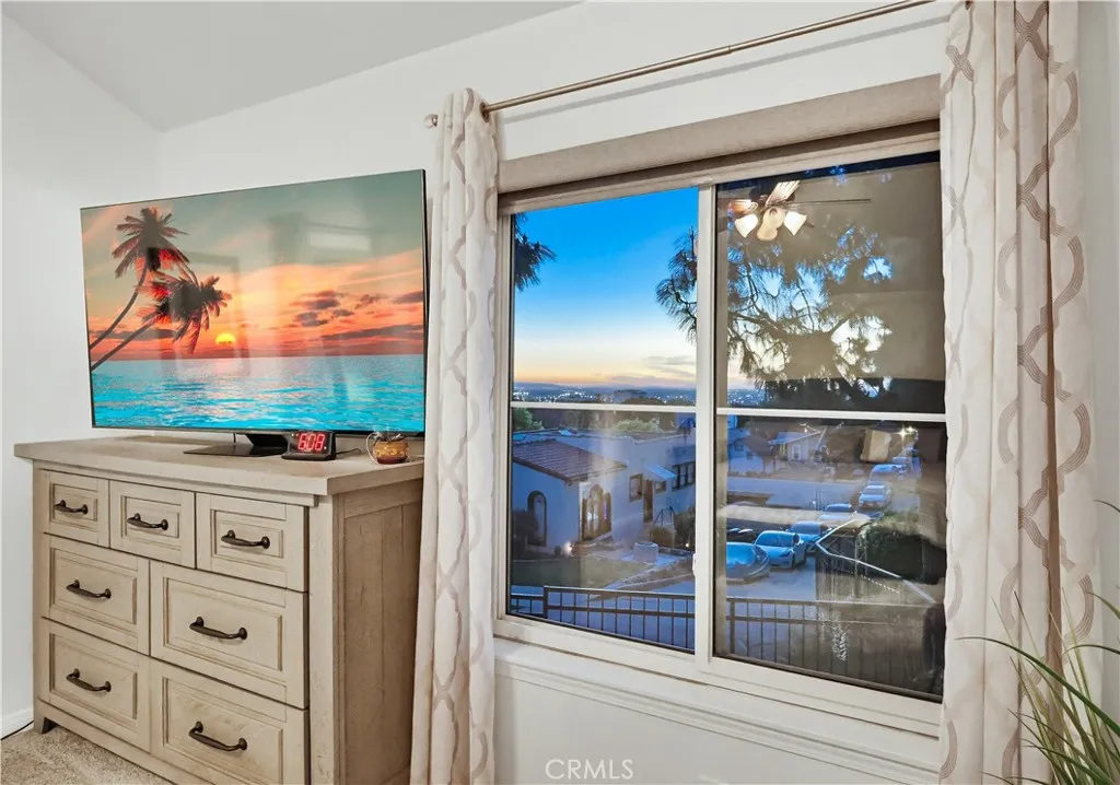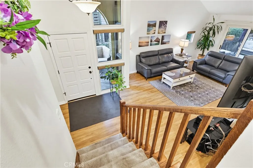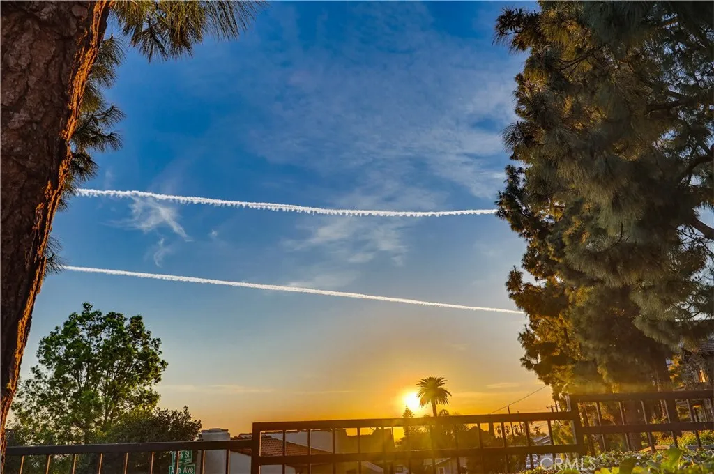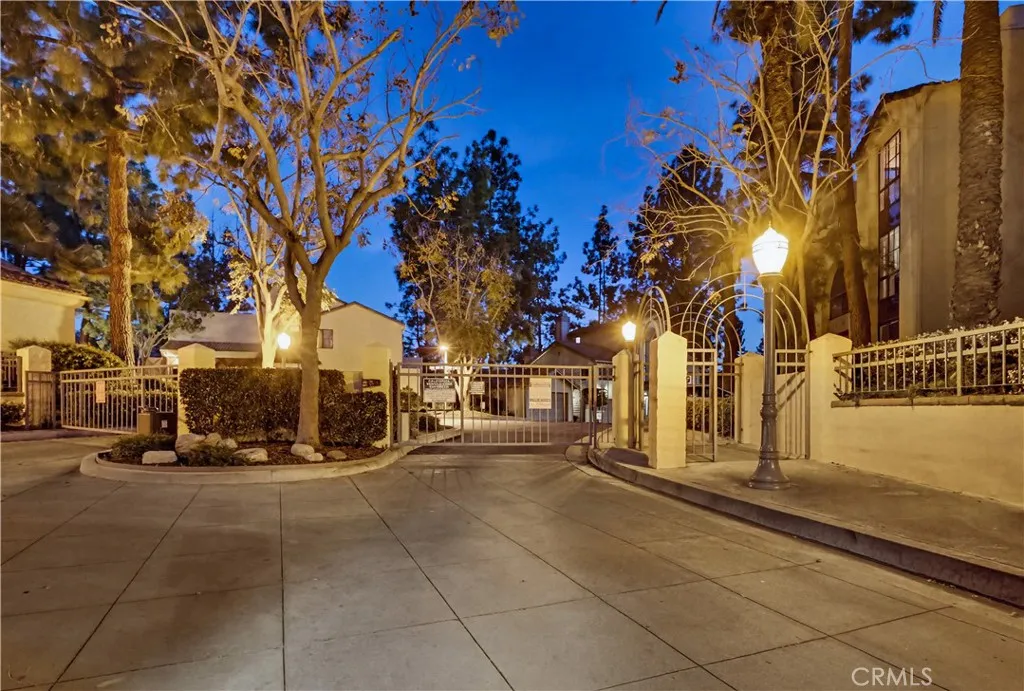 This beautifully maintained 2-bedroom, 2-bath split-level view home offers 1,356 square feet of comfortable living in a desirable gated community — now featuring a brand new HVAC system. Cathedral ceilings in both the living room and primary bedroom create an open, airy feel, while the west-facing orientation delivers breathtaking sunsets and sparkling city-light views each evening. The inviting living room features a cozy gas fireplace with modern glass rock accents, perfect for relaxing at the end of the day. The updated kitchen includes quartz countertops, stainless steel appliances, tile flooring, and custom window coverings. Warm wood flooring runs through the main living areas, with soft carpet in the bedrooms for comfort. The spacious primary suite offers a Jacuzzi soaking tub and separate walk-in shower, creating a relaxing retreat. A second full bathroom provides flexibility for guests or family. Additional highlights include indoor laundry, a 2-car attached garage with extra storage, and a full-size private patio (not a balcony) with direct gate access to the pool and walkway. Set among mature pine trees and beautifully landscaped grounds, the community offers a pool, two spas, ample guest parking, and nightly security patrol, creating a peaceful resort-like environment. Views, comfort, and convenience — all in one exceptional home.