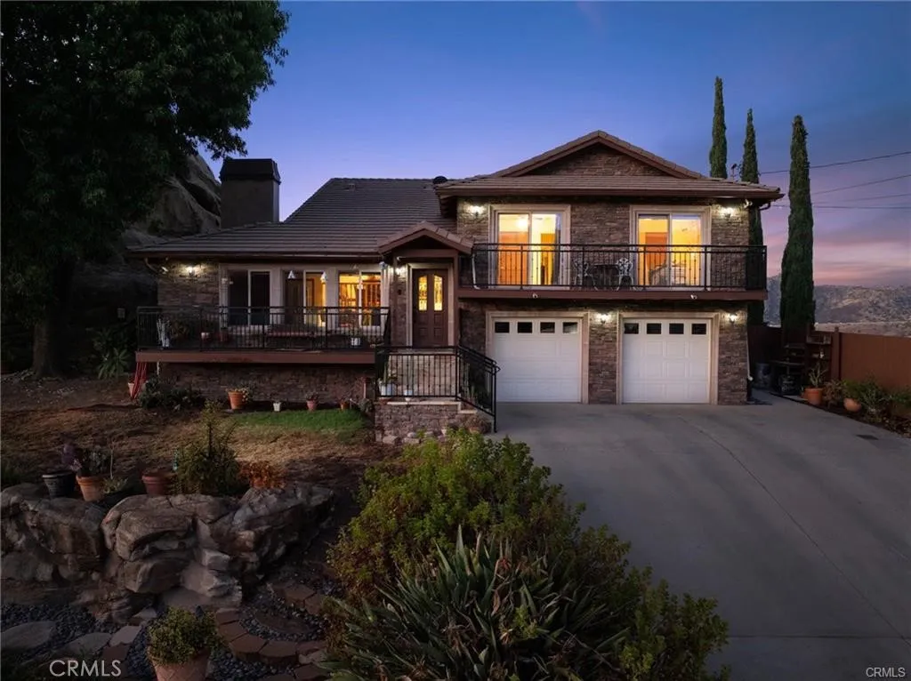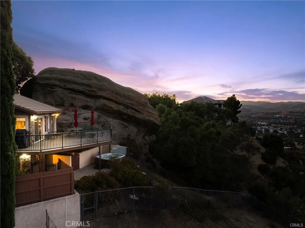 Warm and Welcoming Santa Susana Knolls Custom Home with Magnificent Views! This beautiful and unique custom home was designed to maximize breathtaking views atop the charming Santa Susana Knolls neighborhood. Enter into a light & bright living room graced by a rustic fireplace and views to the dining room, gourmet kitchen and family room beyond. A secluded sitting area, shaded by the majestic boulder, offers a peaceful & meditative moment to relax and unwind. The remodeled kitchen is a chef’s dream with stainless appliances including an oversized gas range, 2 ovens, refrigerator, trash compactor, microwave, wine refrigerator and warming drawer. Granite counters, pendant lights, a custom backsplash and lovely garden window above the sink enhance the beauty of this heart of the home. The large pantry with pullout drawers, self-closing cabinetry with custom designer accents and center island with additional seating add practical benefits enjoyed by all. The den/family room is steps away and offers a wet bar and very flexible space for a home office, media room, game room–you decide! Sliding glass doors welcome you onto the spacious rear deck with the most stunning views in every direction. An ideal location for entertaining guests, the deck offers space for many to sit, dance, or play. The 2 spacious secondary bedrooms each have a charming balcony with superb mountain and sunset views. The hall bath has been remodeled with custom cabinetry, stone counters, dual sinks & soaking tub. The primary suite is located at the end of the hall offering added privacy, a large walk-in closet, remodeled primary bath with an oversized walk-in shower, and serene mountain views. A set of sliding glass doors lead to a private retreat area. Downstairs there is a place that has so many possibilities with separate entry access, full bathroom, open area and an additional room. An ideal in-law suite, maid’s quarters, home office, art studio, library or music room. The laundry room and laundry chute are also downstairs with additional storage. Step outside to a pretty little garden and then around the corner to the bubbling spa and those breathtaking views. Set back from the street, there is an expansive front garden and parking for 9 cars or space for an RV. Though the Susana Knolls is rural with abundant wildlife, you are just minutes from the 118 freeway, train station and Simi Valley dining and shopping.