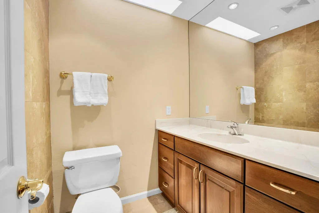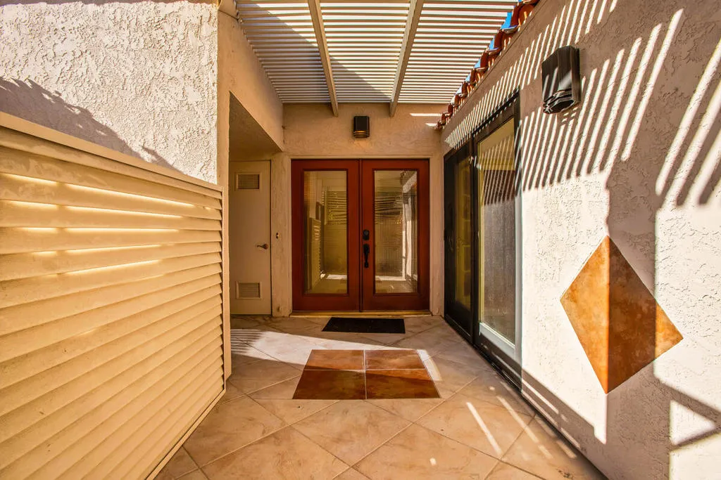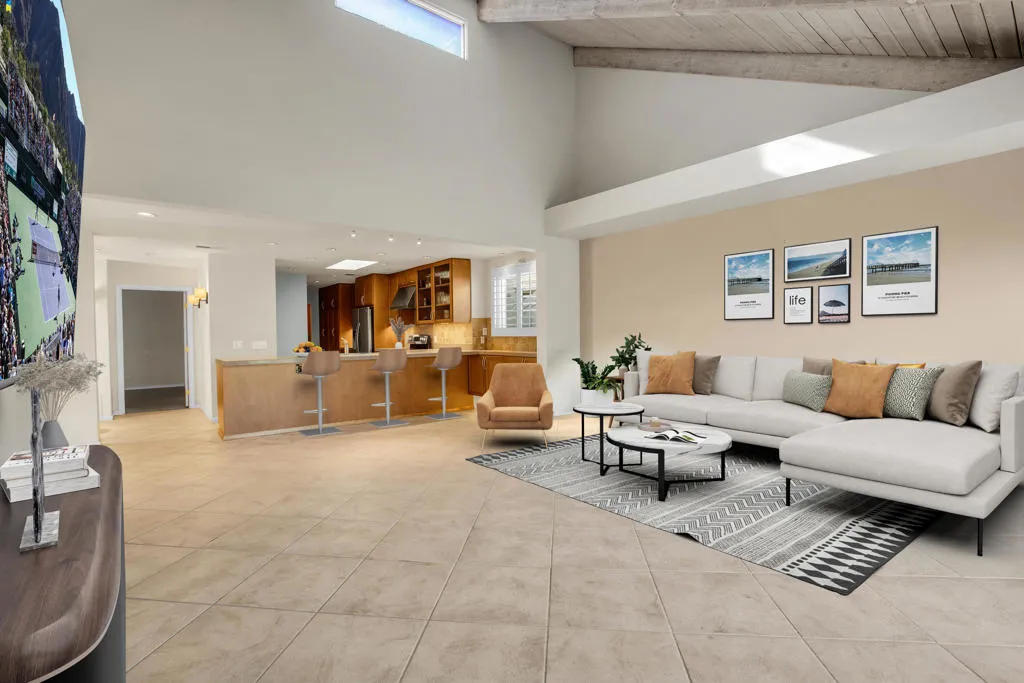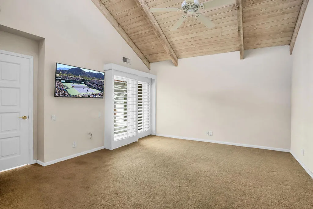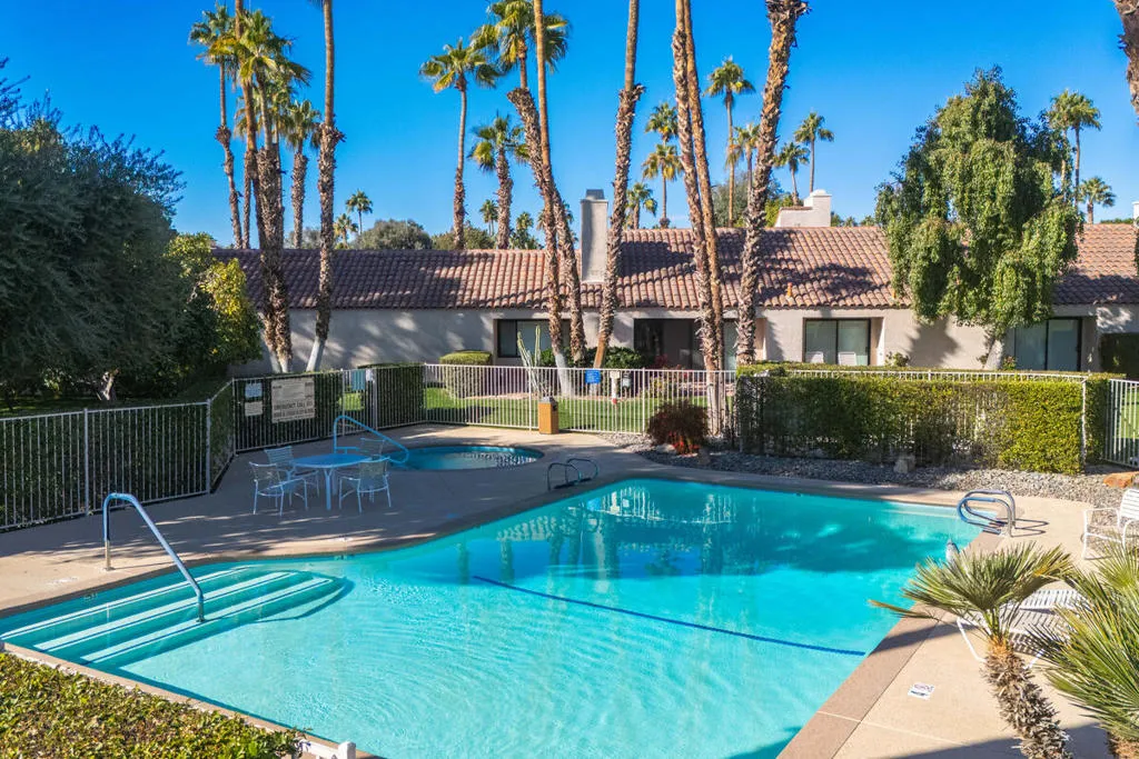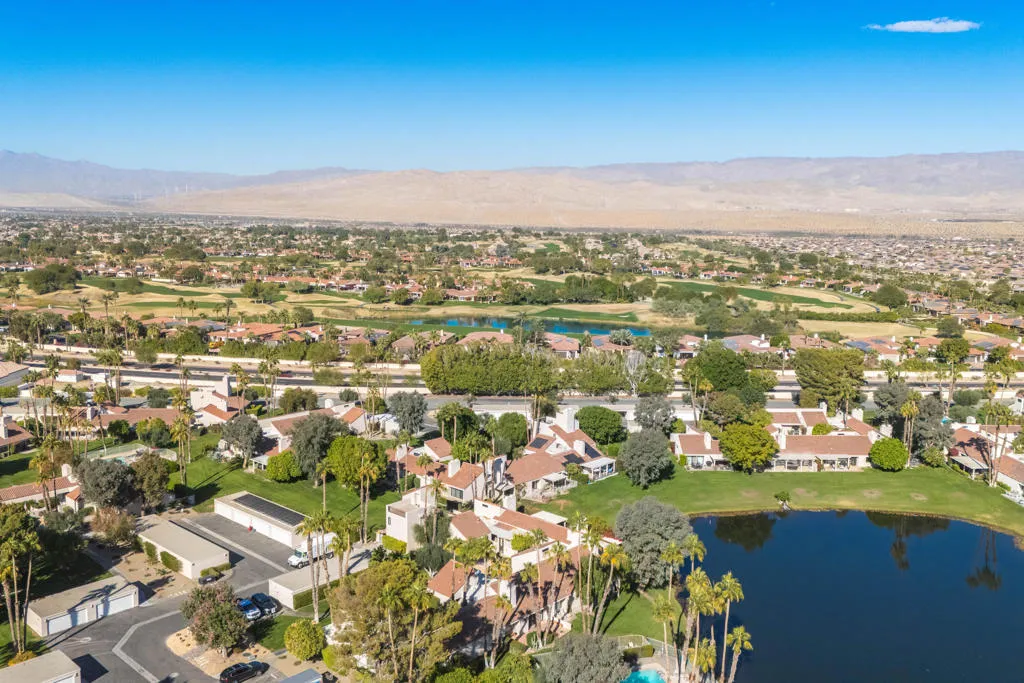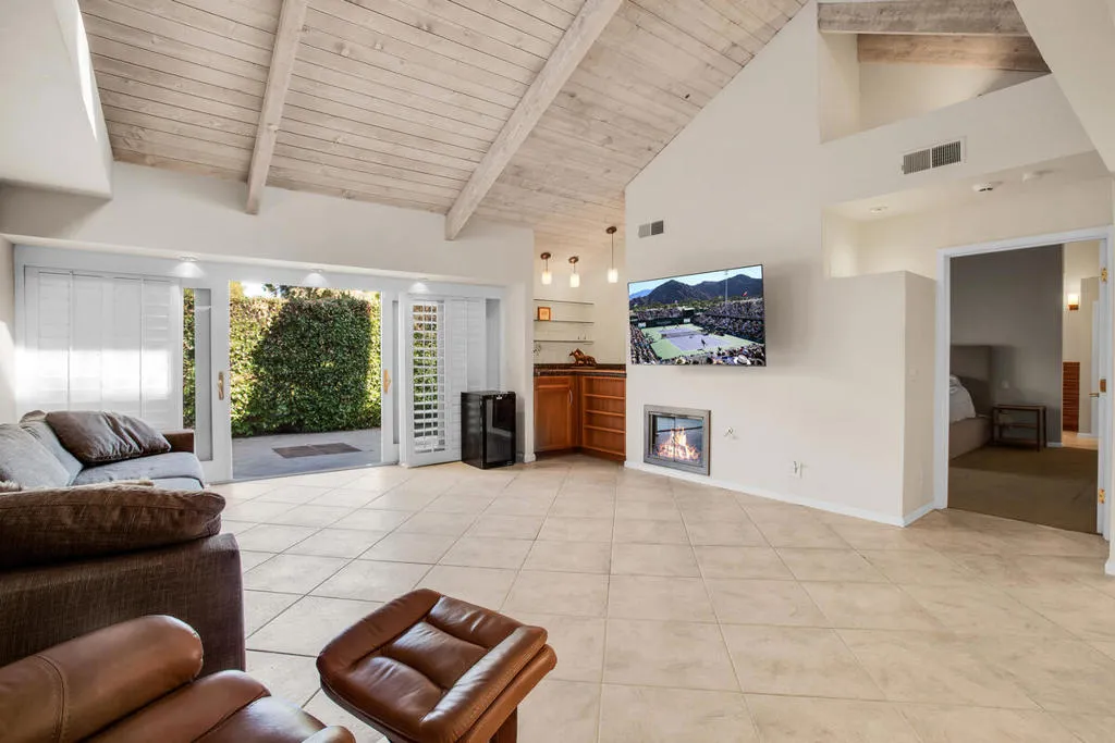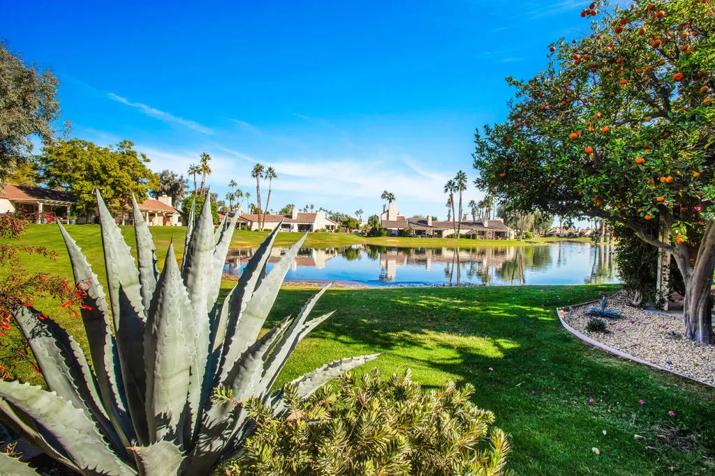 Welcome to this beautiful renovated 2bed/2ba tennis villa plus den, perfectly situated with tranquil lakeside views, ideal for both relaxation and entertaining. This charming home is just steps away from the tennis and pickleball courts. A true haven for active living and serene outdoor enjoyment! Inside, you'll be greeted by an expansive open-concept Great Room, Dining Area, and Kitchen, designed for today's modern lifestyle. The gourmet kitchen is a chef's dream, featuring sleek quartz countertops & stainless steel appliances. The Great Room is highlighted by soaring vaulted wood-beamed ceilings, a cozy fireplace, and a bright dining area that flows seamlessly for easy living and entertaining. The main primary suite has been thoughtfully reconfigured for maximum space and comfort. It includes a luxurious tub & shower, offering a true spa-like experience. The second bedroom suite is a retreat in itself, featuring a spacious walk-in closet and an elegant travertine walk-in shower. This villa is the epitome of refined living, blending timeless design with modern convenience. Don't miss out on the opportunity to own this stunning home. 4 pools & spas in the community and the land lease has been extended thru 2121. Mission Hills Country Club boasts 3 private golf courses, 27 tennis courts, croquet and pickleball courts