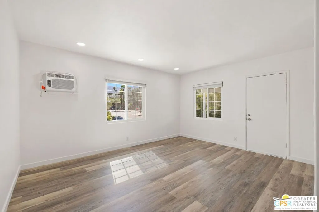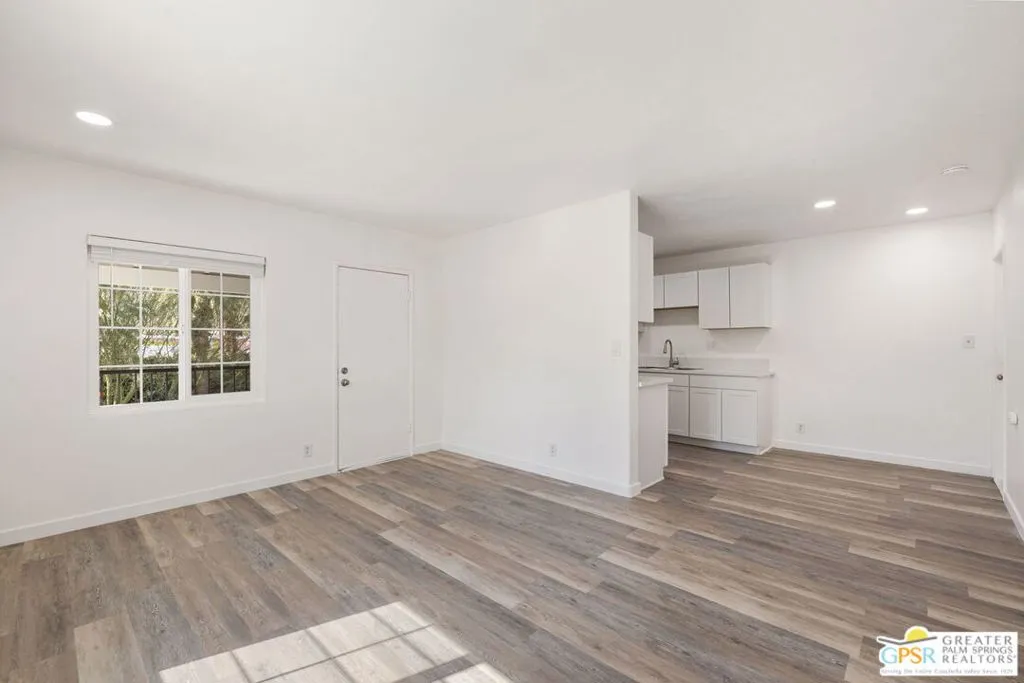Stunning Mountain Views & Fresh Modern Remodel Await at 1674 Via Salida #3. The Premium Palm Springs Perch! Elevated on the second level of a fully gated, secure six-unit community, this beautifully remodeled one-bedroom, one-bathroom apartment boasts the best panoramic views in the complex: sweeping vistas of the San Jacinto Mountains, lush palms, and desert landscape that make every moment feel extraordinary. A full contemporary refresh with premium finishes sets this unit apart, delivering an airy, upscale desert retreat perfect for those who want luxury and elevation. Climb the stairs to your private oasis, where crisp white shaker-style cabinetry, stainless steel appliances (including a gas range and sleek microwave), durable quartz counters, and a deep stainless sink create a bright, functional kitchen open to the living area. Recessed ceiling lights and a neutral palette keep everything light and inviting, while easy-care wood-look plank flooring flows seamlessly throughout. Large windows and sliders bathe the spaces in natural sunlight, with mountain views visible right from the bedroom. The spacious bedroom features a modern ceiling fan, wall AC for personalized comfort, and oversized windows framing those iconic desert peaks and palms. Your daily wake-up view is unbeatable. The updated bathroom offers a walk-in glass shower with a neutral tile surround for a spa-like feel. Step onto your private balcony (accessed via the teal door) to soak in the prime elevated outlook: the community pool sparkling below, surrounded by greenery, with the rugged mountains rising dramatically in the distance. Ideal for morning coffee, sunset drinks, or simply unwinding with the breeze. Enjoy the shared pool for cooling dips, fire up the communal BBQ for casual gatherings, or stargaze under clear desert skies. This peaceful mid-century-inspired community blends tranquility with modern upgrades and unbeatable South Palm Springs convenience. No car needed for essentials! You're steps from Koffi coffee, a quick walk to The Ace Hotel for cocktails and vibes, and close to hiking trails, downtown dining, shopping, and entertainment. This premium second-level one-bedroom at #3 is your elevated desert escape: combining breathtaking mountain and pool views, a complete modern remodel with high-end touches, prime location, inviting amenities, on-site laundry, and that special second-floor advantage that makes it the standout choice. All prospective tenants must complete and submit an application via Zillow to confirm qualifications before any showings will take place.
