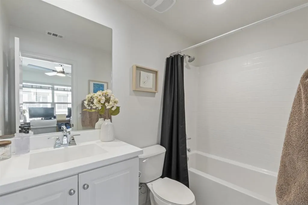 This beautifully upgraded residence offers the perfect blend of comfort, style, and convenience. Step inside to an open and bright floor plan featuring recessed lighting, upgraded flooring, and plush newer carpet throughout. The modern kitchen is designed for both everyday living and entertaining, complete with upgraded appliances, ample cabinetry, and countertop seating that flows seamlessly into the main living area. A convenient downstairs half bathroom adds extra functionality for guests. Upstairs, each spacious bedroom offers its own private full bathroom — ideal for guests, roommates, or family members seeking extra privacy. Ceiling fans in the bedrooms provide added comfort year-round, and the upstairs laundry room adds everyday convenience right where you need it. Enjoy indoor-outdoor living on your covered balcony — perfect for morning coffee or relaxing evenings. The attached two-car garage features durable epoxy flooring, offering both functionality and a clean, polished look. This home also includes paid solar, providing potential energy efficiency and long-term savings. Residents enjoy access to beautifully maintained community amenities, including a sparkling pool and inviting playground area. Don’t miss the opportunity to make 959 Slate your next home!