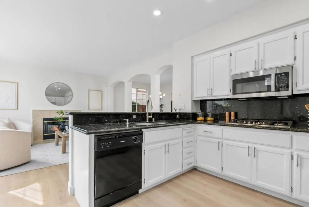 Beautifully updated single-family home in the desirable Mission Park community featuring a highly sought-after main-level bedroom and full bath ideal for guests, multigenerational living, or a private home office. Brand-new laminate flooring runs throughout, complemented by modern chandeliers and a light-filled layout with soaring ceilings. A stunning arched opening between the formal dining area and family room adds timeless architectural character while maintaining an open flow. The refreshed kitchen showcases granite countertops and stainless steel appliances, including a double oven, and connects seamlessly to the cozy family room with fireplace and backyard access. Upstairs, the spacious primary suite includes an attached retreat perfect for an office, nursery, lounge, or potential additional bedroom conversion. Private backyard offers a paved patio and brand-new lawn for easy outdoor enjoyment. Short walk to the community pool and Fuller Park, minutes to Rivermark Plaza, Whole Foods, Nvidia, Intel, Oracle, Google and other major tech employers, and walking distance to Levis Stadium. Move-in ready with flexibility, comfort, and convenience.