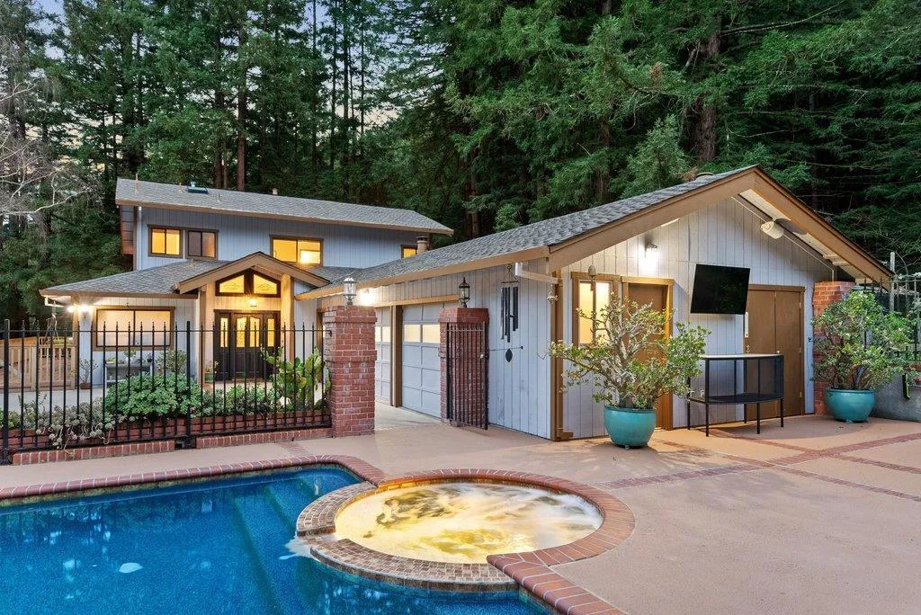 Located in the desirable Soquel Hills, 350 Aurora Road offers exceptional privacy, abundant sunshine, and mature redwood stands on 1.286 acres. This 3,183 sq ft home is thoughtfully designed to capture natural light and peaceful views, creating an ideal balance of comfort, functionality, and indooroutdoor living. The kitchen is a standout, featuring leather-finished granite countertops, high-end stainless steel appliances, generous cabinetry and workspace, a convenient pantry, and sweeping valley views. The spacious floor plan is well suited for everyday living and entertaining, with a large dining area off the kitchen, a welcoming living room at the entry, and a family room that doubles as a home theater with 7.1 surround sound and screen/projector, all included. The primary suite offers a walk-in closet and a spa-like bath with dual vanities, a side-jet shower, and a skylight. Outdoor spaces include a wraparound deck, a sun-filled pool with patio, and a fenced garden with raised beds. Additional features include a three-car garage, extensive storage, and ample guest parking. Convenient access to Silicon Valley, Santa Cruz, Scotts Valley, and Soquel.