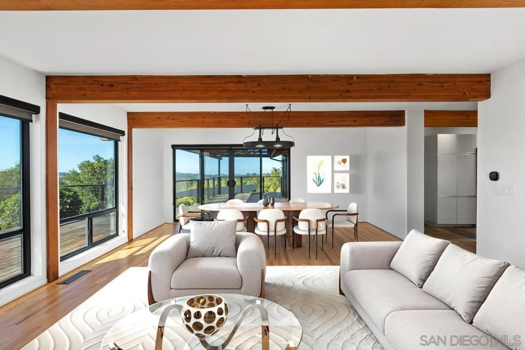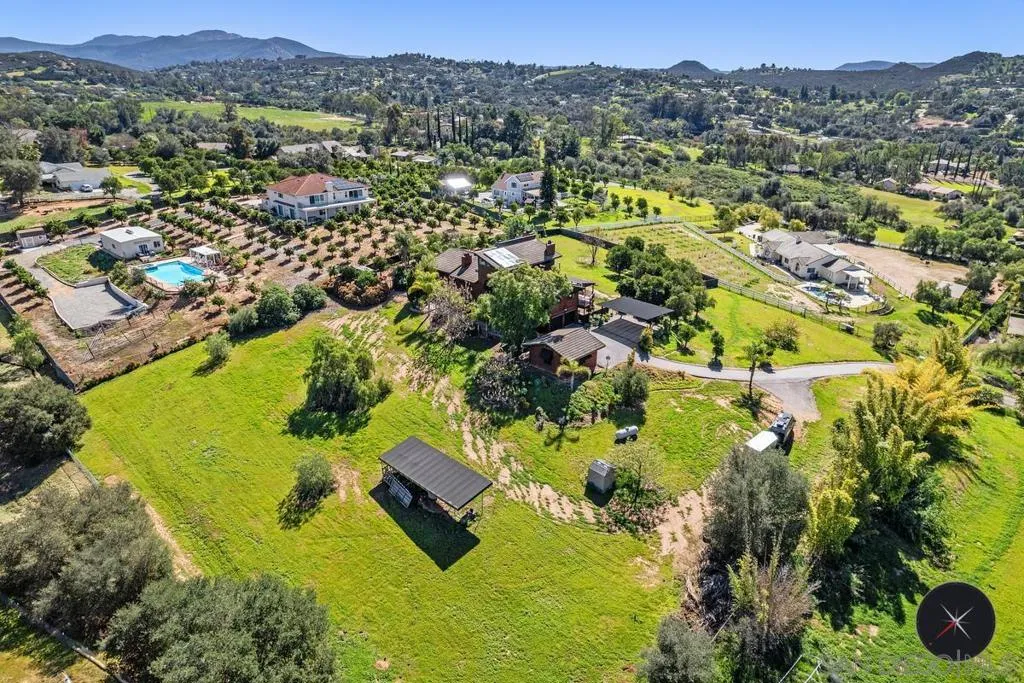 Experience the pinnacle of sophisticated rural living in this custom built western red cedar masterpiece. Set on 2 sprawling acres, this 3 bedrom, 2 bathroom main residence blends timeless craftsmanship with modern luxury. The heart of the home features soaring vaulted wood ceilings and a dramatic fireplace anchoring the great room, while new Milgard windows and slider doors frame breathtaking panoramic views of the valley and hills. The open concept design flows effortlessly to expansive decks, perfect for taking in sweeping vistas under motorized awnings. This versatile estate includes a fully attached 1 bedroom guest house with its own kitchen, living area, and private fenced yard, ideal for multi generational living or rental potential. Modern efficiency is built in with a solar system and a whole house backup generator for ultimate peace of mind. Outdoors, your private sanctuary includes a lush Valencia orange grove, a relaxing hot tub, and a detached workshop for the hobbyist. The property is fully equipped for a refined agricultural lifestyle with a 2 inch agricultural water main, a covered livestock area, and a chicken coop. Practicality meets luxury with a 4 car garage featuring motorized screens, dedicated RV parking with a large vehicle entrance, and a private gated entry. Move in ready and meticulously maintained, this is a rare opportunity to own a piece of North County serenity designed for elegance and effortless indoor outdoor living. This custom red western cedar home represents the finest in Valley Center living, offering a unique blend of architectural excellence and practical utility. The main level is designed for grand scale entertaining, highlighted by a massive great room with floor to ceiling wood accents and premium hardwood flooring. Recently upgraded with new Milgard windows and slider doors throughout, the interior is bathed in natural light while maintaining privacy with custom blackout shades. Exterior motorized window screens and awnings provide effortless climate control and shade for the expansive outdoor living areas. The attached guest house is a complete secondary residence, featuring its own bedroom, bathroom, kitchen, and living area, along with a dedicated fenced yard and deck. Sustainability and self reliance are core features, including a solar system and a whole house backup generator. The home is further enhanced by a whole house water filter and a central vacuum system for modern convenience. For those with agricultural or hobbyist interests, the 2 acre estate offers a producing Valencia orange grove and lemon tree supported by a 2 inch agricultural water main. The property is fully animal ready with a chicken coop, a covered livestock or work area, and a fully fenced dog run. Storage and workspace are abundant with an attached garage plus a detached workshop. The garage doors are equipped with motorized retractable screens, allowing for a breezy workspace. Large vehicles and trailers are easily accommodated by the dedicated RV parking and a separate large vehicle entrance on the northeast corner of the property. Every inch of the 2 acre parcel is designed for privacy and security, secured by a private gated entrance. Whether you are relaxing in the hot tub or enjoying the panoramic views from the large expansive decks, this property offers a lifestyle of tranquility and modern efficiency.