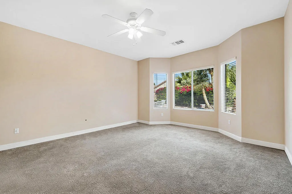 This beautifully refreshed Newport Model in Sun City Palm Desert offers an inviting atmosphere with a soft, neutral interior palette and durable wood-style laminate flooring throughout the main living areas, with carpeting reserved for the bedrooms.The remodeled kitchen showcases crisp white cabinetry, solid surface countertops, and a full suite of stainless steel appliances, creating a bright and functional cooking space. The generously sized primary suite features a charming bay window alcove--perfect for a reading nook, small office setup, or sitting area. The en suite bath includes dual sinks, a walk-in shower, a white vanity, and a spacious walk-in closet. A well-positioned guest bath conveniently doubles as a powder room for visitors.Additional highlights include custom window coverings, ceiling fans throughout, and the builder-option extended garage offering extra space for a golf cart, workshop area, or added storage. A brand-new tankless water heater has also been recently installed.Ideally located within a section of the community that enjoys its own private neighborhood pool, this home offers both comfort and convenience. HOA dues include internet service, cable TV, and access to the nearby community pool. The property is just moments from the residents-only south gate for quick entry and exit, and close to the convenient golf cart and pedestrian access gate leading to Stater Bros., dining, banking, and additional shopping options.
