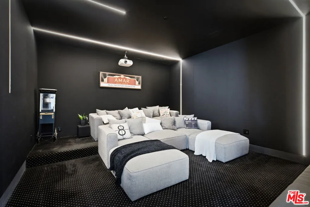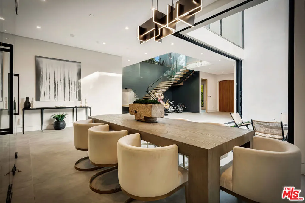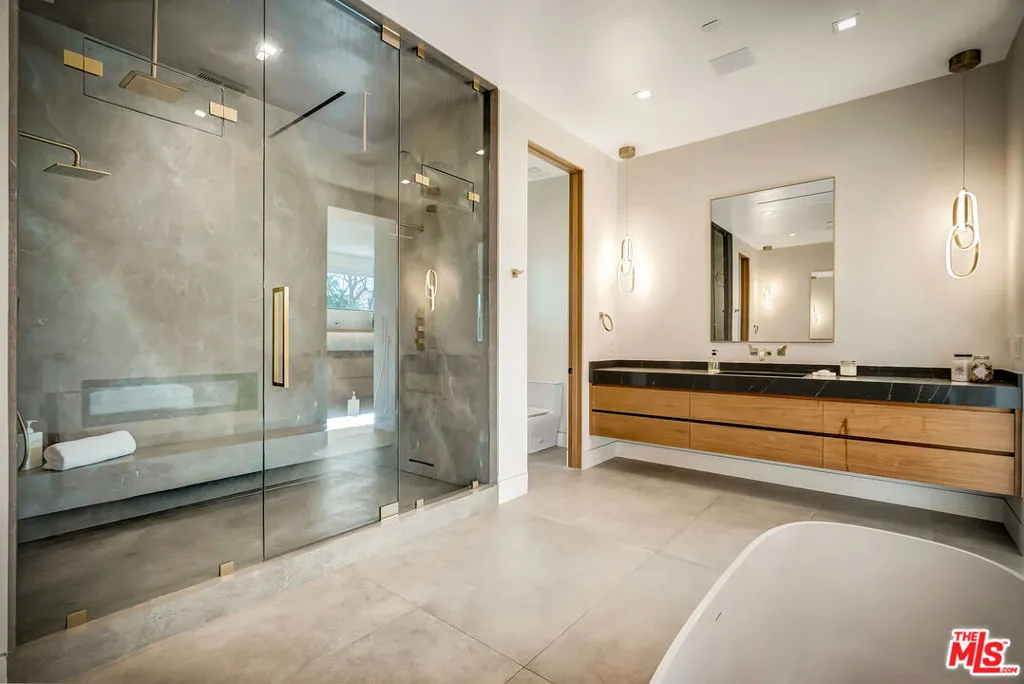 Sleek, modern newer construction in the heart of Encino, located within the sought-after Hesby Oaks School District and just moments from Ventura Blvd. This gated and private residence offers over 7,000 square feet of thoughtfully designed living space on a 12,000+ square foot lot and is equipped with solar panels for added energy efficiency. The home features 6 bedrooms, 7.5 bathrooms, and a well-designed open floor plan that connects the main living areas, creating a functional layout ideal for entertaining and comfortable daily use. The oversized kitchen is equipped with high-end appliances, custom cabinetry, generous counter space, and a large center island that anchors the home. Additional highlights include a sports court, private theater, a built-in aquarium, and a striking wine display feature that adds visual interest to the interior. Large sliding doors open to a spacious covered patio, extending the living space outdoors. The backyard is designed for entertaining, complete with a fire pit, built-in BBQ, pool and spa, pool cabana with an outdoor bathroom. Offering scale, privacy, and a prime location in one of Encino's most desirable neighborhoods, this property combines modern design with practical functionality just minutes from Ventura Blvd's dining and shopping.