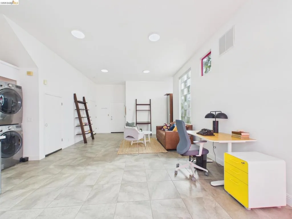 A rare fusion of Italian-inspired design and live/work functionality, this striking 1,636 sqft loft unfolds across three light-drenched floors in centrally located West Oakland. Soaring vaulted ceilings with exposed wood beam trusses set a dramatic stage — the kind of volume that invites creativity, complete with electrical connections in the rafters for studio or shop equipment. The showpiece kitchen dazzles with high-gloss crimson cabinetry, premium stainless appliances, and a chic dining space ideal for entertaining. Upstairs, the loft bedroom suite offers an intimate cathedral retreat with skylights and warm wood finishes. Two contemporary bathrooms feature porcelain tile walls and refined fixtures throughout. The flexible first-floor studio — with its own private entrance, kitchenette, and stacked laundry — functions seamlessly as a guest suite or creative studio. Outside, a lush shared courtyard with mature palms and a fountain creates a serene urban oasis.