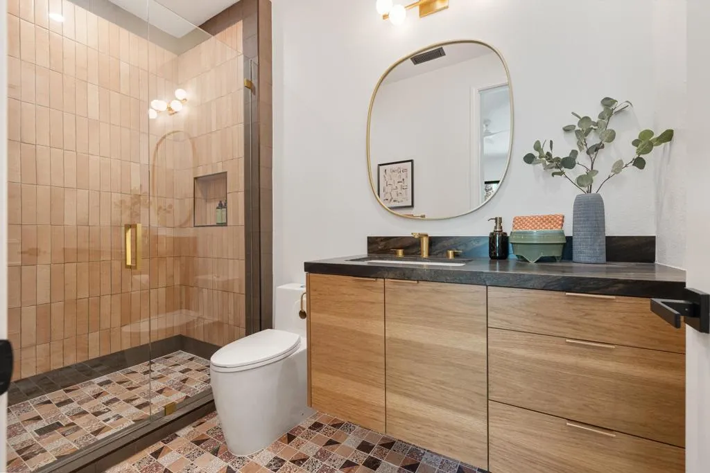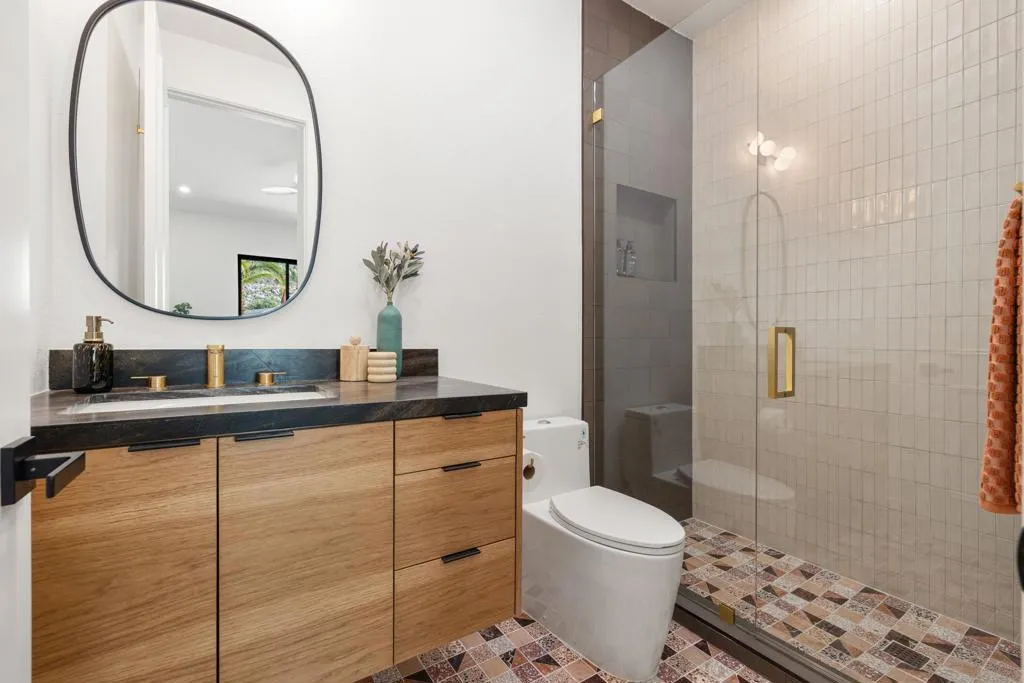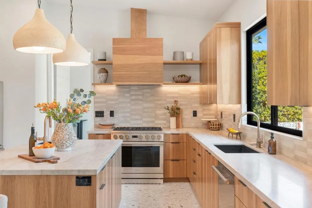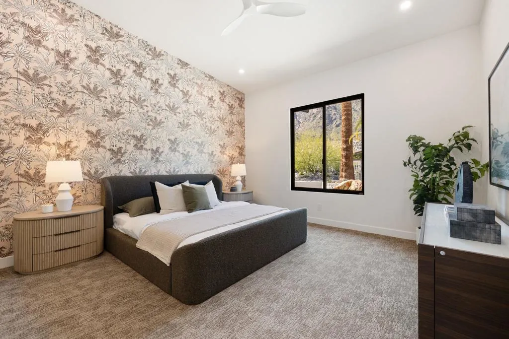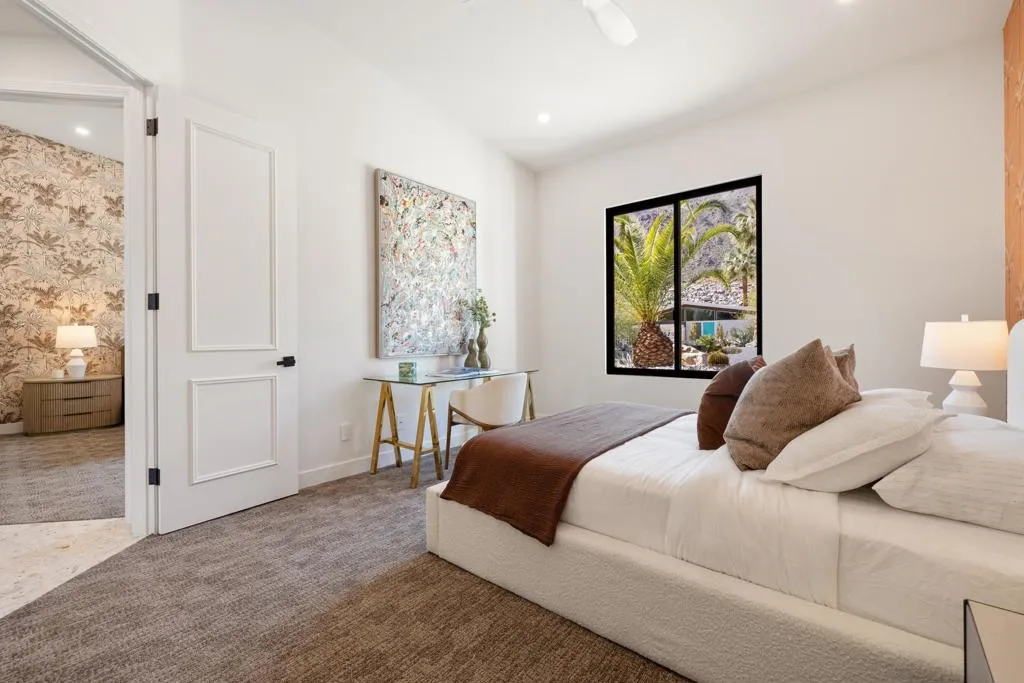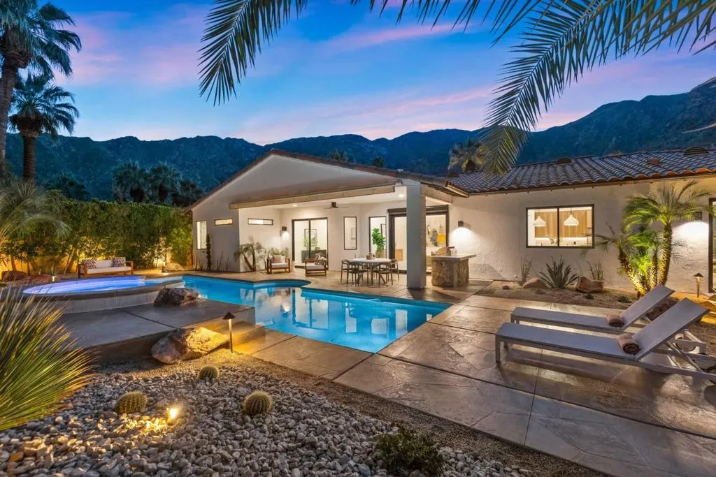 Set on Rose Avenue in the iconic Vista Las Palmas neighborhood, surrounded by celebrated period mid-century homes and framed by dramatic mountain views, this residence offers a rare combination of scale, flow, and modern infrastructure. Built in 2001 and now extensively reimagined in a sophisticated Spanish-modern, mid-century vernacular, the home blends architectural presence with contemporary comfort. Expansive living spaces with 12-foot ceilings are unified by dramatic large-format terrazzo tile flooring and illuminated by new Monumental metal windows and slidingdoors that flood the interior with natural light while connecting seamlessly to mature desert landscaping. The fully re-envisioned kitchen features custom hickory-pecan millwork, designer tile from Spain, honed Taj Mahal counters, and new high-end appliances from Monogram. The flow continues into the adjacent family room with a custom floating AV cabinet inspired by Broyhill's iconic Brasilia line, and designer wallpaper. The living and dining areas are anchored by a striking two-sided fireplace with a floating hearth, wood-paneled ceilings, and a refined wet bar with leathered Sandalus quartzite and a Brizo fixture. A spacious laundry room provides additional storage and convenience.The generous primary suite opens directly to the backyard and features a large custom walk-in closet and a spa-inspired bath with double shower, Japanese soaking tub, dual vanities, linen storage, and a private water closet with bidet. Guest bedrooms include custom wallpaper, large picture windows oriented toward the dramatic San Jacinto Mountains, and striking Elizabeth Sutton terrazzo mosaic tile in the baths. The chic powder room features a floating vanity and a mid-century-inspired tile wall. Outside, new stonework enhances the exterior and BBQ island, while the refreshed pool with new tile, lush landscaping, natural koi pond, new patio with fire pit, and a custom Trina Turk-designed breeze-block wall create a true desert retreat. Modern infrastructure includes new plumbing fixtures, designer lighting throughout, app-based systems including Pentair pool controls and a whole-house alarm with 8-camera security system, three car garage, plus owned solar panels, and two PowerWall backup batteries which supply continuous power in the event of an electrical outage, and provide for lower energy costs by powering the home during the evening hours. A rare opportunity in one of Palm Springs' most prized neighborhoods.