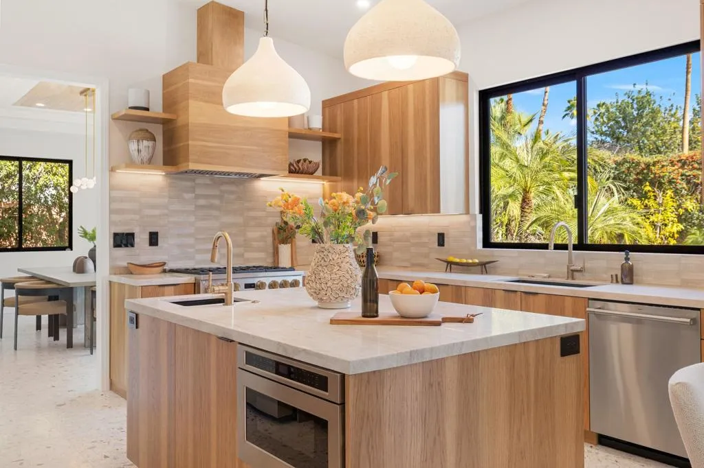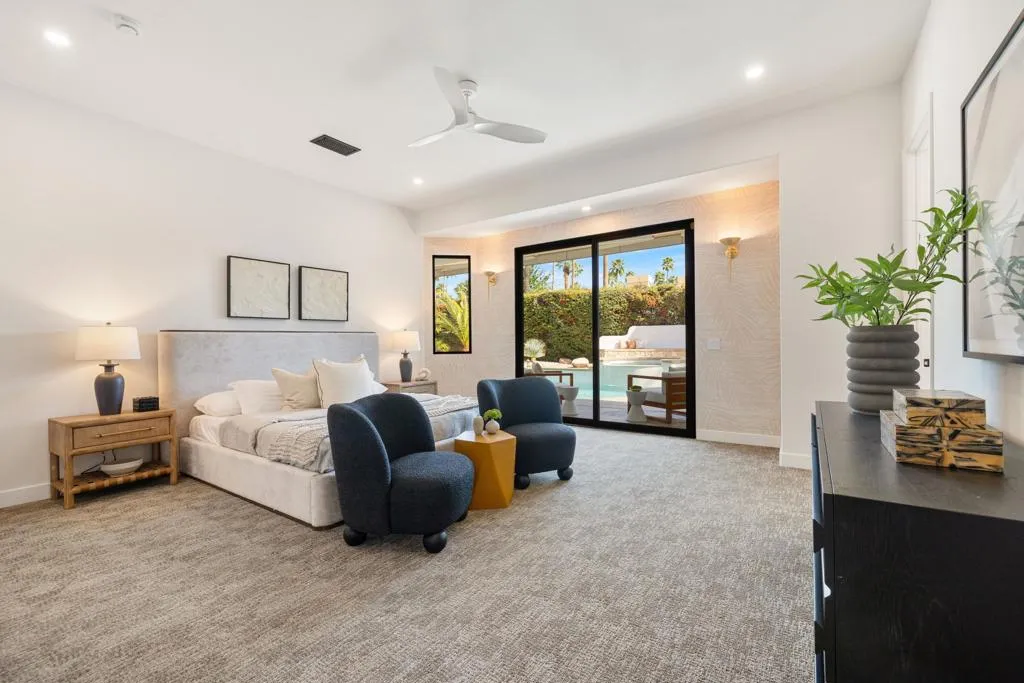 Set on Rose Avenue in the iconic Vista Las Palmas neighborhood, surrounded by celebrated period mid-century homes and framed by dramatic mountain views, this residence offers a rare combination of scale, flow, and modern infrastructure. Built in 2001 and now extensively reimagined in a sophisticated Spanish-modern, mid-century vernacular, the home blends architectural presence with contemporary comfort. Expansive living spaces with 12-foot ceilings are unified by dramatic large-format terrazzo tile flooring and illuminated by new Monumental metal windows and slidingdoors that flood the interior with natural light while connecting seamlessly to mature desert landscaping. The fully re-envisioned kitchen features custom hickory-pecan millwork, designer tile from Spain, honed Taj Mahal counters, and new high-end appliances from Monogram. The flow continues into the adjacent family room with a custom floating AV cabinet inspired by Broyhill's iconic Brasilia line, and designer wallpaper. The living and dining areas are anchored by a striking two-sided fireplace with a floating hearth, wood-paneled ceilings, and a refined wet bar with leathered Sandalus quartzite and a Brizo fixture. A spacious laundry room provides additional storage and convenience.The approximately 2,800-square-foot layout includes three en-suite bedrooms plus a powder room. The generous primary suite opens directly to the backyard and features a large custom walk-in closet and a spa-inspired bath with double shower, Japanese soaking tub, dual vanities, linen storage, and a private water closet with bidet. Guest bedrooms include custom wallpaper, large picture windows oriented toward the dramatic San Jacinto Mountains, and striking Elizabeth Sutton terrazzo mosaic tile in the baths. The chic powder room features a floating vanity and a mid-century-inspired tile wall. Outside, new stonework enhances the exterior and BBQ island, while the refreshed pool with new tile, lush landscaping, natural koi pond, new patio with fire pit, and a custom Trina Turk-designed breeze-block wall create a true desert retreat. Modern infrastructure includes new plumbing fixtures, designer lighting throughout, app-based systems including Pentair pool controls and a whole-house alarm with 8-camera security system, three car garage, plus owned solar panels, and two Tesla Powerwalls. A rare opportunity to enjoy contemporary scale and amenities in one of Palm Springs' most architecturally significant neighborhoods.