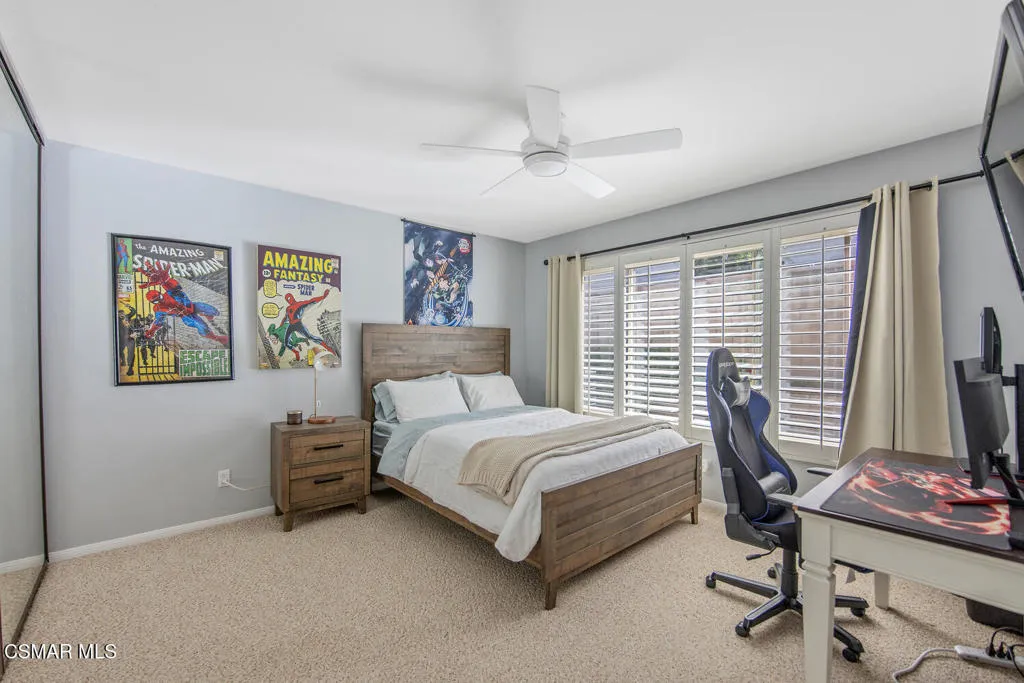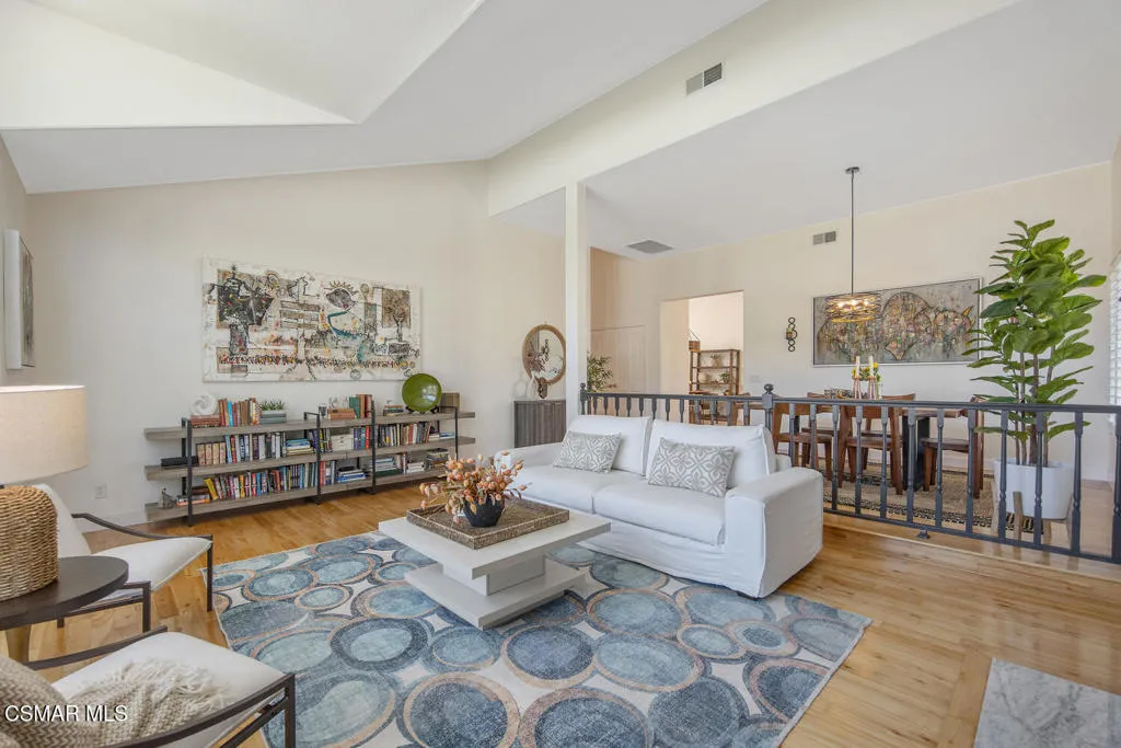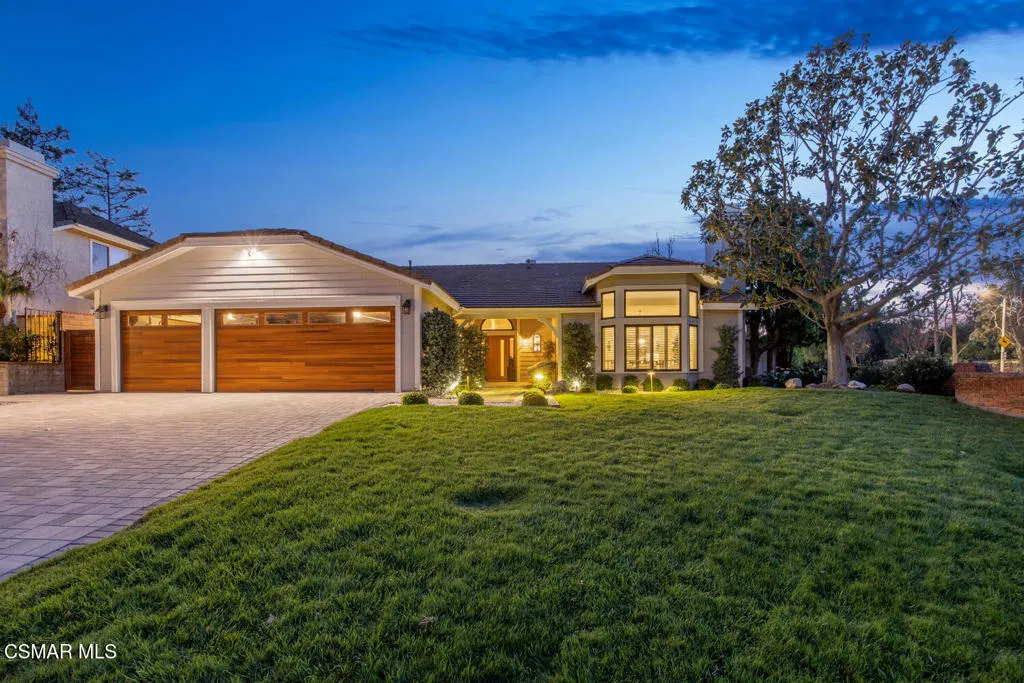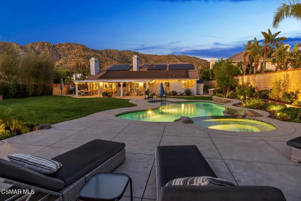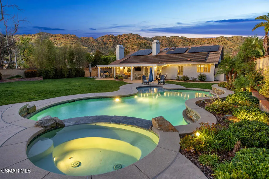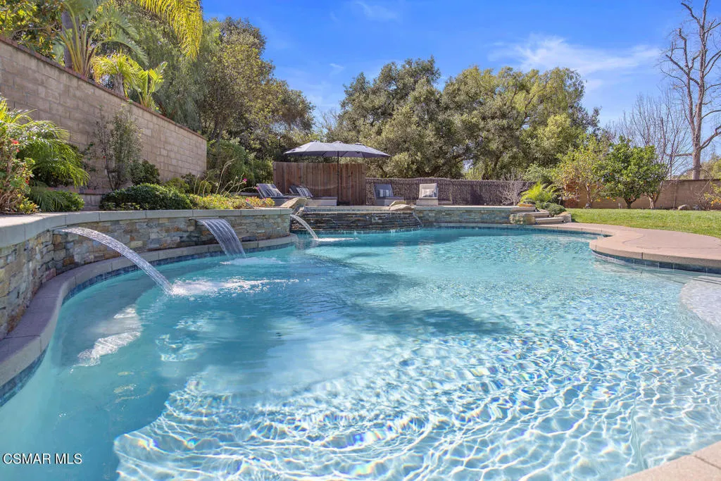 This beautifully updated one-story home in the sought after community of Sutton Valley in Oak Park on a rare almost 1/2 acre lot is truly exceptional. Starting with the curb appeal: stunning high end modern garage doors, gorgeous driveway with pavers, new drought tolerant landscaping and hard-scape, newer roof, pretty entry patio, and a new modern front door, the home is impressive from the minute you arrive. And there isn't a better backyard in all of Oak Park. With the recently reimagined large pool and spa featuring a Baja shelf, lovely stacked stone and new tile, several waterfall features, a spacious outdoor patio for dining al fresco, a massive lawn for all kinds of fun, beautiful mountain views, several fruit trees, and a side yard with turf- the backyard is perfect for enjoying the indoor/outdoor lifestyle. With over 3,200 sq ft and 4 beds and 4 baths, the home has lots of natural light, large rooms and a terrific floorplan. The spacious living room has high ceilings and a cozy fireplace, and the gourmet kitchen features a center island with storage and seating, newer quartz countertops, custom tile backsplash, and stainless-steel appliances. The well-sized family room has a cool bar with sink for entertaining, lovely stone fireplace and sliders out to the resort-like yard. The large primary bedroom is a true retreat, with a third fireplace and sitting area, doors out to the backyard, walk-in closet, and spa-like bathroom with a dual vanity, large tub and custom tile. The repurposed atrium is an ideal space for a private office or yoga/work out room, and the 3-car garage has loads of storage, EV charger, and an epoxy floor. Located near shops and restaurants, great hiking trails, and award-winning Oak Park schools. Enjoy the best of So Cal living at your own private resort.