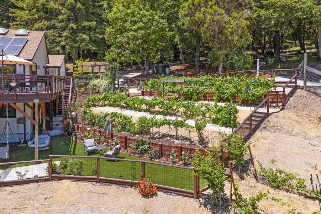 Great for multigenerational living! Tucked into the quiet beauty of Scotts Valley, but just minutes from town, this extraordinary estate invites you to live without compromise. At its heart, a meticulously curated 5+bed/3 bath main residence that is designed to live as one grand home or two distinct spaces. With spacious and sun drenched decks off the bedrooms and living spaces, enjoy the true meaning of indoor-outdoor living. Primary suite is on top level with its own laundry, bathroom, office and loft space. Lower level has 3 rooms, 1 bathroom, living area, full wet bar, and deck with hot tub! Conveniences such as large home theatre will make it so you never want to leave home. From the private vineyard to the mature fruit trees, sauna, hot tub, and multiple outdoor entertaining areas, step into a world of your own where you really can "have it all" at 55 Hidden Meadow.