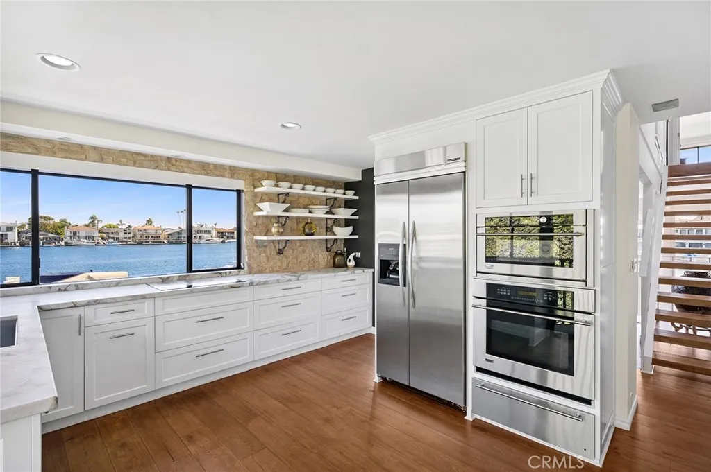 Outstanding Coastal Retreat with dock for a 48-foot boat in gated Tennis Estates in Huntington Harbor. This one-of-a-kind, totally renovated home sits directly on the water on a stunning corner promontory with Bay views from every room. The bright and airy entry-level features a living room with a fireplace, ultra-high ceilings, and floor-to-ceiling windows, plus a cozy den with bar seating. Outside, the cantilevered patio is super-sized with panoramic views of Christiana Bay, the largest bay in the Harbor. The 2nd level showcases a chef’s gourmet kitchen with marble counters and top-of-the-line appliances, and an adjacent formal dining room. The 3rd level provides two ensuite bedrooms and a sitting room with gorgeous views that could be enclosed as a third bedroom. The primary bedroom features two walk-in closets and an ultra-luxurious spa-quality bath. The Tennis Estates community offers shaded walking paths, multiple tennis/pickleball courts, and a beautiful pool. Don’t miss this amazing home and community!