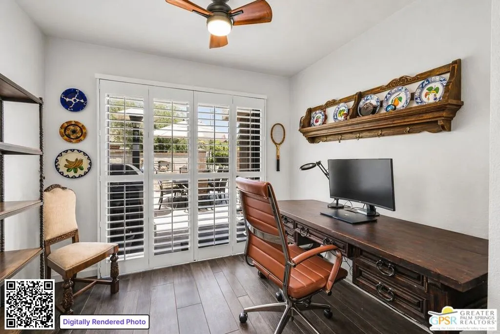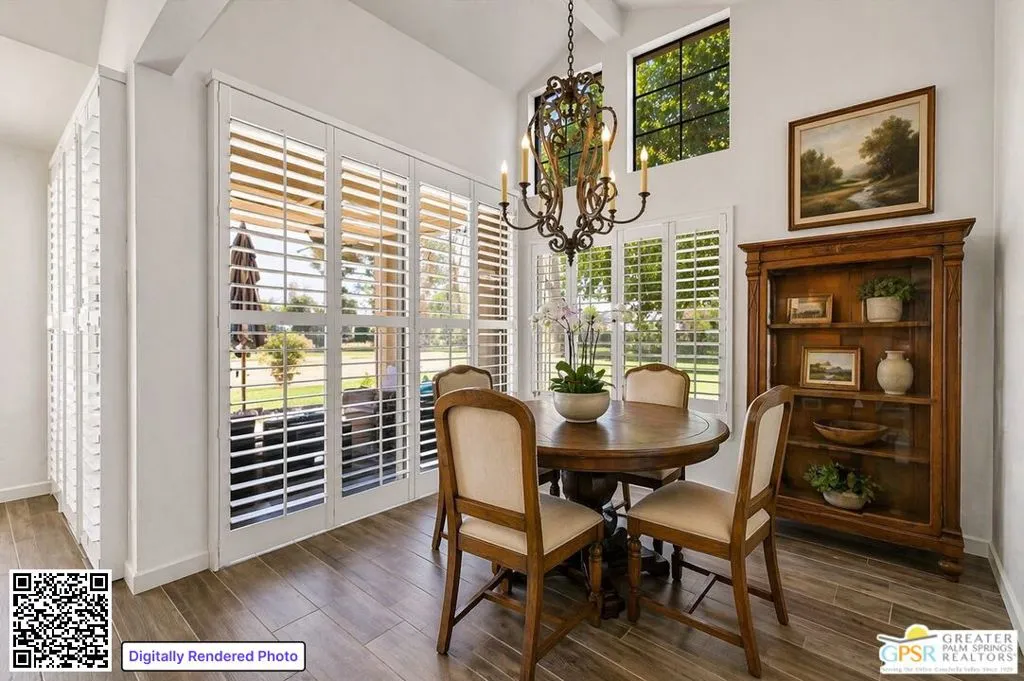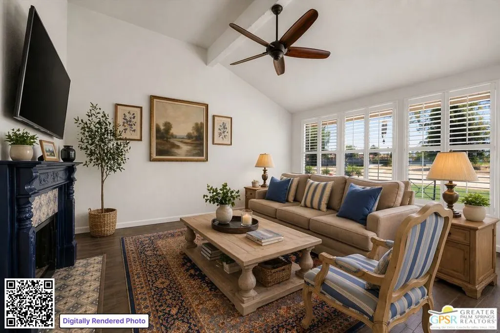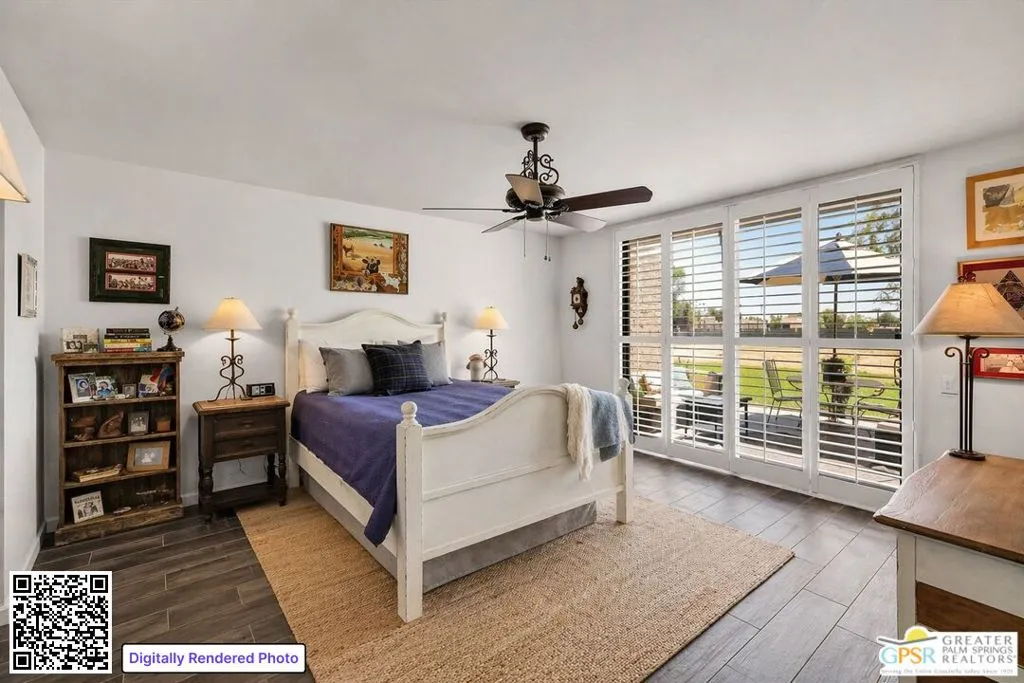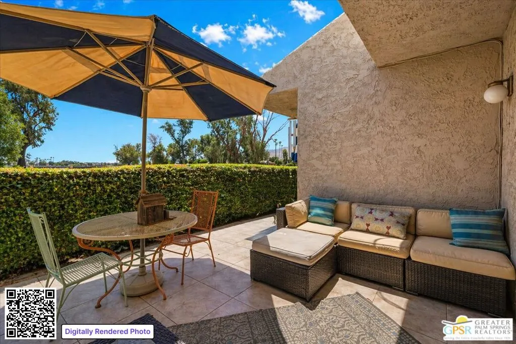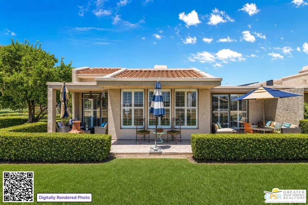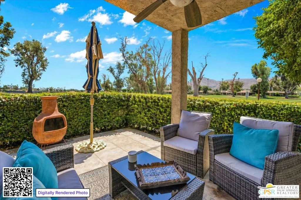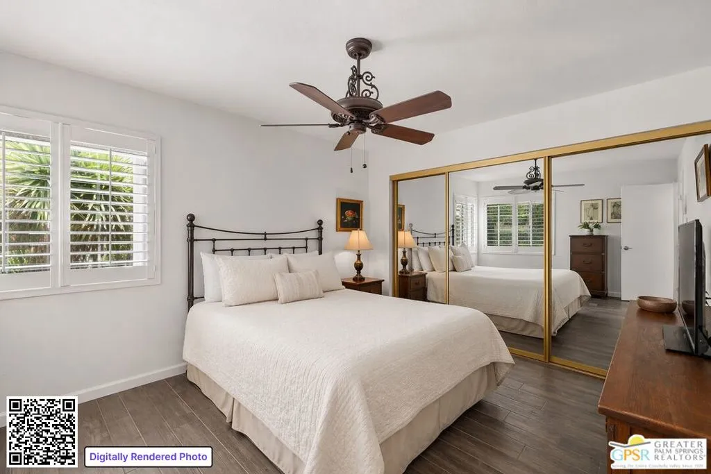 Palm Springs address, 2/2 condo in the mid $400s: RARE FIND* End unit in West Gate at Cathedral Canyon Country Club* Directly on Marriott Resort Golf Course (10th & 11th holes)* No neighboring units impacting privacy* Vaulted ceilings with smooth finish* Italian tile flooring throughout* LED recessed lighting with dimmers* Updated kitchen with quartz counters* Modern appliances + copper farmhouse sink* Two remodeled bathrooms with quartz + designer finishes* Plantation shutters throughout* WYSE smart-home system* Tankless water heater* 18-panel solar system + 220-amp EV-ready setup* Insulated garage ceiling, exhaust fan, and loft storagePrivate, clean, and move-in readyideal for easy desert living.