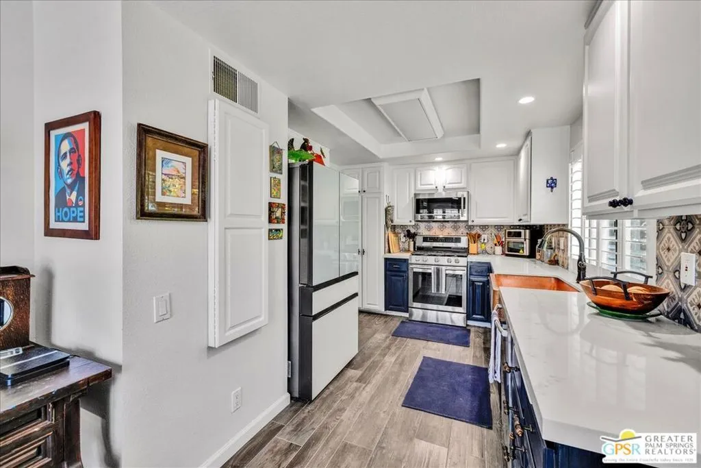 Stunning Golf Course End Unit with Palm Springs Address! Beautifully remodeled 2BD/2BA home in the highly desirable West Gate community at Cathedral Canyon Country Club. This private end unit sits directly on the Marriott Resort Golf Course between the 10th and 11th holes with no looming neighbors. Inside, soaring vaulted ceilings, smooth-finish ceilings, Italian tile flooring, and LED recessed lighting with dimmers create a bright, modern space. The stylish kitchen features quartz countertops, modern appliances, and a copper farmhouse sink. Both bathrooms have been tastefully updated with quartz counters, designer fixtures, and elegant tile finishes. Shutters add a refined touch throughout. Smart-home features include a WYSE system, tankless water heater, and upgraded solar with 18 panels and a 220-amp setup ready for an EV charger. Additional highlights include an insulated garage ceiling, exhaust fan, and loft storage. A beautifully upgraded golf course home offering privacy, style, and easy desert living.