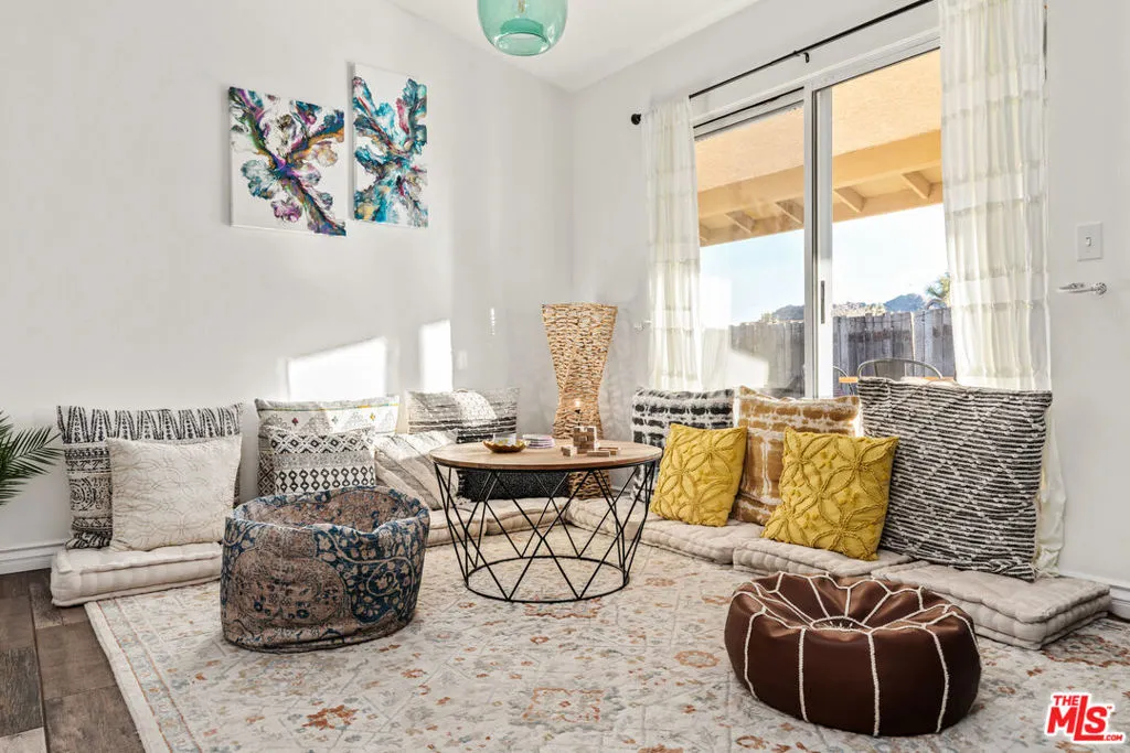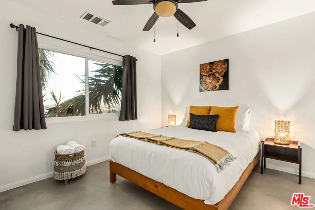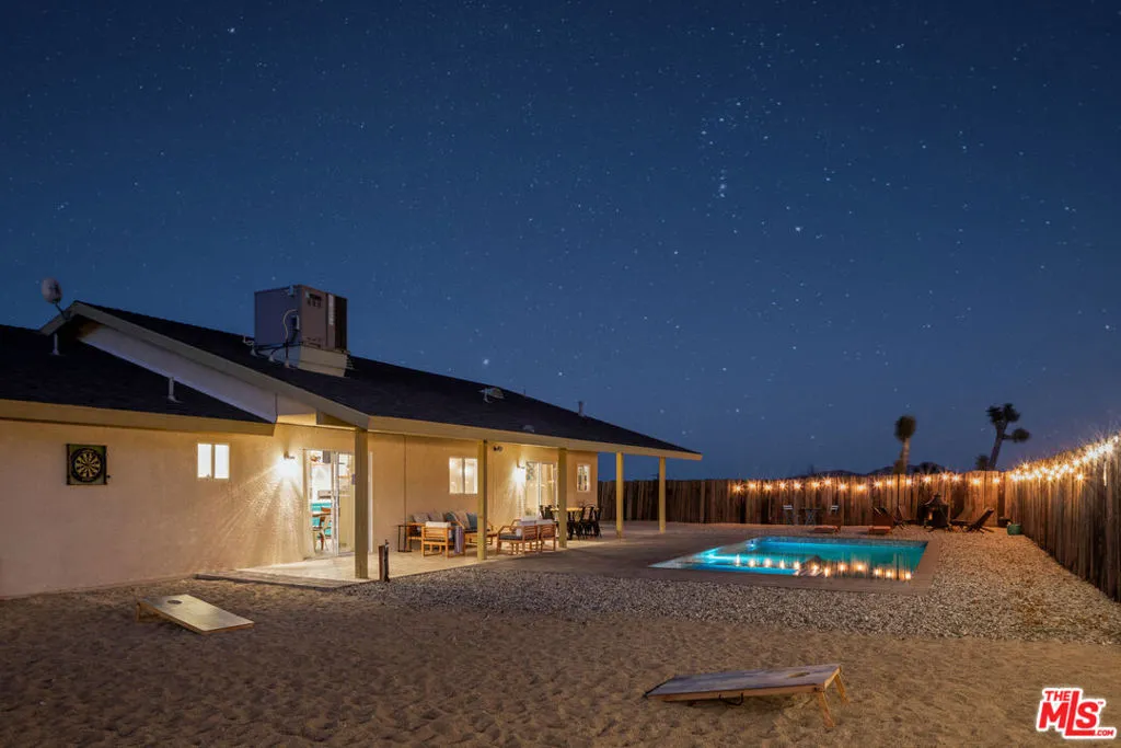 Welcome to your new home in the highly desirable Upper Friendly Hills neighborhood of South Joshua Tree. This beautifully maintained four-bedroom, two-bath residence is dramatically positioned high on a 2.28-acre lot, capturing sweeping mountain views and exceptional privacy, while offering convenient access to everyday amenities and proximity to Friendly Hills Elementary School. Designed for both comfort and refined desert living, the home features an open-concept floor plan filled with natural light and bright, inviting spaces. A striking stone wood-burning fireplace serves as the focal point of the living area, creating warmth and ambiance. The spacious kitchen blends into den, dining and living areas. The outdoor space is equally impressive. The backyard is fully fenced with rustic railroad ties, providing privacy and space for animals, recreation, or entertaining. With over two acres, there is ample room for outdoor adventure equipment, expansion, or simply embracing the wide-open landscape. Located just minutes from downtown Joshua Tree and the iconic Joshua Tree National Park renowned as one of the world's most extraordinary natural desert treasures and home to its protected namesake trees this property offers the rare combination of serenity, accessibility, and breathtaking surroundings. Meticulously maintained and thoughtfully upgraded, this exceptional home delivers tranquility, comfort, and elevated desert living. It will not disappoint.