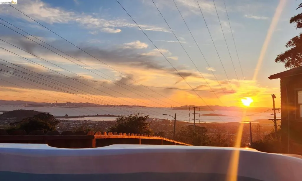 Wake up to sweeping Bay views and end each day with a sky full of color and city lights. Perched high in the coveted El Cerrito Hills, this 3BD/2.5BA home offers a rare sense of peace, privacy, and perspective. Walls of glass fill the home with natural light, while the open layout flows seamlessly to two expansive decks—perfect for sunset dinners, morning coffee, or simply taking in the Golden Gate Bridge, Bay Bridge, and shimmering skyline. A private hot tub and pergola offers a front-row seat to the ever-changing sky. Inside, warm wood floors and refined finishes create a welcoming atmosphere, complemented by a modern kitchen designed for both daily living and easy entertaining. A long private driveway leads to a spacious front patio and yard—ideal for gatherings or quiet retreat. The detached 2-car garage with bonus space offers endless flexibility for a home office, studio, guest suite, or potential ADU. Surrounded by scenic trails yet close to BART and major routes, this home blends elevated living with everyday convenience.