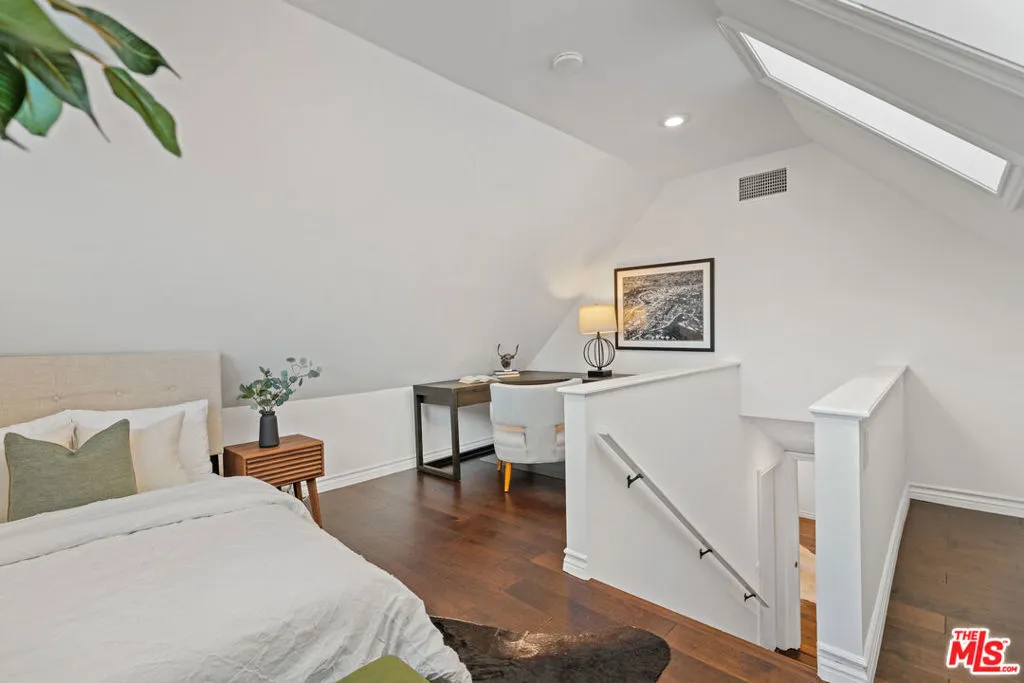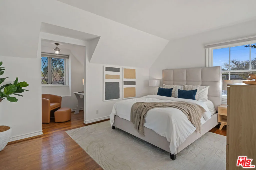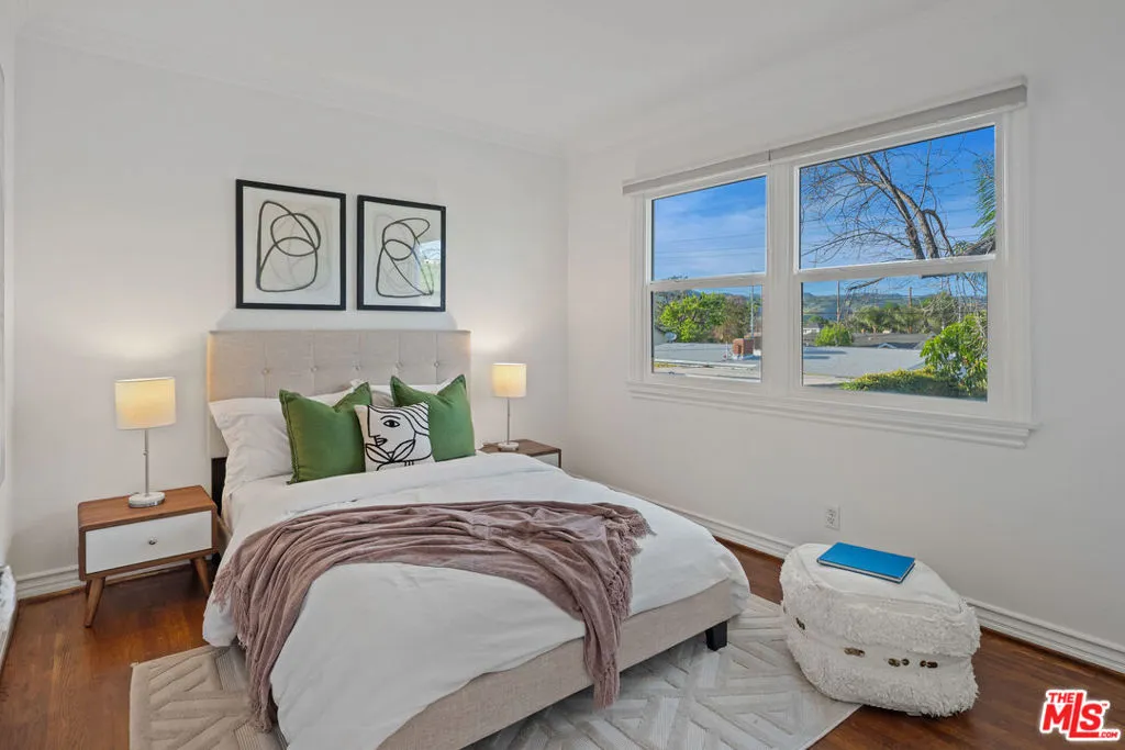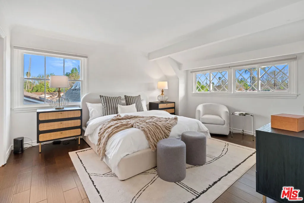 Storybook two-story on a beautiful cul-de-sac in prime Woodland Hills. Spacious and thoughtfully updated throughout, featuring an open chef's kitchen with expansive countertops, breakfast bar, double ovens, stainless appliances, abundant cabinetry, and natural light. Distressed hardwood floors, fireplace, and French doors enhance the flexible living and dining spaces. Oversized primary suite with walk-in closet and updated bath access. Secondary bedroom with adjoining alcove ideal for office/study. Third bedroom with yard views. Fourth bedroom/den with direct bath access. Separate upstairs bonus family room/office (optional 5th bedroom without closet) offers exceptional flexibility.Large, flat, fenced backyard with mature landscaping, brick patios, pergola, tangelo tree, and outdoor TV perfect for entertaining. Walking distance to El Camino & Hale. Minutes to Warner Center and The Commons. *Upgrades: CertainTeed Presidential Shake roof (2023), new electrical panel (2022), Noritz tankless water heater (2025), new upstairs flooring (2022), guest bedroom windows (2022), ceilings removed/repainted (2022/2026), front & backyard redesign (2023), EV charger (2023), Nest thermostat (2025), Samsung washer/dryer (2023), Graber cordless blinds (2023).