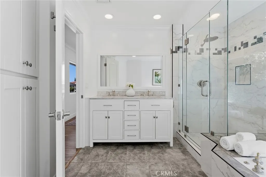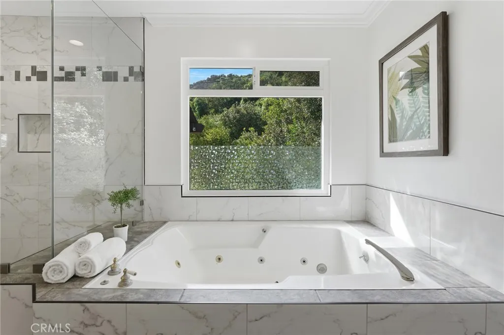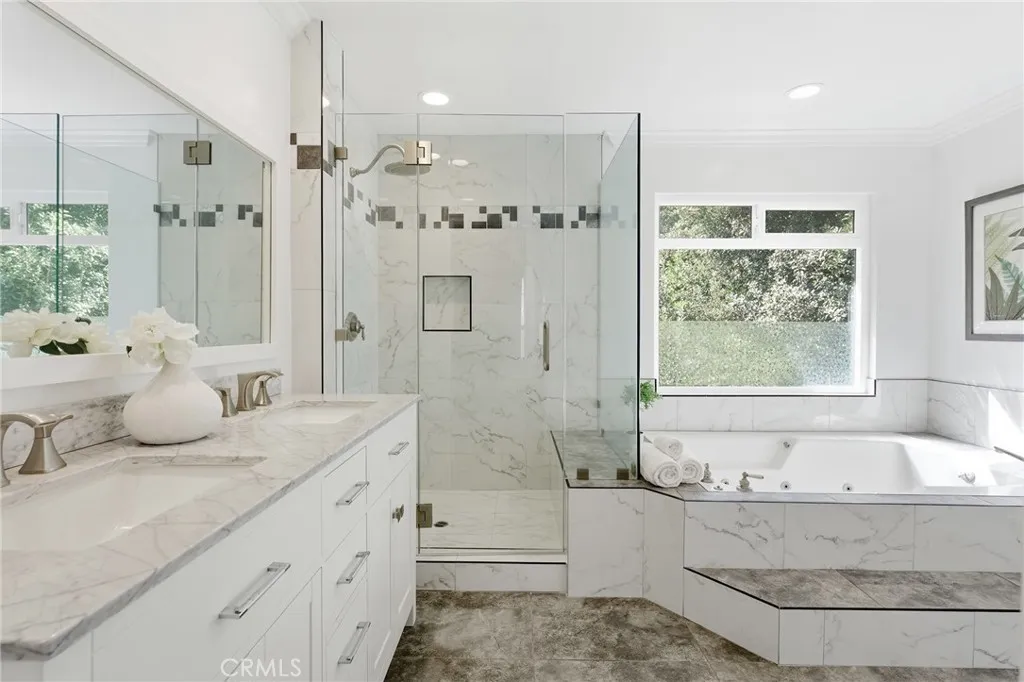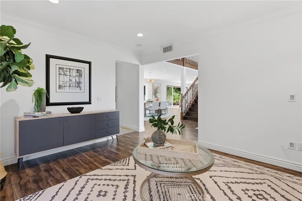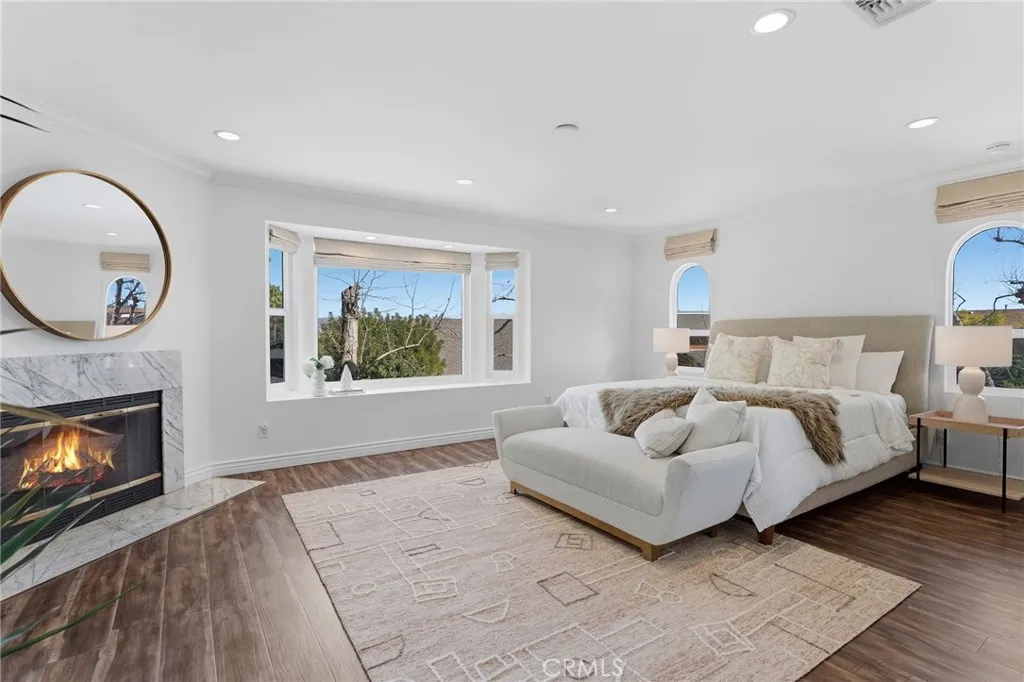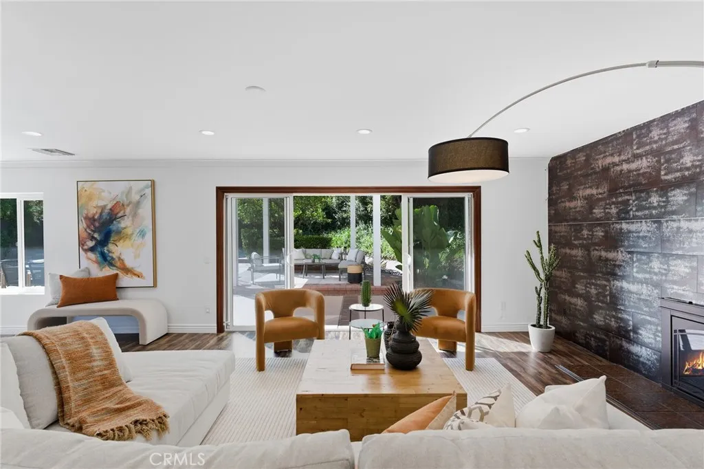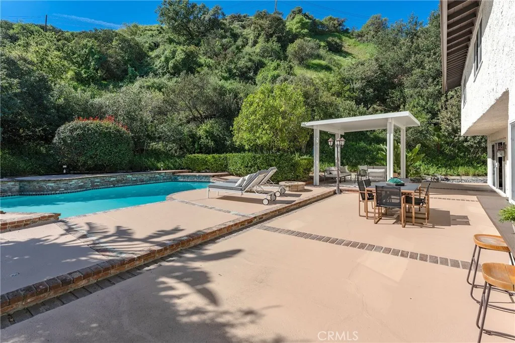 Located South of the Boulevard in the idyllic and coveted quiet neighborhood of Woodland Crest sits this sprawling 5 bedroom, 3,256 SF pool home situated on a 26k SF cul-de-sac lot with completely owned/paid off solar panels that provide no electricity bills! The property sits elevated above the street with mature landscaping and a sweeping paver stone driveway that leads to the 2-car garage with direct access. A covered front porch greets you before entering the sunlit 2-story entry with oversized windows that bask the home with natural light. The spacious living room features fireplace, tiled accent wall, and glass sliders that open to the backyard. The formal dining room can accommodate large dinner parties, while a separate formal living room/den provides a great space to unwind and enjoy more quiet conversation. The upgraded kitchen has quartz counters, custom cabinetry, stainless appliances, peninsula with breakfast bar seating, breakfast nook with exterior access, and expansive windows that open to the yard with pass-through serving counter. A guest powder bathroom is conveniently located off the living spaces. Upstairs you will find 5 well appointed bedrooms, including the expanded primary suite which boasts separate sitting room, bedroom with fireplace and peak-a-boo mountain views, large walk-in closet with built-ins + second wardrobe closet, and luxurious remodeled en-suite bathroom with dual sinks, spa tub, and separate walk-in shower. A second junior primary suite features vaulted ceiling and en-suite bathroom with walk-in shower. Three additional secondary bedrooms are also ideal for offices/gym/flex space and are serviced by a large hall bath with tub/shower. Surrounded by nature and lush landscaping, the private grounds provide a true sanctuary for entertaining featuring refinished heated swimming pool, covered outdoor living room, fire pit, separate fenced in side yard for play, and sprawling patio for dining alfresco. Desirably located adjacent to Topanga Canyon shops/eateries, Westfield Topanga Mall + Village, Warner Center, minutes to both Ventura Boulevard and Malibu, and zoned for acclaimed Woodland Hills Charter Elementary. Bordering Topanga & Calabasas with incredible dining, upscale markets and entertainment moments away, and just a short canyon drive to the ocean and west side, the home's ideal location has the feel of a secluded retreat yet is close to all the city has to offer.