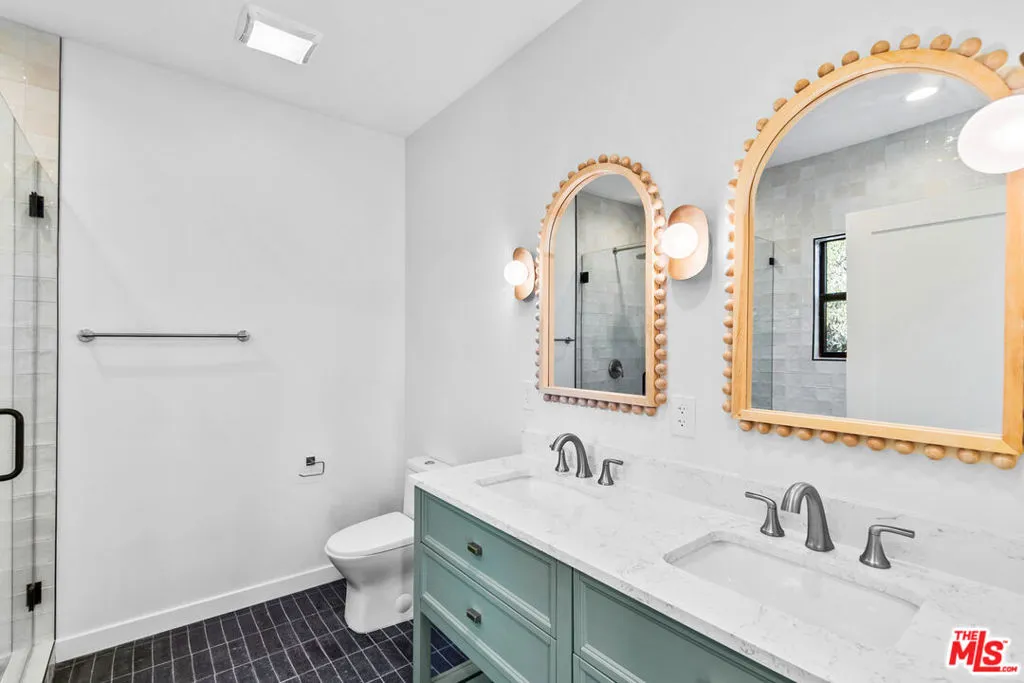Bright, stylish and thoughtfully remodeled in 2023 this Upper Duplex residence has 3 private balconies and abundant natural light. Chef style kitchen features custom cabinetry w/great storage, long stone countertops, farm style sink, gas range w/range hood, dishwasher, beverage cooler, and breakfast bar. Skylights brighten living space in addition to french doors opening to private balcony. Primary Bedroom is ensuite, offers modern aesthetic featuring custom tile, dual vanity sinks, stand alone shower, and separate tub. Second bedroom is on opposite side of unit perfect for guests or home office. Similar to a townhome entry, a full set of interior stairs at the entry leads to a single-level interior living space. Washer Dryer in Unit, 1 assigned parking space, utilities not included.Lovely property located in Trendy Tri West Weho, adjacent to John Reed, Erewhon, Trader Joe's, and local nightlife.