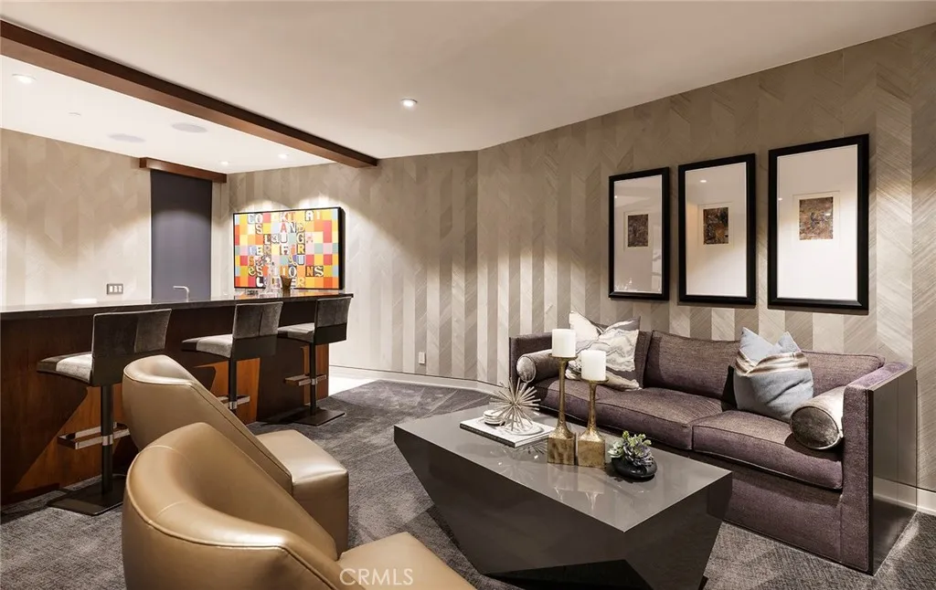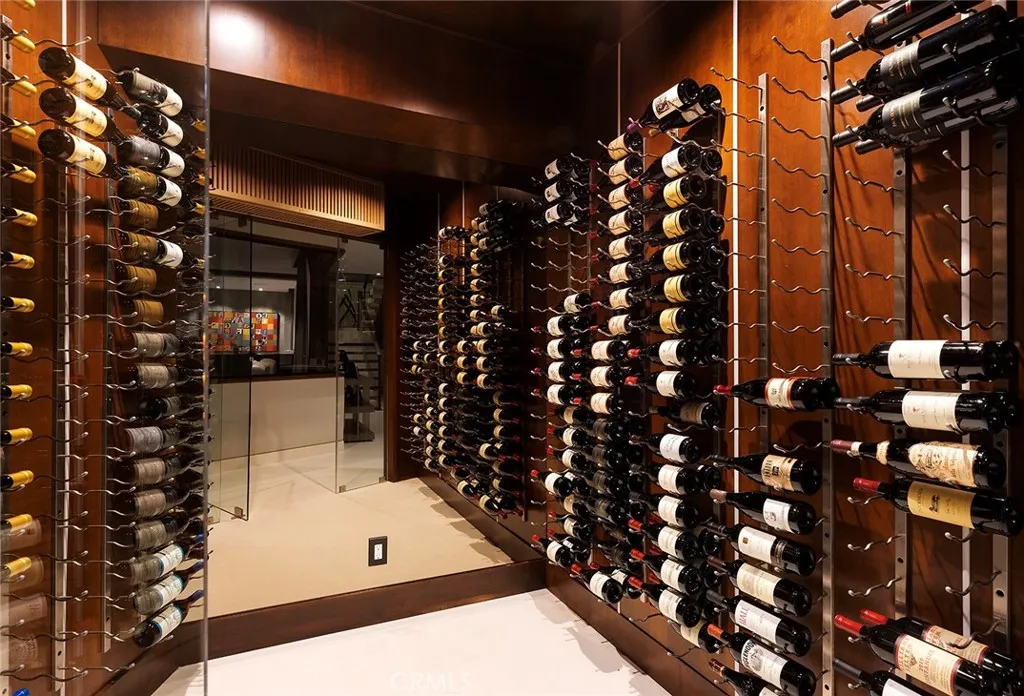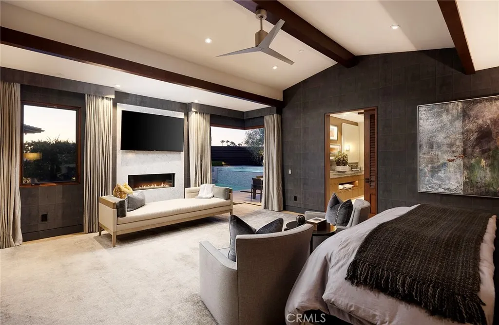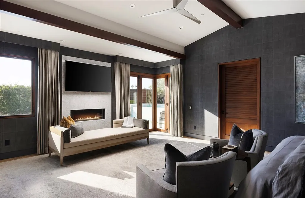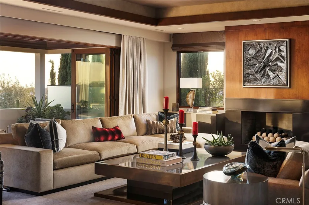 Located in the coveted community of Cameo Shores in Corona del Mar, this extraordinary coastal sanctuary unfolds across an elevated 12,000-square-foot parcel, offering nearly 6,000 square feet of effortless single-level living complemented by an additional 900 square feet of lower-level retreat. The home can delivered fully furnished with curated designer pieces outside of Escrow, a masterclass in understated luxury and seamless indoor-outdoor living. Beyond the private gated entry, a tranquil arrival sets the tone, revealing a sun-washed interior defined by soaring ceilings, walls of glass, and a warm, natural palette of refined textures. South-facing living and dining spaces open gracefully to ocean-view terraces, while the expansive outdoor domain is anchored by a resort-style pool, spa, fire feature, and intimate seating vignettes, inviting quiet moments and meaningful gatherings alike. At the heart of the home, a sculptural culinary kitchen with a striking fifteen-foot island serves as both gathering place and design centerpiece, harmonizing the surrounding living, dining, and outdoor terrace. A discreet secondary kitchen and bar offer effortless service to the central courtyard, while a thoughtfully placed media lounge with bi-fold doors dissolves the boundary between interior and exterior. Interiors are layered with intention: solid wood flooring grounds natural stone surfaces, custom cabinetry and wall coverings add depth, and tailored lighting complements automated shades and drapery. Full Control4 automation orchestrates lighting, climate, audio-visual, security, and window treatments, delivering comfort with quiet precision. The primary suite occupies its own private wing, introduced by an executive office and culminating in a serene bedroom with fireplace, sitting area, and direct access to the pool and spa. A spa-inspired bath features dual vanities, bespoke cabinetry, stone-and-glass shower, and soaking tub, while an expansive dressing room with center island and enclosed wardrobes completes the retreat. Four additional bedroom suites and two powder rooms provide gracious accommodations, while the lower level reveals a four-car garage, wine cellar, full bath, and state-of-the-art cinema with entertaining bar. Crowning the residence, a rare rooftop deck offers sweeping panoramic ocean vistas, a peaceful perch above it all. Residents of Cameo Shores enjoy gated access to three private beaches and Crystal Cove State Beach.