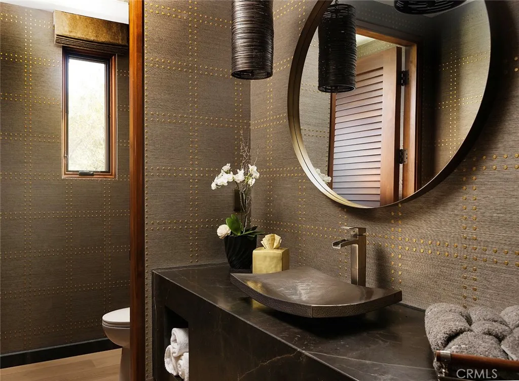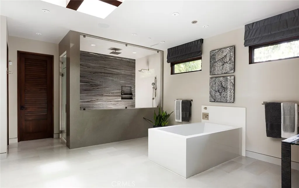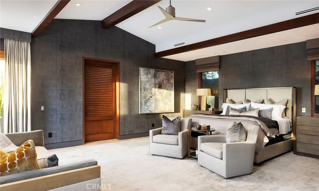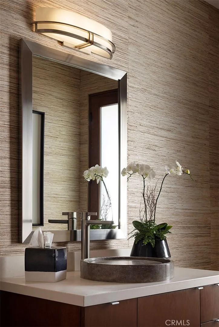 Located in the coveted community of Cameo Shores in Corona del Mar, this extraordinary coastal sanctuary unfolds across an elevated 12,000-square-foot parcel, offering nearly 6,000 square feet of effortless single-level living complemented by an additional 900 square feet of lower-level retreat. The home can delivered fully furnished with curated designer pieces outside of Escrow, a masterclass in understated luxury and seamless indoor-outdoor living. Beyond the private gated entry, a tranquil arrival sets the tone, revealing a sun-washed interior defined by soaring ceilings, walls of glass, and a warm, natural palette of refined textures. South-facing living and dining spaces open gracefully to ocean-view terraces, while the expansive outdoor domain is anchored by a resort-style pool, spa, fire feature, and intimate seating vignettes, inviting quiet moments and meaningful gatherings alike. At the heart of the home, a sculptural culinary kitchen with a striking fifteen-foot island serves as both gathering place and design centerpiece, harmonizing the surrounding living, dining, and outdoor terrace. A discreet secondary kitchen and bar offer effortless service to the central courtyard, while a thoughtfully placed media lounge with bi-fold doors dissolves the boundary between interior and exterior. Interiors are layered with intention: solid wood flooring grounds natural stone surfaces, custom cabinetry and wall coverings add depth, and tailored lighting complements automated shades and drapery. Full Control4 automation orchestrates lighting, climate, audio-visual, security, and window treatments, delivering comfort with quiet precision. The primary suite occupies its own private wing, introduced by an executive office and culminating in a serene bedroom with fireplace, sitting area, and direct access to the pool and spa. A spa-inspired bath features dual vanities, bespoke cabinetry, stone-and-glass shower, and soaking tub, while an expansive dressing room with center island and enclosed wardrobes completes the retreat. Four additional bedroom suites and two powder rooms provide gracious accommodations, while the lower level reveals a four-car garage, wine cellar, full bath, and state-of-the-art cinema with entertaining bar. Crowning the residence, a rare rooftop deck offers sweeping panoramic ocean vistas, a peaceful perch above it all. Residents of Cameo Shores enjoy gated access to three private beaches and Crystal Cove State Beach.