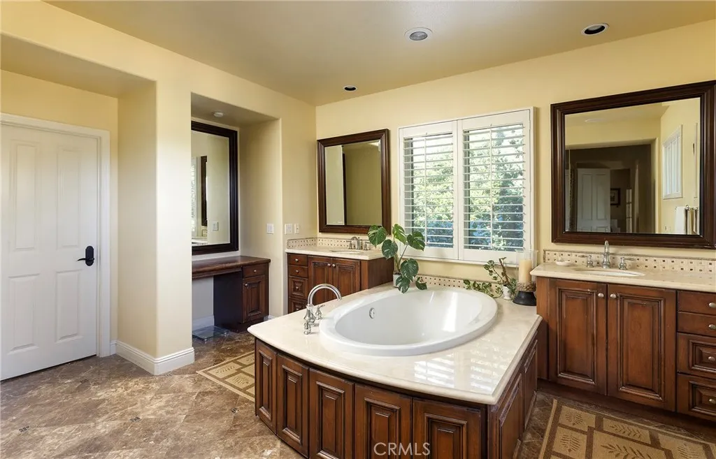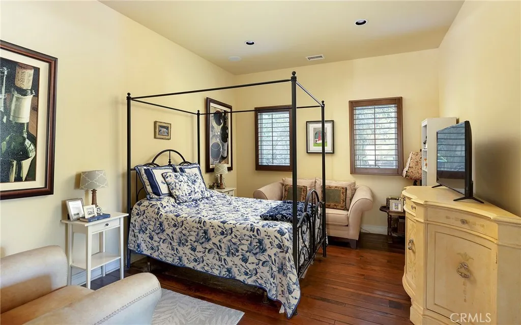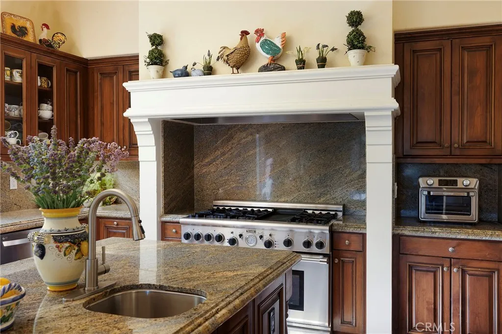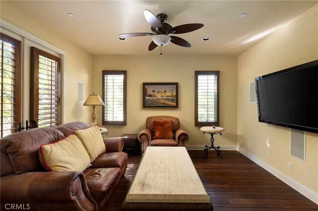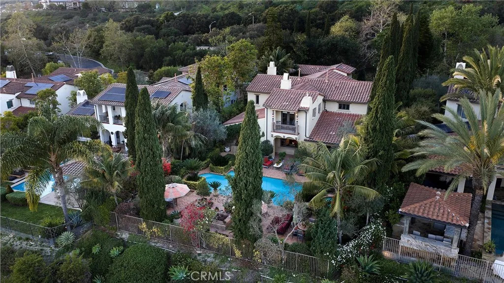 Set behind the gates of Careyes on one of its largest and most coveted 1/3-acre lots, this Italian Riviera–inspired estate unfolds like a private European retreat tucked quietly into the hills of San Clemente. From the moment you arrive, there is a shift. The architecture feels storied and intentional, rooted in another era. Soaring wood-beamed ceilings rise above Richard Marshall hardwood floors with intricate mosaic inlays, while wrought iron detailing, arched passages, and precast stone fireplaces create depth and romance throughout. The expansive floor plan offers six bedrooms, five full baths and two half baths, including two detached casitas. The downstairs casita is appointed with a high-end TV surround sound system, ideal for theater-style entertaining, while the upper casita offers its own private living space for guests or multigenerational flexibility. Formal and informal spaces flow into a gourmet kitchen with professional-grade appliances and granite countertops, allowing the home to live as beautifully as it entertains. Interior rooms and garden areas were pre-wired for high-end sound, creating a seamless indoor-outdoor experience. Upstairs, the primary suite serves as a private sanctuary, opening to a double-doored balcony with peek-a-boo ocean views beyond the rolling fairways of the Fred Couples–designed championship golf course and adjacent natural preserve. Yet it is the grounds that truly set this property apart. The backyard unfolds in terraces of aged brick, a rare architectural landscape that evokes the romance of the Italian coast. Imported Italian planters frame the estate, while mature landscaping forms a living wall of privacy, enclosing the property in quiet seclusion. Strategically placed water features provide a constant, soothing soundtrack as birds move through the trees throughout the day. At the heart of the garden, a resort-caliber pool shimmers with imported Walker Zanger Italian tile, paired with a heated spa that spills gently into the pool in a continuous cascade. Sunlight moves across brick and water as the day unfolds, creating an atmosphere that is immersive, transportive, and remarkably serene. Every pathway, hedge, and terrace has been considered with intention. The outdoor experience is not an accessory to the home. It is its soul.