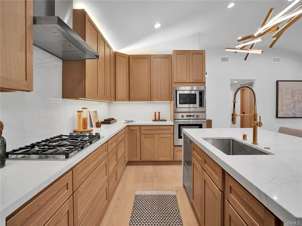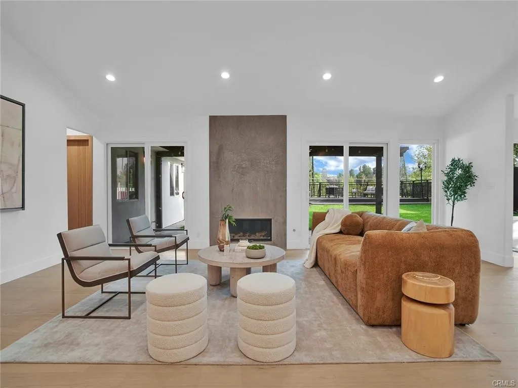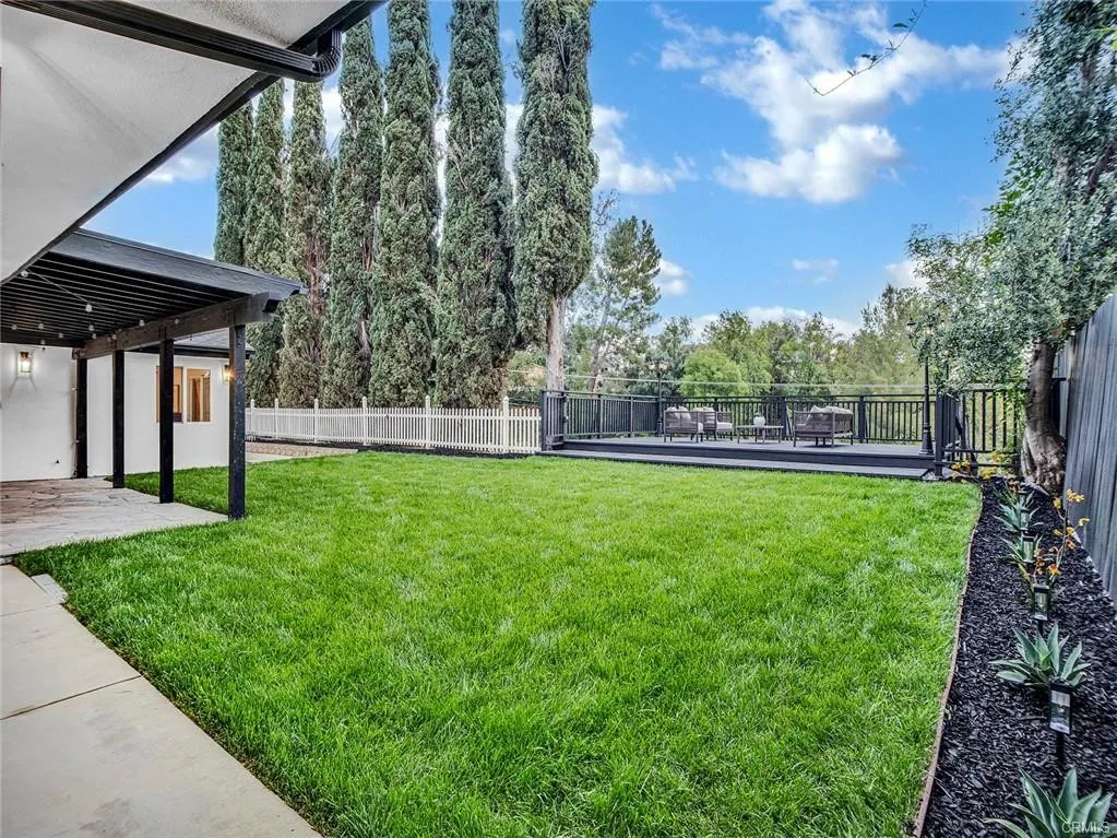 Set against a backdrop of scenic, panoramic views, this fully renovated home offers 4 bedrooms, 3 bathrooms, plus a dedicated office with 2,751 sq ft of sleek, modern living on a generous 14,380 sq ft lot in a tranquil Woodland Hills neighborhood west of Valley Circle. Thoughtfully redesigned with contemporary style and comfort in mind, the home features an expansive open layout with soaring ceilings, wide-plank hardwood floors, and abundant natural light throughout. The formal living room is anchored by a dramatic floor-to-ceiling fireplace and opens through large sliders to a covered stone patio and spacious backyard—perfect for seamless indoor-outdoor living. A large formal dining area and an additional casual living space provide flexible options for entertaining and everyday life. The gourmet kitchen is a standout, boasting a waterfall-edge quartz island, custom soft-close cabinetry, built-in appliances, and clean, modern finishes. Two en-suite bedrooms include a stunning primary retreat with its own floor-to-ceiling fireplace, walk-in closet, spa-inspired bath with dual sink vanity, glass-enclosed shower, and soaking tub, plus private access to a serene patio with outdoor shower. The expansive backyard offers lush landscaping, a large viewing deck ideal for taking in the spectacular valley and hillside vistas, and ample space to potentially add a pool or further personalize your outdoor oasis. Recent upgrades include a brand-new roof, new HVAC system, and dual-pane windows for energy efficiency and year-round comfort. Ideally located near premier shopping and dining at The Commons at Calabasas, Westfield Topanga, and The Village, with popular spots like JOEY, North Italia, Prose, and Ruth’s Chris all just minutes away. Outdoor recreation abounds with nearby Serrania Park, Warner Center Park, and the Upper Las Virgenes Canyon Preserve. With easy access to the 101 and 118 freeways and zoning for top-rated schools—Lockhurst Elementary, Hale Charter Academy, and El Camino Real Charter High School—this home offers modern luxury, exceptional views, and a coveted Woodland Hills lifestyle.