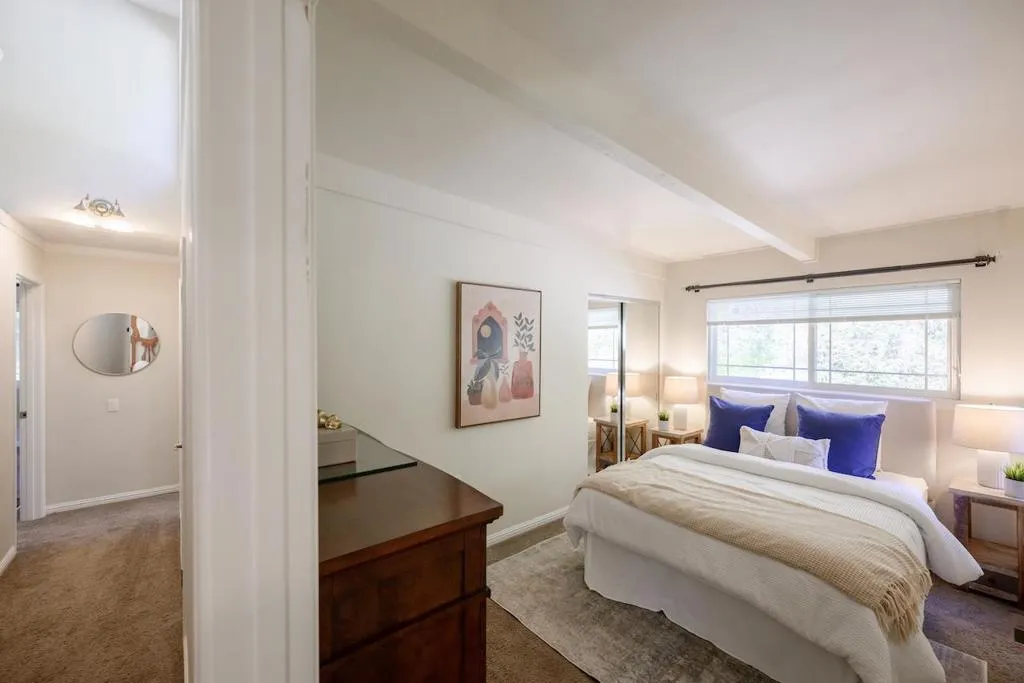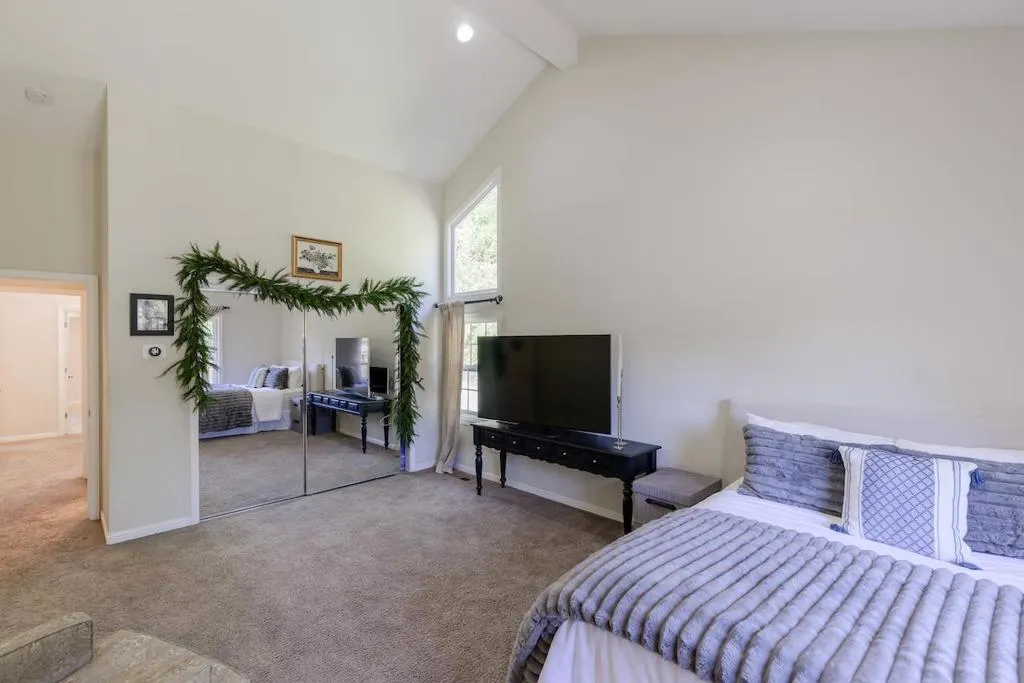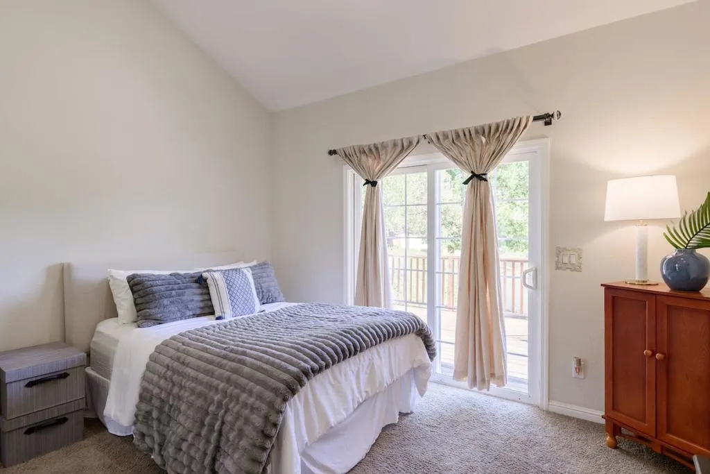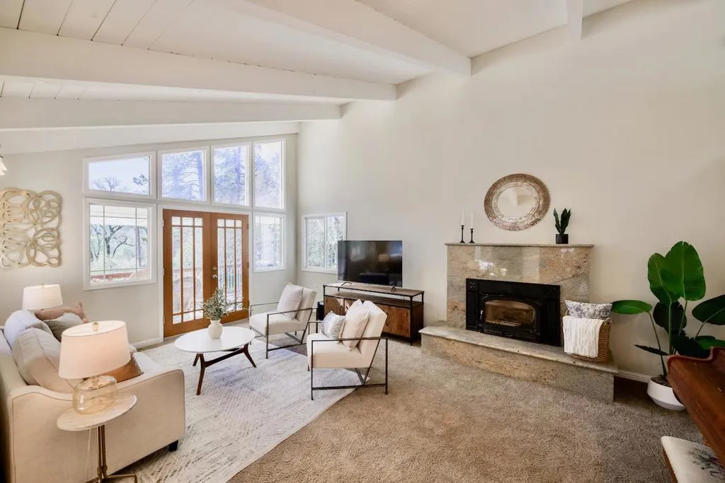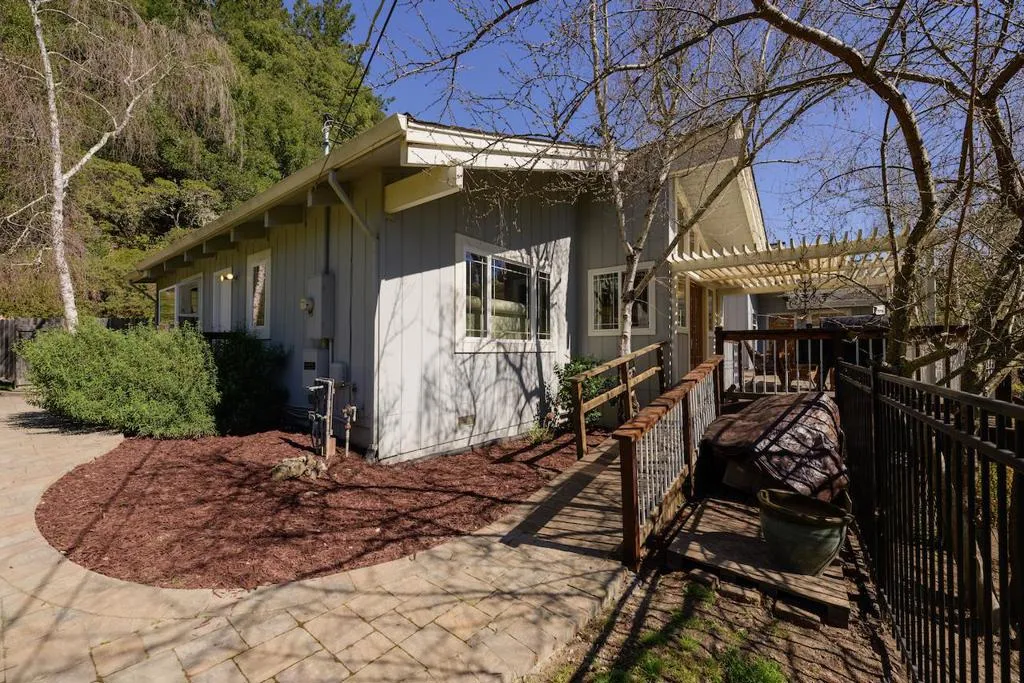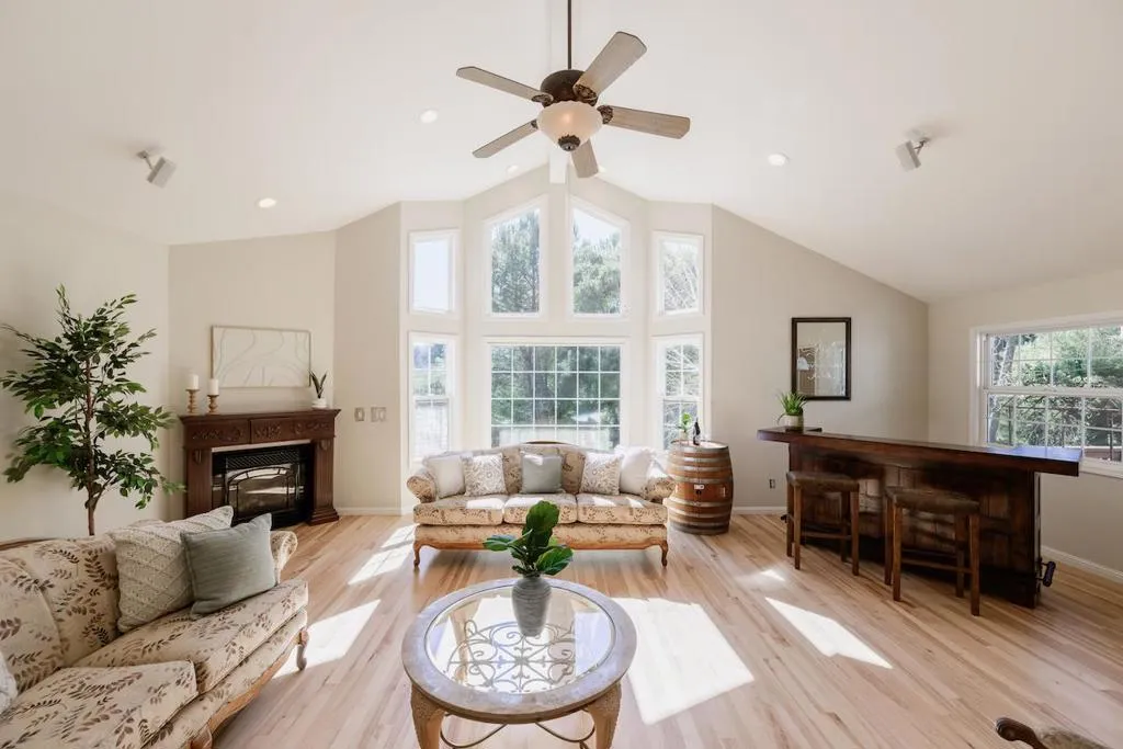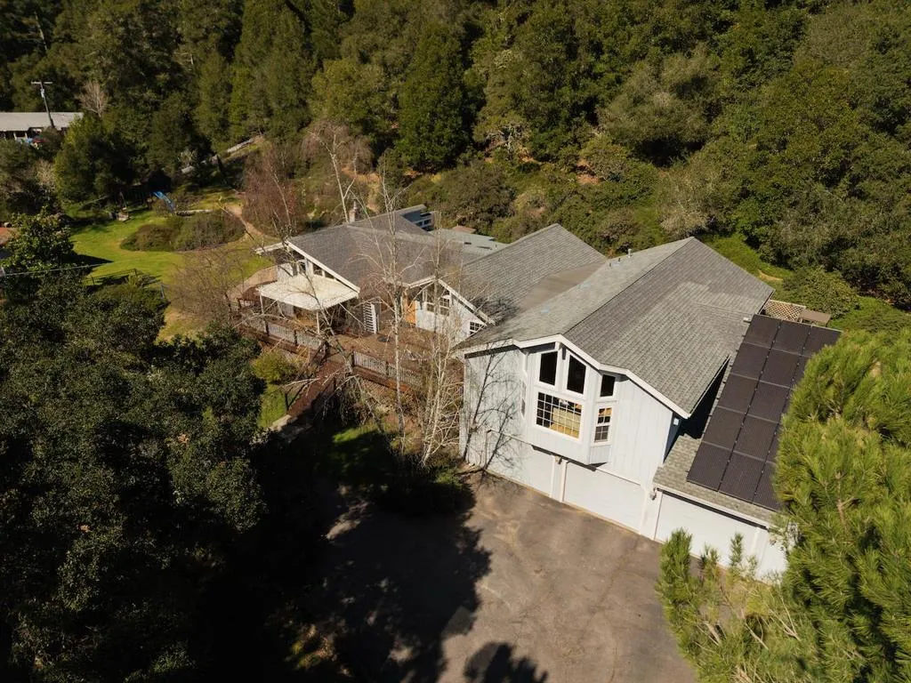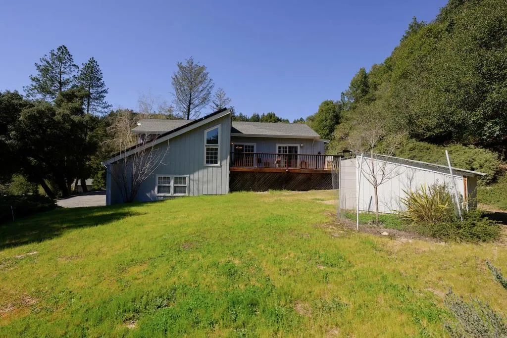 Beautifully remodeled single-level home set on 3 peaceful acres just minutes from town. Step inside the formal foyer and immediately notice the gorgeous Hickory wood floors, soaring vaulted ceilings, and expansive windows that fill the home with natural light. Bright living room features a cozy wood-burning fireplace and French doors leading to the front deck. The spacious kitchen offers abundant Alder Wood cabinetry, granite slab counters, and stainless-steel appliances, flowing seamlessly into the expansive family room with vaulted ceilings, large windows, a cozy hearth, and bar area an ideal gathering space. The formal dining room opens to a private deck perfect for morning coffee or al fresco dining. The primary suite features a large walk-in closet, beautifully tiled en suite with double sinks, and direct yard access. Four additional guest bedrooms and two full baths offer plenty of space, including one oversized bedroom with private deck access. Enjoy a beautifully hardscaped patio surrounded by blooming gardens, plus fenced garden beds, chicken coop, shed, and play structure. 3-car garage with EV charger, owned solar with battery backup, newer electrical and plumbing, private well with filtration. AWARD WINNING schools, near shopping, trails, beaches, and Silicon Valley.