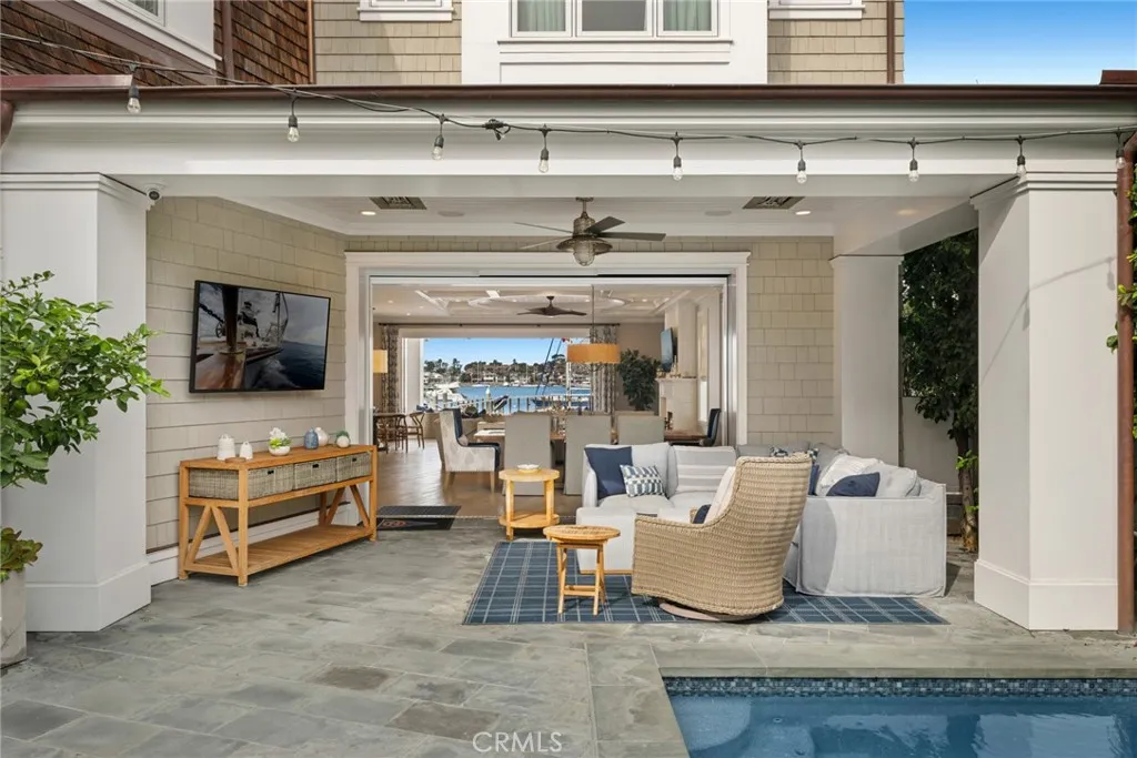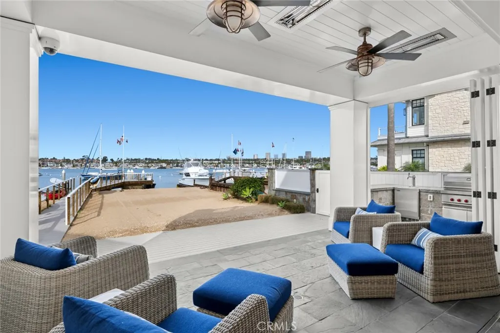 Exquisite panoramic sapphire views are on display from almost every room in this idyllic coastal home. Custom designed by Brandon Architects and completed in 2017 by premier homebuilder Spinnaker Development, this immaculate property has a spacious open floor plan, clean lines, and modern amenities. The luxury residence has a soothing neutral palette of colors and custom finishes throughout, including: a walk-in wine room highlighted with glass walls; custom cabinetry; coffered ceilings; an expansive laundry room with built-in dog bath; and beautiful stone, marble, and tile work. The opulent primary suite with balcony has a prominent location highlighting sweeping views of the bay and the peaceful morning sunrise. Three additional oversized bedroom suites, and office, and an attached four-car garage provide spacious accommodations for daily living, while an interior courtyard with a private pool, spa, and water feature, an adjacent billiard or bonus room with a wet bar, a chef’s kitchen, and a great room opening to a loggia on the sand, all provide the ideal backdrop for relaxing with family and friends. Disappearing doors open up the entire first floor of the home to the interior courtyard and the beach. This exceptional Cape Code inspired home sits on one of the largest bayfront lots on Peninsula Point at 7,424 square feet, a corner lot approximately three times the standard bayfront lot, and has only one neighbor to the west. Its expansive private bay beach and dock fronts the largest width of Newport Bay, providing premium views of summer yacht club races through the harbor and the annual holiday boat parade, as well as ample space to sink your toes in the sand, cool off with a quick dip in the bay, take out a paddleboard, or sail away the day. The dock is approved for up to a 55-foot boat. This is a tremendous opportunity to enjoy the finest in Bayfront living and the coveted Newport Beach lifestyle in close proximity to Balboa Village, luxury retail, fine dining, and world-class beaches.