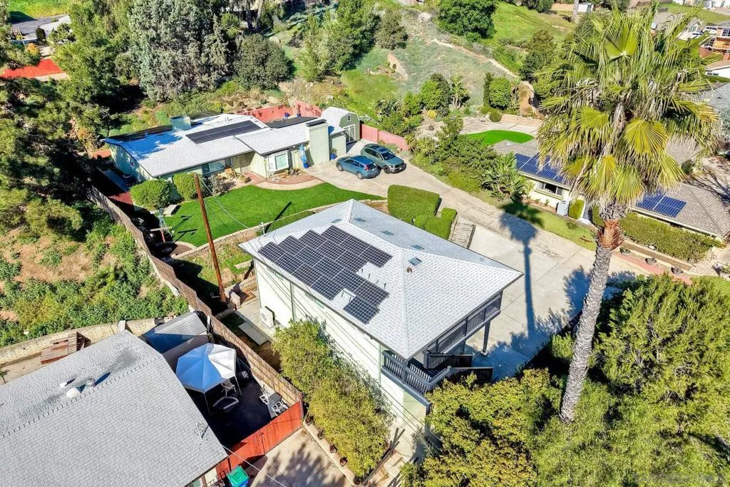 2 incredible homes equal huge opportunity on a large sloping 1/2 acre lot, plus finished 3-car conditioned garage/ workshop . The original home is a single-level ranch home high on slope with 3bd /2ba (2269sf) and large backyard . The newer 2019 home is nearly 1000sf above a fully finished 3 car garage permitted as 2bd/1ba . The large garage has been fully finished with drywall, lighting, and AC and is ideal space for home business or additional unit . Barn storage unit conveys to buyer and provides additional storage. Surrounded by mature trees and mountain vistas, this property is ideal for a multi-generational family to share and still have plenty of privacy and space, or for owner to live in one home and rent the unit. Parking for 10+ cars! Upgrades include paid solar(!), hardwood floors, new windows throughout, beautiful new kitchen, immaculate new landscaping, separate dining room, a formal living room, and huge family room with a 25' stone fireplace! Each home has own driveway with separate parking areas for 3-5 cars and privacy. New owner could possibly convert some of the garage space to a Jr. ADU for a total of 3 living spaces. The front home offers a covered patio at the back with an open lawn area and plumbed fire-pit before rising to a hillside and additional flat usable space at rear of lot, with mature landscaping. Newly fenced backyard is accessible with stairs at top of lot. SCHOOLS: Steele Canyon High or Valhalla High is just 4 blocks away, are both in the highly rated Grossmont School District. Rancho San Diego Elementary and Hillsdale Middle School are also or a short walk or bike ride nearby. NOTES: The new ADU above garage is currently 972sf 1bd/ 1ba home with a full kitchen, separate dining area, and vinyl flooring throughout. 2nd bedroom is easily created with a single 12' non-load bearing wall in what is currently open office space (see plans). Contractor quote to add wall is available. SOLAR: The new home above garage includes owned solar panels installed in 2019 and larger home also has leased solar panels ($145/mo). Buyer must qualify to take over Sun Run lease. A new 200A electrical panel and separate sub-panel serves both homes off of a single meter.