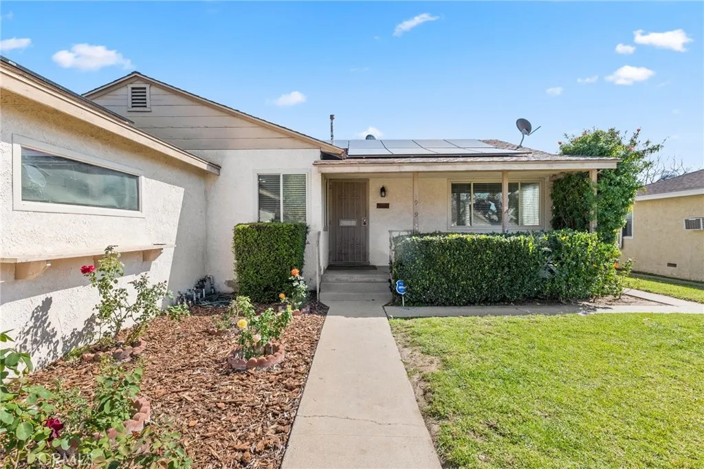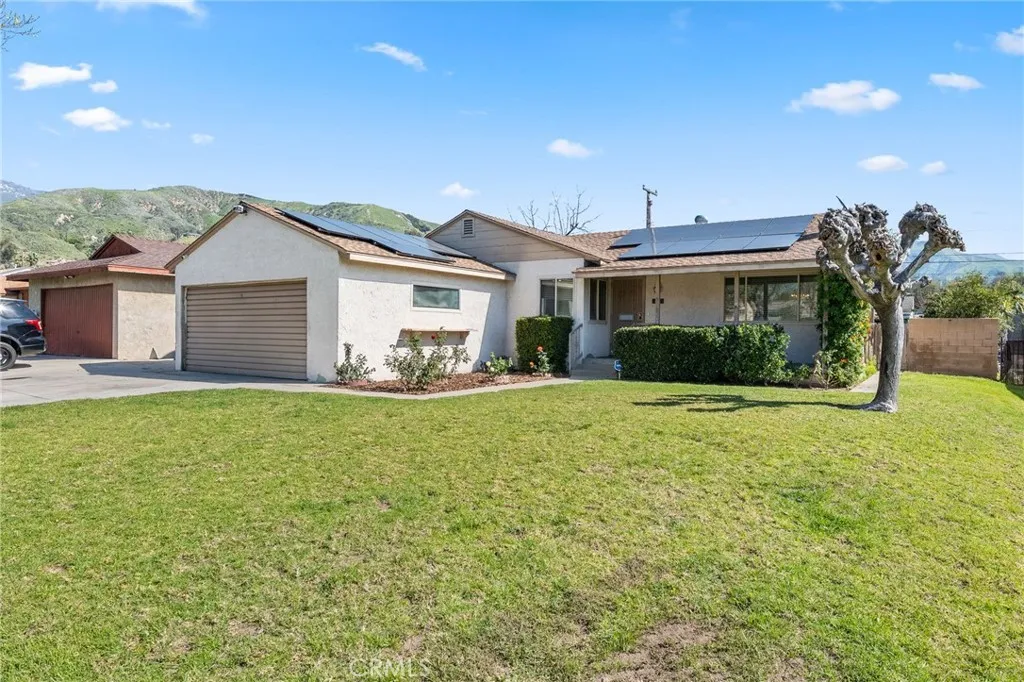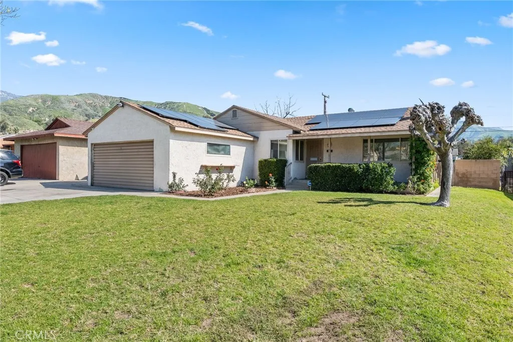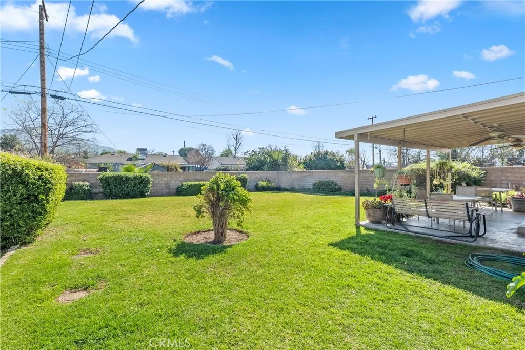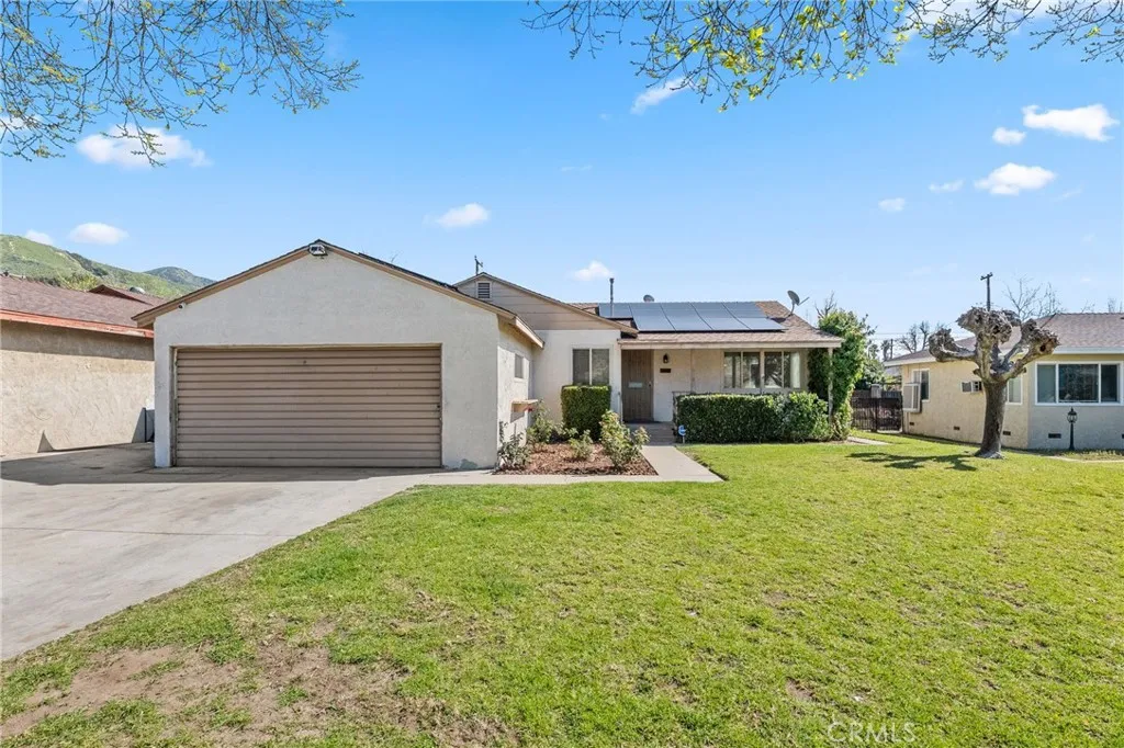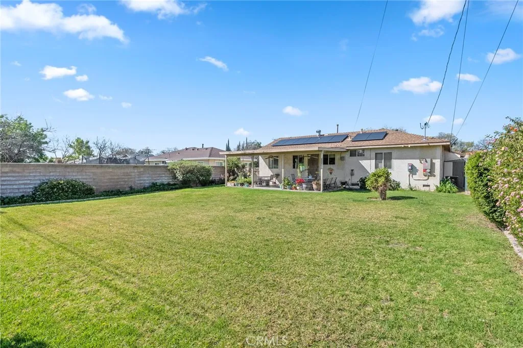 Welcome to this well-maintained 3-bedroom, 1-bath home in San Bernardino offering inviting curb appeal and thoughtful upgrades throughout. A spacious cement driveway leads to the 2-car garage, with a clean cement walkway guiding you to the front entrance. The landscaped front yard features a lush lawn, and neatly trimmed hedges, creating a warm and welcoming first impression. The white stucco exterior is complemented by a reddish-brown shingle roof and solar panels for added energy efficiency. Inside, you’ll find comfortable carpet flooring throughout the living and dining areas, including newer carpet in the living room, approximately 6 months old. The kitchen features rich brown cabinetry, with white tile countertops and backsplash, and comes equipped with a stove that is approximately 3 years old. All three bedrooms are well-sized and conveniently located near the full bathroom, offering practical functionality for families, guests, or a home office setup. Major system upgrades provide peace of mind: the HVAC condenser was replaced about 2 years ago, the water heater is brand new, and the electrical panel has been upgraded to 220V, with new electrical wiring run throughout the home. Additionally, the sewer line in the yard has been redone—an important improvement that adds long-term value. Step outside to a spacious backyard designed for relaxing or entertaining, featuring a large covered patio over a concrete slab and a beautifully landscaped lawn. Cement block walls offer privacy, accented by trimmed hedges and mature shrubbery for a clean, finished look. With solid upgrades, energy efficiency, and inviting outdoor space, this home is ready for its next owner to make it their own.