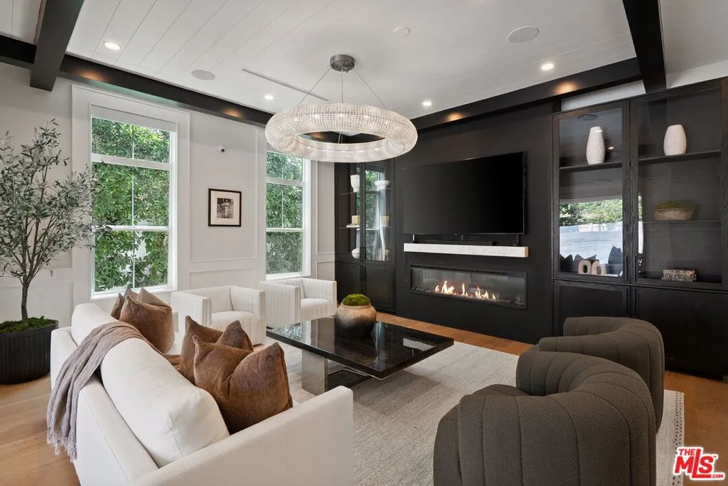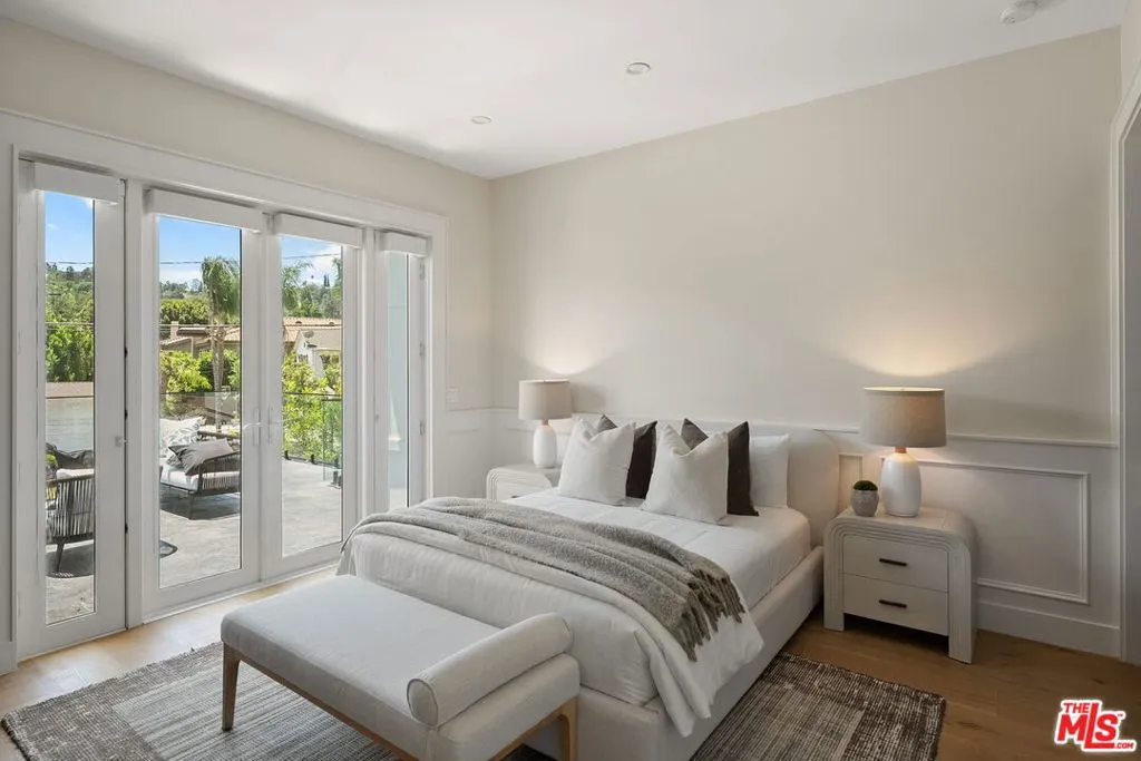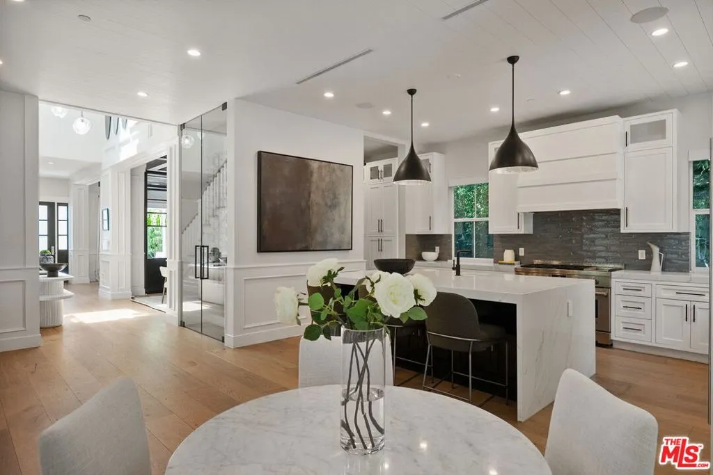 Welcome to the perfect combination of classic East Coast elegance, seamlessly blended with modern California living. Privately gated and masterfully crafted, this five-bedroom, five-bathroom estate is situated on the quietest section of Valley Vista Blvd. Spanning over 3,600 square feet of refined interiors and resort-caliber amenities, this home offers elevated living at every turn. A gated front courtyard welcomes you into a serene garden sanctuary featuring lush landscaping, a vegetable and flower garden, and a peaceful sitting area. Step inside the grand foyer where ceilings soar over 20 feet, accented by intricate moldings, a dramatic statement staircase, and hand-blown glass chandelier. Wide-plank European oak floors in rich natural tones contrast beautifully against bespoke black coffered ceilings, setting the stage for timeless sophistication. Anchored by a massive center island with waterfall edge quartz countertops, the entertainer's kitchen is outfitted with premium JennAir appliances, custom cabinetry, two separate sinks, and a built-in wine display wall. The center island is suitable for large brunches or a quick after-school snack. The space flows seamlessly into the sun-drenched breakfast area and inviting family room with modern electric fireplace and an indoor-outdoor experience through expansive glass accordion doors. Upstairs, the primary suite is a private retreat with a fireplace, vaulted ceilings, and French doors opening to a sprawling balcony with treetop views. The spa-inspired bathroom offers a freestanding soaking tub, dual vanities, oversized shower for two, and boutique-style walk-in closet. Additional bedrooms on the second floor are all ensuite and beautifully appointed with access to balconies. The backyard is a true oasis complete with a sparkling pool and spa with an ambient waterfall, custom wood decking, built-in barbecue, covered patio, and multiple areas for lounging and entertaining. Additional features include a spacious main-level guest suite, upstairs laundry room, Sonos sound system, smart home technology ready, automatic blackout shades, wired security system with interior and exterior cameras, and a two-car garage with direct entry. This home offers easy access to Encino's finest amenities including top-rated schools, Equinox, Trader Joe's, Encino Commons, Balboa Park, Los Encinos State Historic Park, El Caballero Country Club and the 101 freeway. Whether you are dining out, shopping, or seeking nature and wellness, everything is just minutes away.