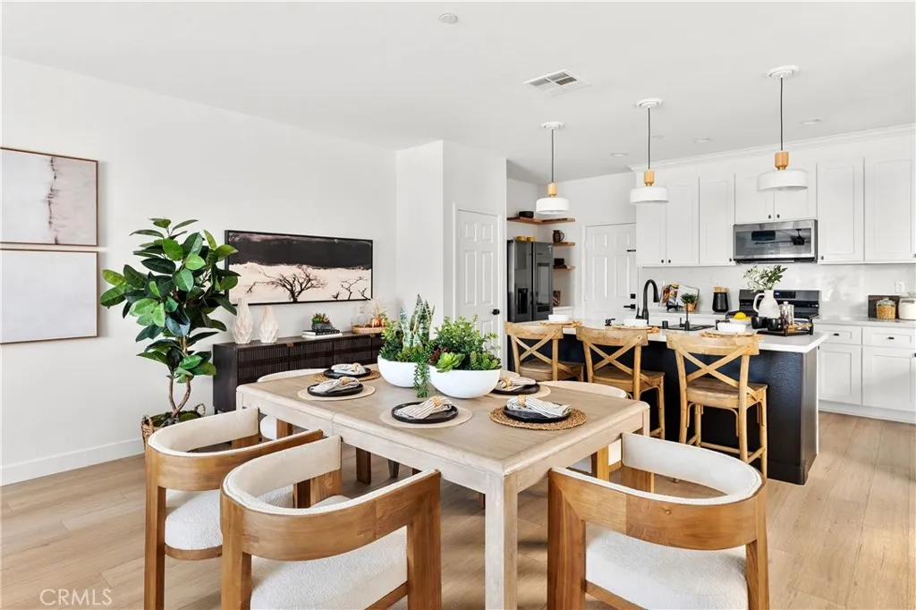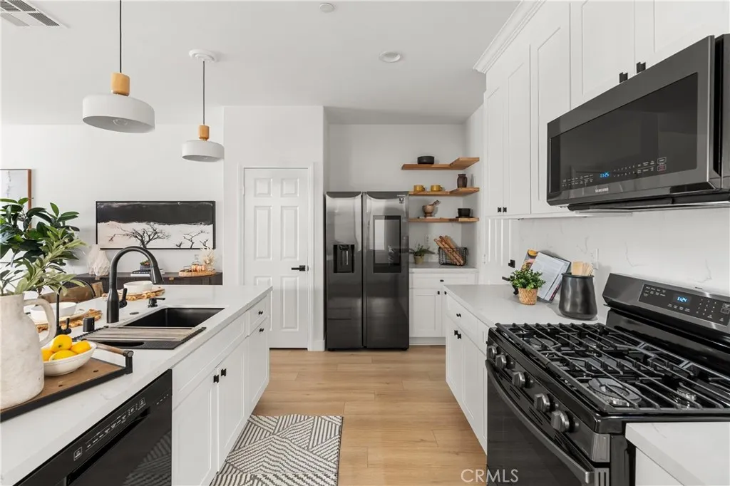Behind the gates of The Enclave, this thoughtfully curated KB Home offers a refined expression of modern California living. Spanning approximately 1,895 square feet, the home unfolds with an expansive great room concept where living, dining, and kitchen spaces connect seamlessly. Light toned luxury vinyl plank flooring, ceiling height cabinetry, Scandinavian inspired pendant lighting, and newer Samsung appliances create a cohesive contemporary aesthetic. A well positioned powder room completes the main level. Upstairs, a versatile loft space anchors four bedrooms and two full baths, including a primary suite with a private en suite bath and a custom walk in closet by California Closets. The backyard is designed for simplicity and privacy, featuring a covered patio and low maintenance landscaping. A finished two car garage with epoxy flooring and EV charging adds everyday functionality. Residents of The Enclave enjoy gated access along with community amenities including a pool, spa, clubhouse, parks, and manicured greenbelts.