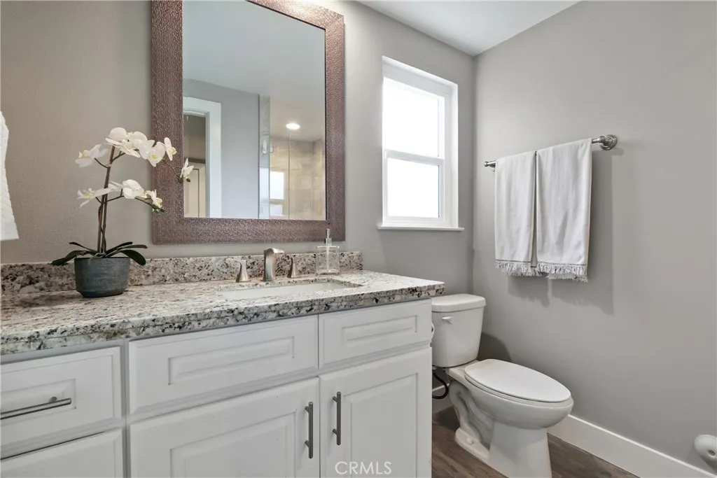 This beautiful 5-bedroom, 3-bath home offers a thoughtfully designed living space that has been completely remodeled throughout. Step through the double-door entry into an inviting open floor plan filled with natural light, where the living, dining, and kitchen areas all flow seamlessly together to create a warm and connected atmosphere. The showstopping 13-foot kitchen island is an impressive centerpiece featuring granite countertops and a stacked-stone accent finish—perfect for meal prep, hosting, or gathering. The updated kitchen offers soft-close cabinets and drawers, a built-in spice rack, pantry, granite countertops, stainless steel sink, and appliances which include a double oven, microwave, and gas cooktop. Custom wood-look tile flooring spans the entire main level. Double-pane windows enhance energy efficiency, while central A/C, heat and a whole house attic fan provide year-round comfort. The living room boasts a floor to ceiling custom stacked stone fireplace. Two spacious bedrooms are located on the main floor behind a private door, offering flexible living options for guests, workspace, or multi-use needs. The first-floor bathroom features a convenient walk-in shower. The laundry room includes a utility sink and plenty of storage. The entire interior has been freshly repainted for an updated and move-in-ready finish. Upstairs, brand-new carpet leads to three additional bedrooms, including a spacious primary suite with a walk-in closet and dual-sink vanity. Mirrored sliding closet doors are featured throughout. All bathrooms have been updated with beautiful mirrors, vanities, granite countertops, custom tile showers, and thoughtfully designed niches. At the top of the stairs you’ll find an additional closet and a large linen cabinet. The private backyard offers a peaceful retreat with two mature avocado trees providing shade and seasonal enjoyment—ideal for relaxing or entertaining. The property includes a detached 2-car garage, space to park two additional vehicles in front of the garage, and a 9.5-foot gate accommodating RV, boat, or trailer parking. Situated directly across from the scenic Santa Ana Riverbed biking trail—with access routes toward Newport and Huntington Beach as well as charming Old Town Orange. The home also provides easy access to the 91, 55, and 57 freeways, local schools including Fletcher Elementary (dual immersion program), Villa Park High School and Orange Lutheran High School are just minutes away.