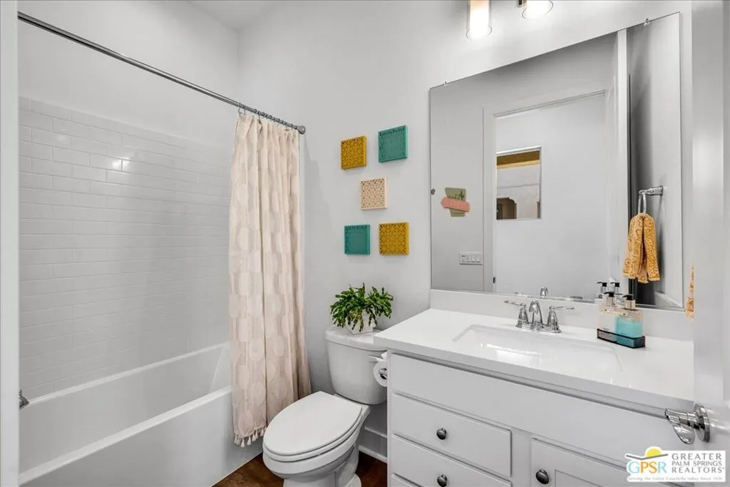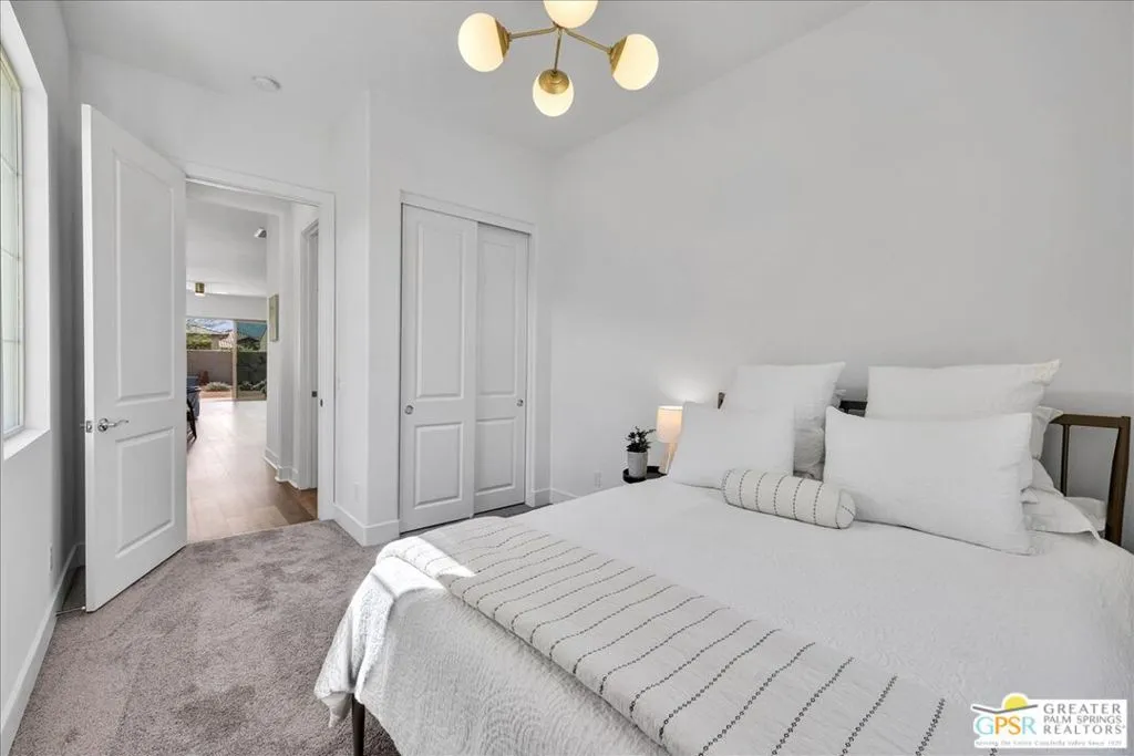 Light-Filled Phase 4 Getaway with Expansive Yard & Mountain Views! Welcome to this beautifully appointed Phase 4, Plan 1 Getaway floorplan, offering an exceptional blend of comfort, style, and mountain views. With a spacious POOL SIZED YARD and stunning mountain backdrop, this light and bright residence is thoughtfully designed for relaxed resort-style living. Inside, a fresh white palette creates a clean, modern aesthetic, complemented by upgraded 5-inch baseboards, luxury PLANK VINYL flooring, and BRAND-NEW CARPET throughout. The home feels crisp, inviting, and move-in ready. The kitchen has been tastefully upgraded and serves as the heart of the home, featuring 42-inch upper cabinetry, QUARTZ COUNTERTOPS, and a KitchenAid Professional Series appliance package. A generous island peninsula with an apron-front sink, additional pendant lighting, and ample seating makes it perfect for entertaining or casual dining. The kitchen flows seamlessly into the GREAT ROOM, where living and dining spaces come together in an open, light-filled setting with contemporary finishes and beautiful sightlines to the outdoors. The primary suite offers brand-new carpeting and tranquil views of the yard and surrounding mountains. The ensuite bath is both elegant and functional, featuring dual vanities, a spacious stall shower with bench seating, and generous closet space. Privately positioned on the opposite side of the home, the guest bedroom provides comfort and separation for visitors, with convenient access to a full secondary bath. Additional highlights include a dedicated laundry room with Samsung washer and dryer, Cat6 internet connections in the living room, primary suite, and guest bedroom, and leased SOLAR ($90.56 Mo) for enhanced energy efficiency. Located within the prestigious 55+ Del Webb Rancho Mirage community, residents enjoy access to a spectacular clubhouse, state-of-the-art fitness center, resort-style pool and spa, tennis and pickleball courts, and a vibrant calendar of social activities. Beautifully maintained, thoughtfully upgraded, and ideally positioned to capture mountain views - this is desert living at its finest. Note: Calbe and Internet package nwo included in HOA Fee!