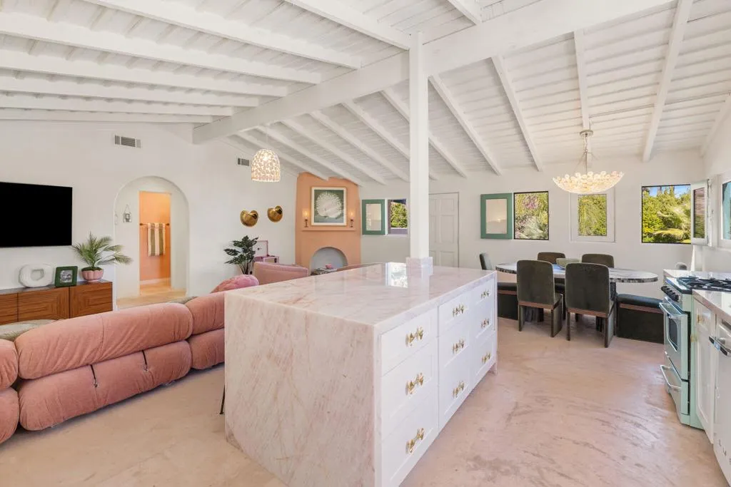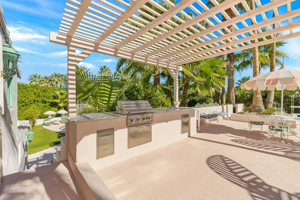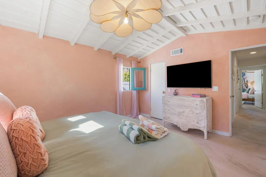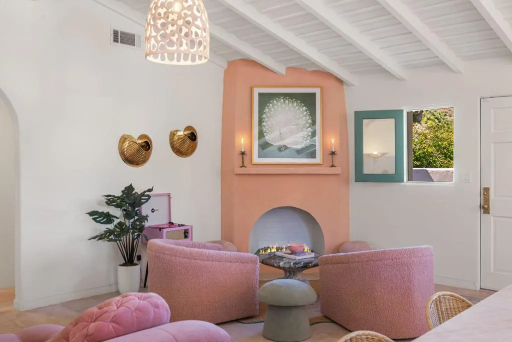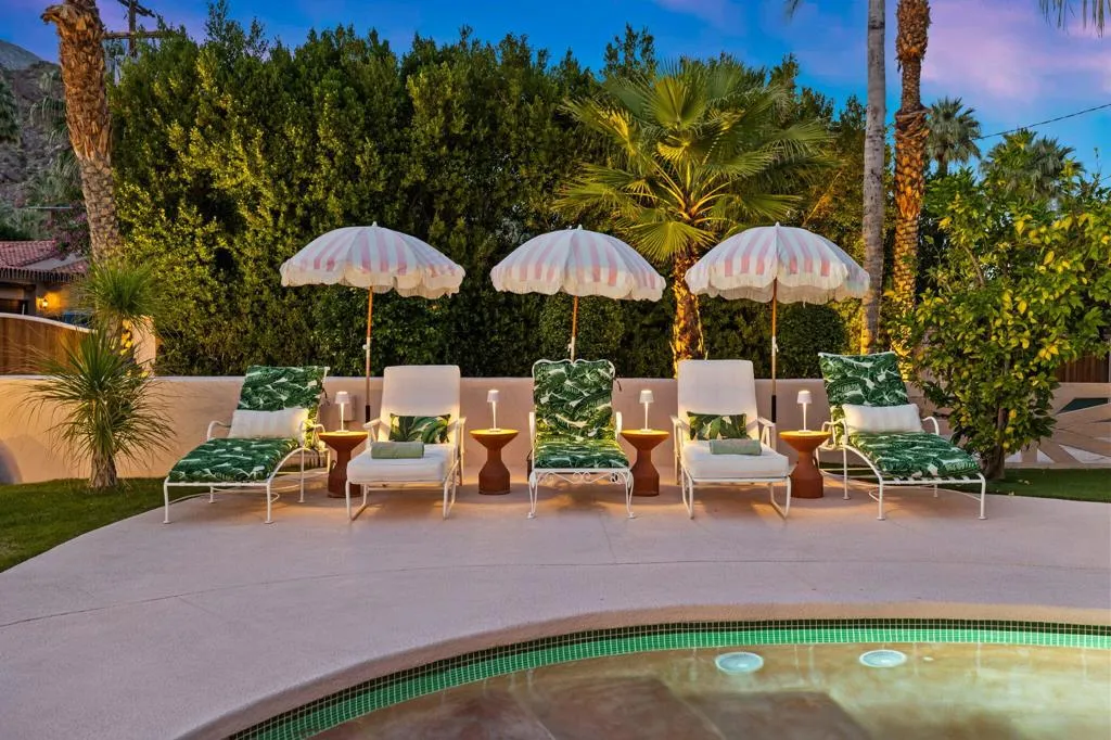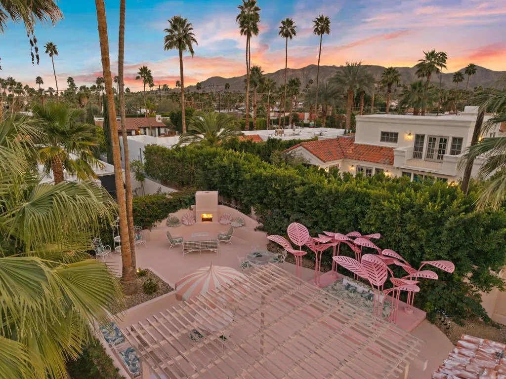The Mesa Bungalows is a bold and iconic Palm Springs estate, privately gated and set in the coveted neighborhood of The Mesa in South Palm Springs. Originally built in 1937, this Spanish style villa was designed as both a showpiece and a resort-style retreat, with a vintage pink and green palette inspired by the Beverly Hills Hotel and Jayne Mansfield's iconic Pink Palace. The outdoor experience is nothing short of extraordinary--featuring a custom putting green, a pink kidney-shaped pool and spa with a cascading rock waterfall, an ornate gazebo, and water fountain. An upper level entertaining space showcases a built-in BBQ, fireplace, and a daybed shaded by large pink metal palm fronds. Inside, the home continues its unapologetically chic aesthetic with a fully curated pink interior. The kitchen is outfitted with statement-making Smeg appliances and bold pink quartz countertops, blending playful glamour with modern sophistication. Four separate en-suite bedrooms sprawl the two levels of the home, including one with its own private sun deck overlooking the property. Every detail has been carefully considered to celebrate color, design, and the indoor-outdoor lifestyle Palm Springs is known for. Striking, expressive, and undeniably exclusive, Mesa Bungalows is not just a home--it's a destination, a statement, and a true Palm Springs original perfect for short-term rentals or a private getaway. Schedule your tour today!