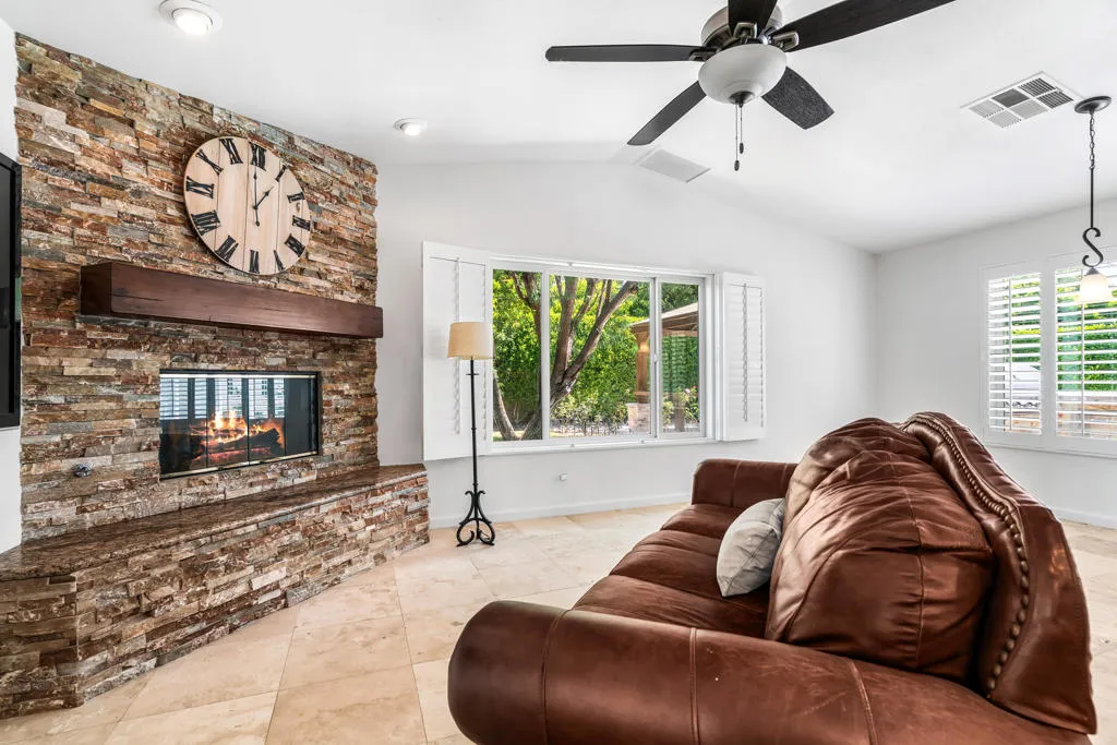 Your own private park in this Mediterranean Mini-Estate surrounded by complete privacy hedges on nearly a 1/2 acre corner site conveniently located with parking for 8+ cars, a private pool and spa yard and a wonderful home of over 3000 SF. Total investment is under $368 per sq makes this home an extreme value way under replacement cost. Living room, dining area and wet bar with fireplace and views to the mountain view yard in front and the pool yard in back. A totally outfitted kitchen with abundant cabinets and a double sized island opens to a family room with a fireplace. The poolside primary suite is very spacious with a fireplace, lovely bathroom with separate walk-in shower and soaking tub and a very large walk-in closet. Two more bedrooms with French Doors opening to the grassy yard and hall bath with dual sinks. The bonus room could be a 4th bedroom and there is also a den, formal dining room or office with bookshelves built. 3 car attached garage with storage plus two detached storage buildings. Travertine floors throughout, separate laundry room and powder bath. The backyard yard features a sparkling saltwater pool, spa with waterfall, large BBQ bar, fire pit and inviting Pavilion for Al Fresco relaxation and dining. The front yard has an amazing real grassy yard with shade trees, fruit trees and swaying palms. Owned solar system covers 90+% of electricity cost if year-round owner. NO HOA. Perfect home for pets, outdoor fun and privacy,