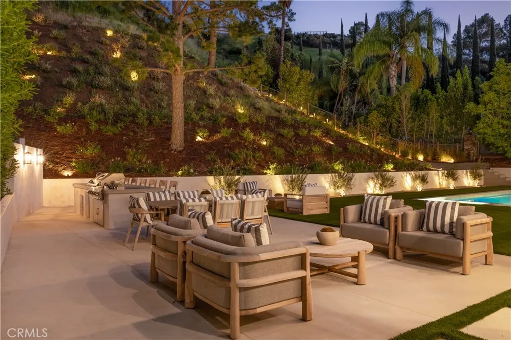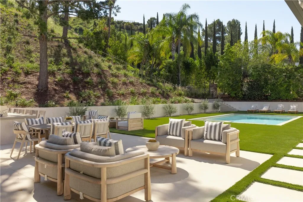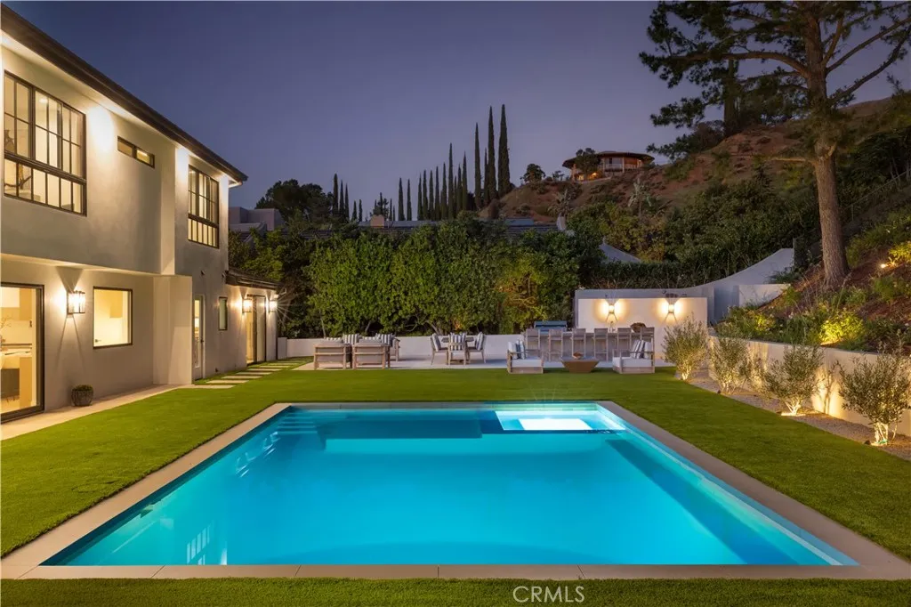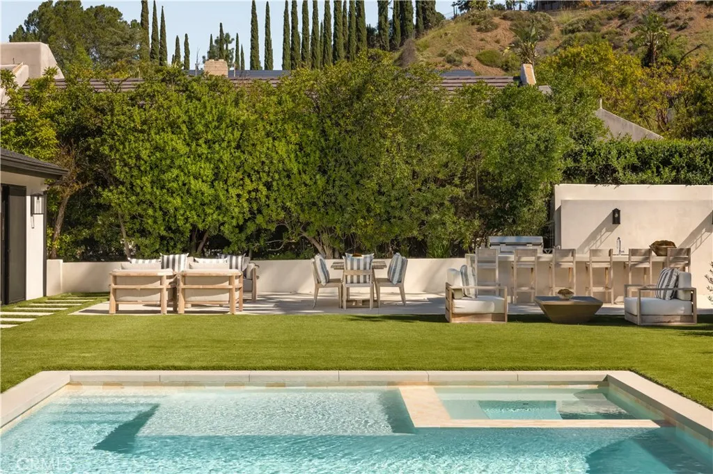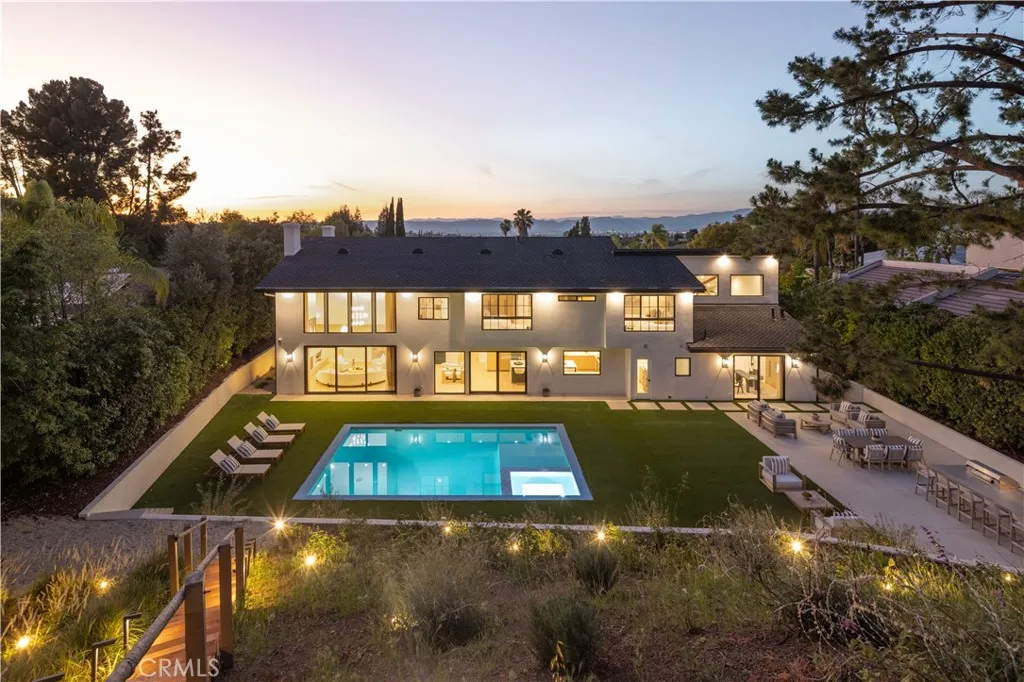 Situated in the coveted hills of Encino, this beautifully redesigned residence offers modern elegance, privacy, and sweeping views. Originally known as the iconic “Karate Kid House,” featured in the classic film The Karate Kid, the property carries a unique piece of Hollywood history while now showcasing a thoughtfully reimagined modern living experience. A welcoming entry introduces soaring ceilings, a striking staircase, and wide plank wood flooring that flows throughout the home. Generous living and entertaining spaces are framed by large windows that fill the interiors with natural light while capturing lush greenery and scenic hillside vistas. Living areas are anchored by sleek fireplaces, creating warm and inviting environments ideal for both everyday living and entertaining. The gourmet kitchen is thoughtfully designed with custom cabinetry, high end appliances, a large center island with seating, seamlessly opening to the surrounding living and dining spaces. Upstairs, a spacious recreation room with vaulted ceilings and exposed wood beams offers a versatile gathering space perfect for a media lounge, game room, or relaxed family living. The primary suite provides a peaceful retreat, featuring a spa inspired bathroom with a soaking tub, oversized shower, dual vanities, and an expansive walk-in closet. Designed for both entertaining and everyday enjoyment, the backyard offers a true resort like setting with a pool and spa, multiple lounge and dining areas, an outdoor kitchen and BBQ, and lush landscaping that extends up the hillside, creating a private outdoor environment with beautiful mountain and canyon views. Located just minutes from Ventura Boulevard’s premier dining, shopping, and entertainment, this Encino Hills property presents a rare opportunity to own a home that blends modern luxury, scenic views, privacy, and a piece of cinematic history in one of the Valley’s most sought after neighborhoods.