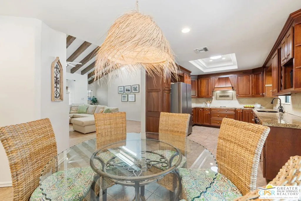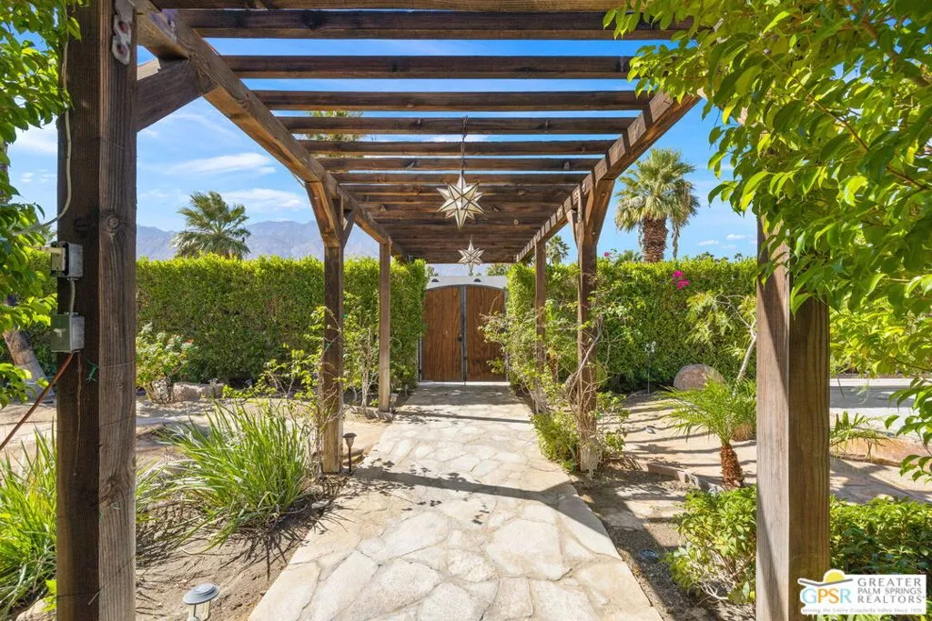 DESERT HIDEAWAY! Walled and gated for seclusion, this FURNISHED three bedroom, three bath ranch style residence unfolds with tall beamed ceilings, warm textures, and an easy indoor outdoor rhythm. Beyond the walk gate, a pergola draped in bougainvillea sets a romantic arrival framed by mountain views to the west. The front porch hints at the character within where the living room showcases a handmade Moroccan tiled fireplace, clerestory skylight, and those signature beams overhead. The dining area and kitchen open to an elevated veranda overlooking the pool and spa, a sun drenched setting designed for the desert good life. Pebble finished pool with its playful bridge, generous patio space, and multiple lounging zones create a relaxed resort atmosphere, complete with a newer BBQ ready for entertaining. The primary suite features vaulted ceilings, two closets including a large walk in, and direct pool access. Guest quarters enjoy thoughtful separation with one ensuite and another capturing the San Jacinto view. Newer copper plumbing in place from 2022. Tesla leased rooftop solar system in place. Set within Desert Park Estates on fee land, you own it. The generous lot and covered parking for four cars behind the drive gate complete this inviting Palm Springs retreat. Uptown Palm Springs and its vibrant scene are a short hop away.