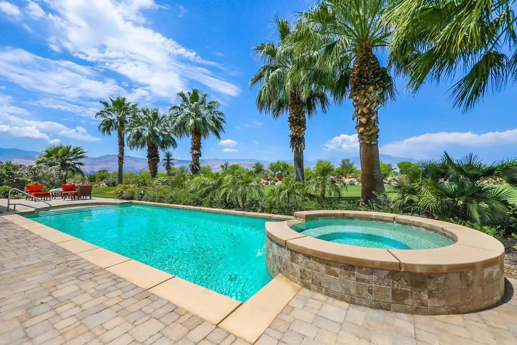 Inside Toscana Country Club, this beautiful home sits on an oversized, cul-de-sac lot close to Club amenities and offers over 3,300 sq.ft of desert living. With unobstructed west mountain views, this home features luxuries such as additional views of the Hole 9 fairway of the Jack Nicklaus Signature North Course; lush, mature landscaping for a private oasis feel; two sets of floor-to-ceiling pocket doors for indoor-outdoor living; three-sided wetbar with butted-glass for maximum views; outdoor built-in BBQ and bar; custom pool & spa; roll-down shade for the covered patio; and more.At the heart of the home, the light and bright greatroom with fireplace flows seamlessly into the kitchen and dining area, perfect for entertaining. The gourmet kitchen features ample cabinetry, granite countertops, island, peninsula with breakfast bar, and breakfast nook. Stainless steel SubZero Wolf appliances include double oven, refrigerator, and drop-in four-burner range with center griddle + hood.Relax in the primary suite that offers a sliding glass door to its own covered patio, and an en-suite showcasing a granite-surround soaking tub, separate sinks with spacious countertops and vanity, walk-in closet, and walk-in shower. Guests can retire to the secluded guest house complete with sitting area, built-in cabinetry, and en-suite bath. In the main home, two guest rooms are available: one was architecturally expanded an additional 125 sq.ft. to be used as a media and workout room.