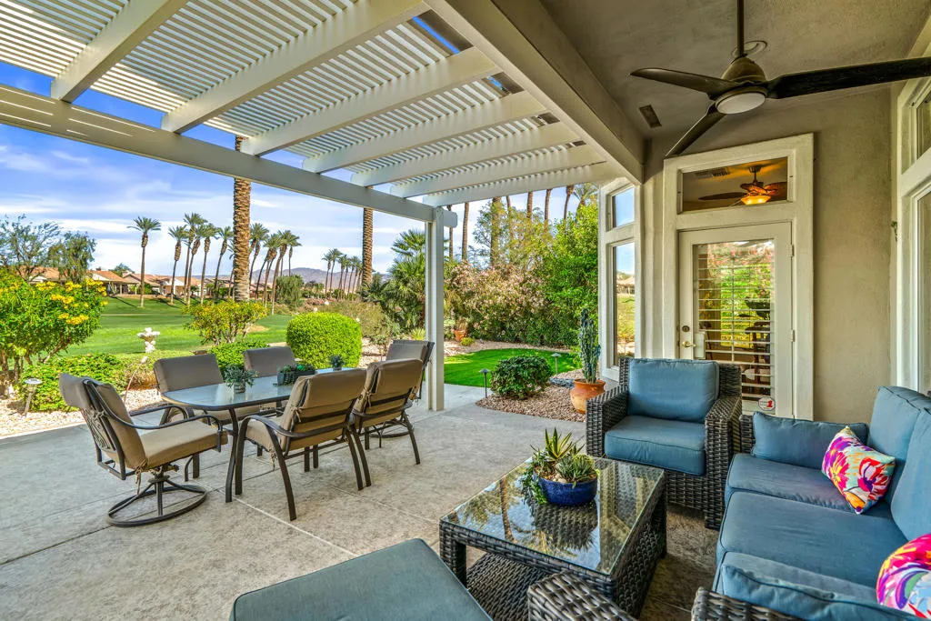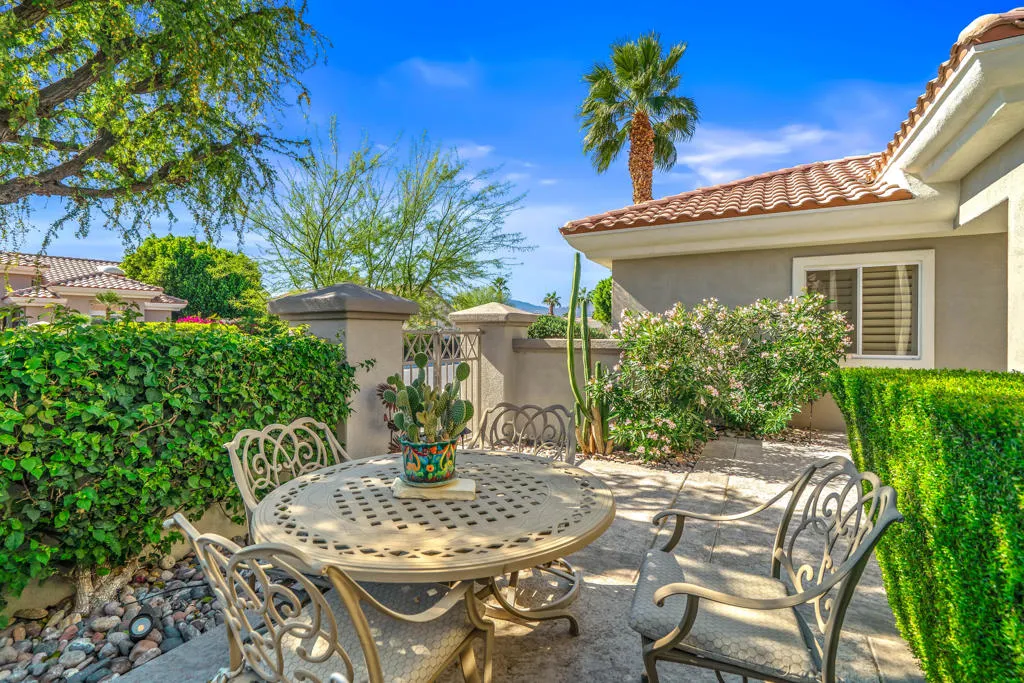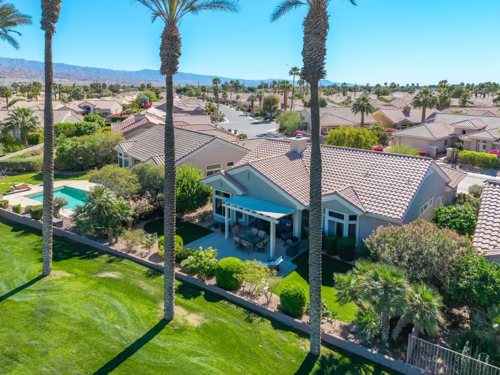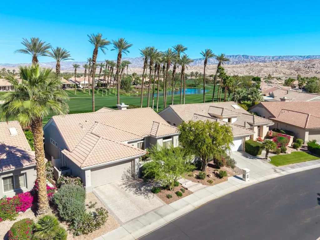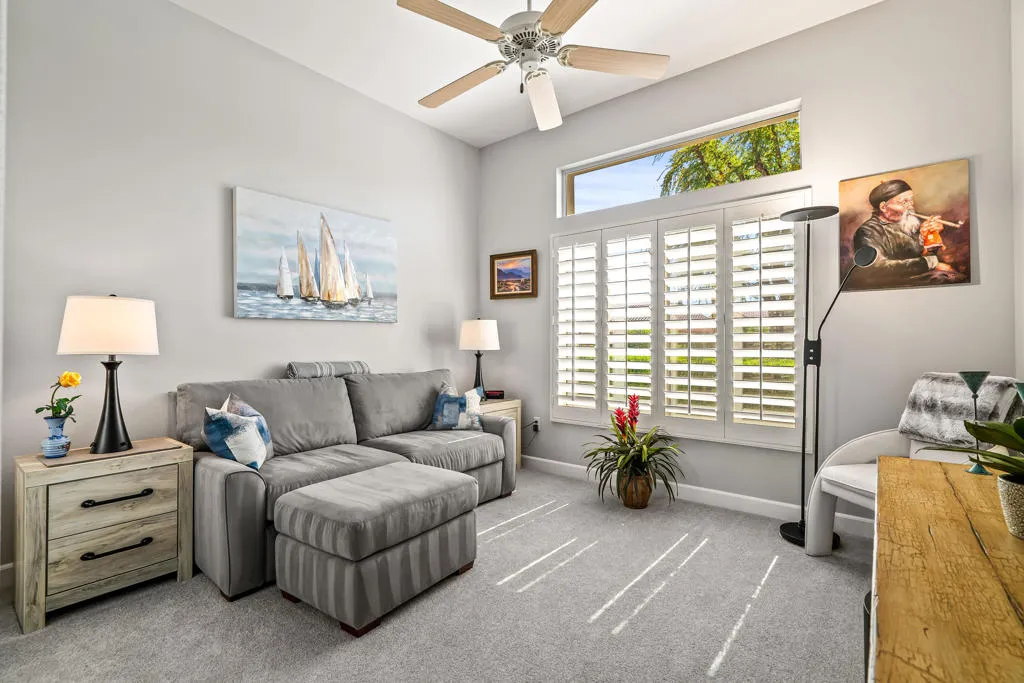 Welcome to this beautifully designed home in the community of Sun City Palm Desert, featuring a gated courtyard entry and stunning views of the Santa Rosa course from most rooms and the backyard. This home blends comfort, style, and numerous upgrades throughout.The remodeled kitchen showcases quartzite (natural stone) countertops, soft-close cabinets, transom windows, recessed and pendant lighting, a breakfast bar, and a double pantry. Luxury plank flooring runs throughout the main living areas, complemented by plantation shutters, ceiling fans, and a cozy gas fireplace in the living room.The well-designed floor plan offers privacy, with the guest bedroom and upgraded full guest bath located away from the primary suite. Double doors lead to a versatile den/office or optional third guest space. The primary suite features quartz countertops, a walk-in closet, and golf course views.Additional highlights include custom hallway storage with built-in shelving and cabinets, and a laundry room with cabinetry and a utility sink. The garage is complete with a golf cart nook, mini-split system, 240V line for EV charging, added outlets, and extra storage.Enjoy outdoor living with an extended Alumawood patio cover, motorized drop shades, a grassy area, and a concrete overlay overlooking fairway, mountains, and lake views.Most furnishings are available for purchase outside of escrow.