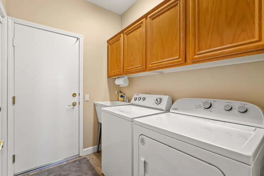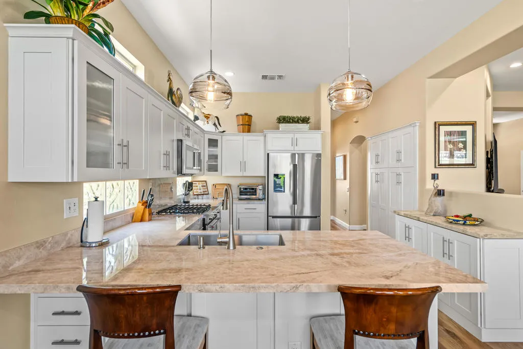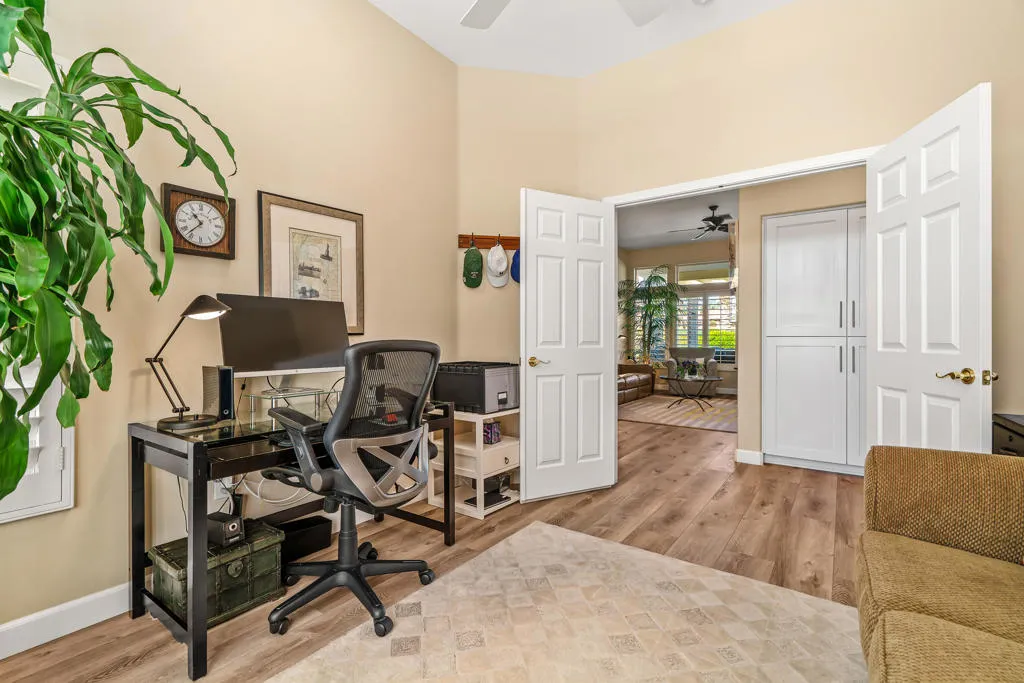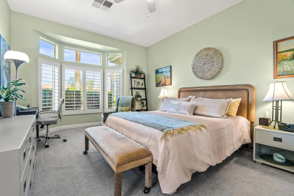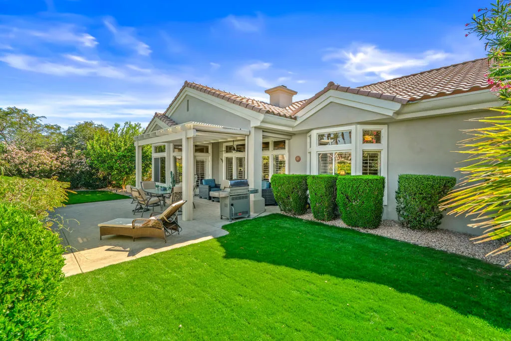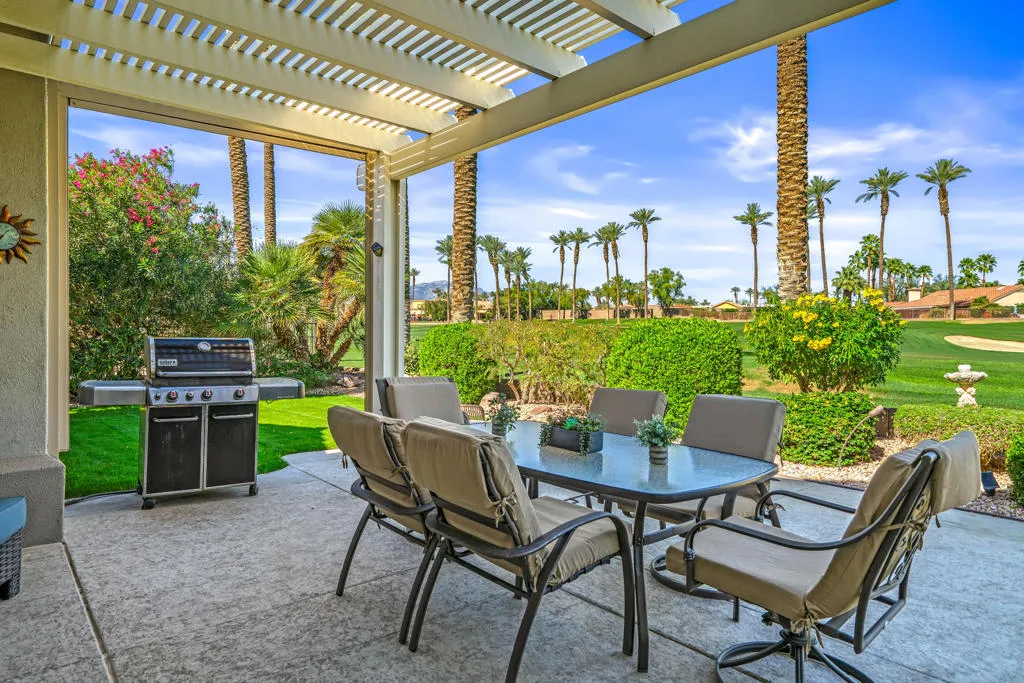 Welcome to this beautifully designed home in the community of Sun City Palm Desert, featuring a gated courtyard entry and stunning views of the Santa Rosa course from most rooms and the backyard. This home blends comfort, style, and numerous upgrades throughout.The remodeled kitchen showcases quartzite (natural stone) countertops, soft-close cabinets, transom windows, recessed and pendant lighting, a breakfast bar, and a double pantry. Luxury plank flooring runs throughout the main living areas, complemented by plantation shutters, ceiling fans, and a cozy gas fireplace in the living room.The well-designed floor plan offers privacy, with the guest bedroom and upgraded full guest bath located away from the primary suite. Double doors lead to a versatile den/office or optional third guest space. The primary suite features quartz countertops, a walk-in closet, and golf course views.Additional highlights include custom hallway storage with built-in shelving and cabinets, and a laundry room with cabinetry and a utility sink. The garage is complete with a golf cart nook, mini-split system, 240V line for EV charging, added outlets, and extra storage.Enjoy outdoor living with an extended Alumawood patio cover, motorized drop shades, a grassy area, and a concrete overlay overlooking fairway, mountains, and lake views.Most furnishings are available for purchase outside of escrow.