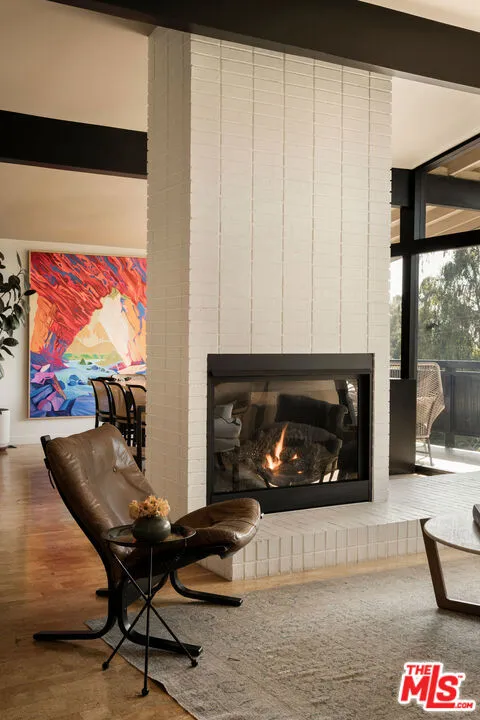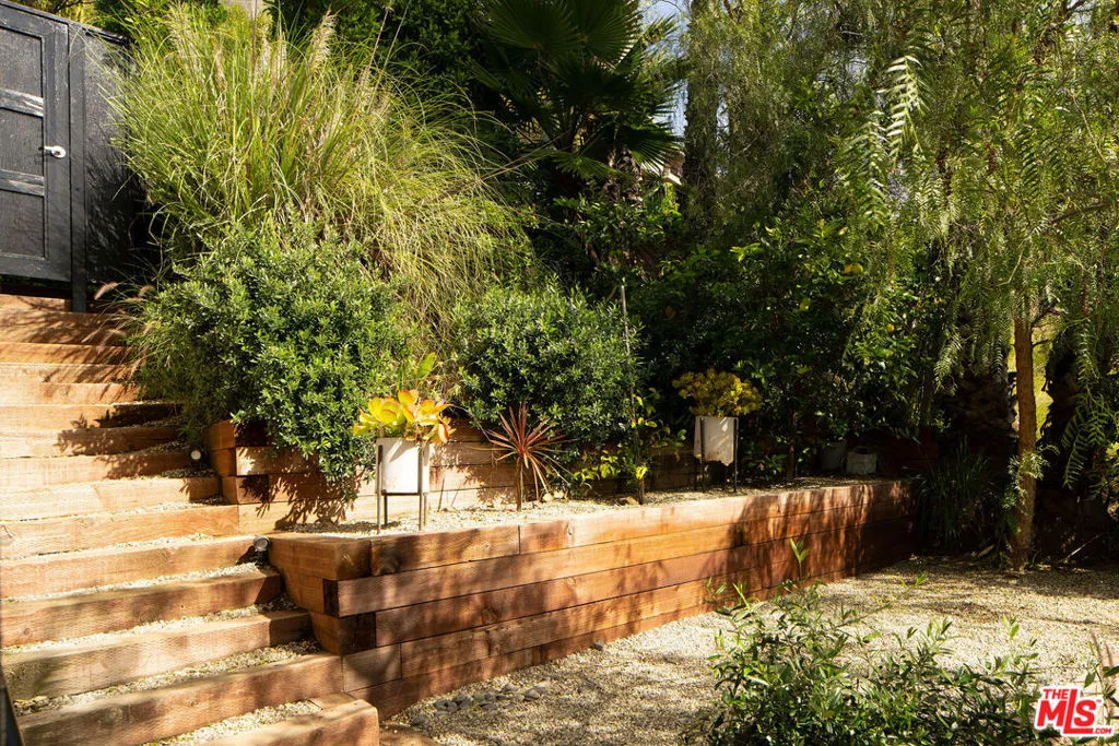 Located in Nichols Canyon with breathtaking hillside views, this 1960 post and beam home has been expertly renovated and restored by Chris Salay, and sits on a fully gated and fenced corner lot, landscaped to perfection. The home features 3 bedrooms, 2 full bathrooms, a detached lower studio with its own full bathroom, and 510 square feet of finished storage space. Set just below the iconic Lautner Garcia House, the home's architectural elements include dramatic pitched ceilings, imported cork flooring, terrazzo-tiled bathrooms, custom-built-ins throughout, and floor-to-ceiling windows in the main living space that frame wide mountain vistas. Private, serene, and impeccably designed, the home offers idyllic canyon living. Beyond the secure front gate, the home opens to reveal its classic post and beam structure on full display. Striking vaulted ceilings and floor-to-ceiling windows with windowed doors lead to a long upper deck with unobstructed, panoramic hillside views. A center brick fireplace anchors the main living space, separating the dining area from the formal living room. The living room and adjacent den offer separate areas for hosting and relaxation, both with custom built-in shelving. The kitchen features custom-built dark wood cabinetry that complements the home's architectural style. The top-of-the-line appliance suite includes a Sub-Zero refrigerator, a Thermador beverage column, Bosch dishwasher, and a Dacor gas range. Three bedrooms and two full bathrooms are situated down the hallway. The primary suite feels like its own wing, complete with a sitting area, custom fluted-wood built-ins, and sliding doors that open to a private deck with hillside views and a coveted peek at the Garcia House. The ensuite bath layers imported terrazzo flooring with Rosso marble tile, dual sinks, a soaking tub, and a shower. Two additional bedrooms share a bathroom finished with imported terrazzo floors, marble tile, Walnut wallpaper, and a custom wood vanity - equal parts playful and polished. Downstairs, a fully detached, oxblood-drenched studio - the paint color selected by AD100 interior designer Jake Arnold - features imported cork flooring and its own bathroom, offering a versatile space as guest quarters, office, gym, or screening room. An adjacent expansive storage area adds an exceptional amount of storage rarely found in homes in this area. The terraced, street-to-street lot, landscaped by Andrea Scharff, unfolds with citrus trees, a fully fenced yard, walking paths, and a large grassy area for recreation and play. An attached two-car garage with EV charger completes the lower level. Upgrades include Nest thermostats, a newer Miele washer and dryer, an ultra-pure alkaline drinking water system, custom Mod Barn built-in cabinetry and closets, Nest security cameras, Aiphone video intercom, reinforced balcony support, and newly installed landscape lighting - thoughtful enhancements that support the architecture without distracting from it. Just moments from Runyon Canyon and minutes to Hollywood, West Hollywood, and Studio City, this gated mid-century retreat offers privacy, provenance, and that unparalleled Nichols Canyon ease of living - a true refuge in the heart of Los Angeles.